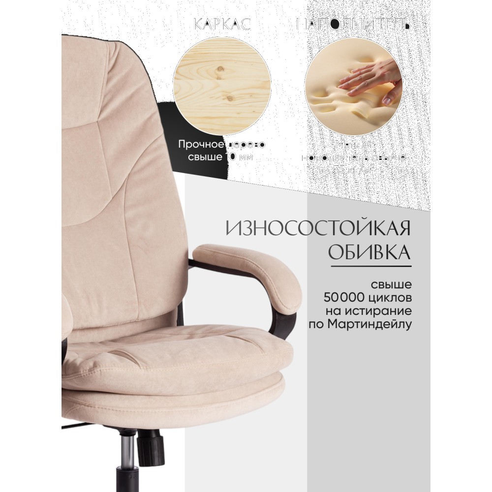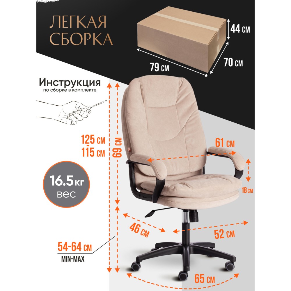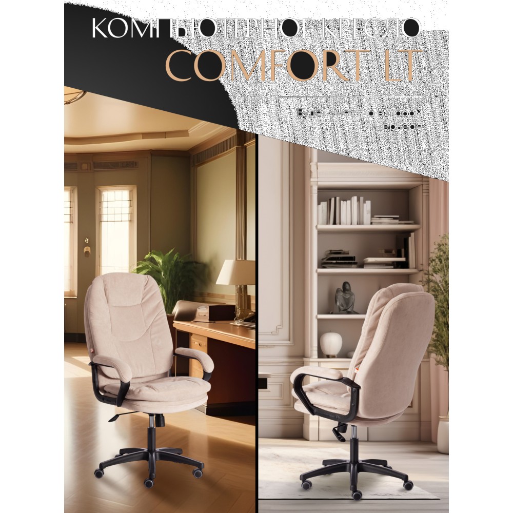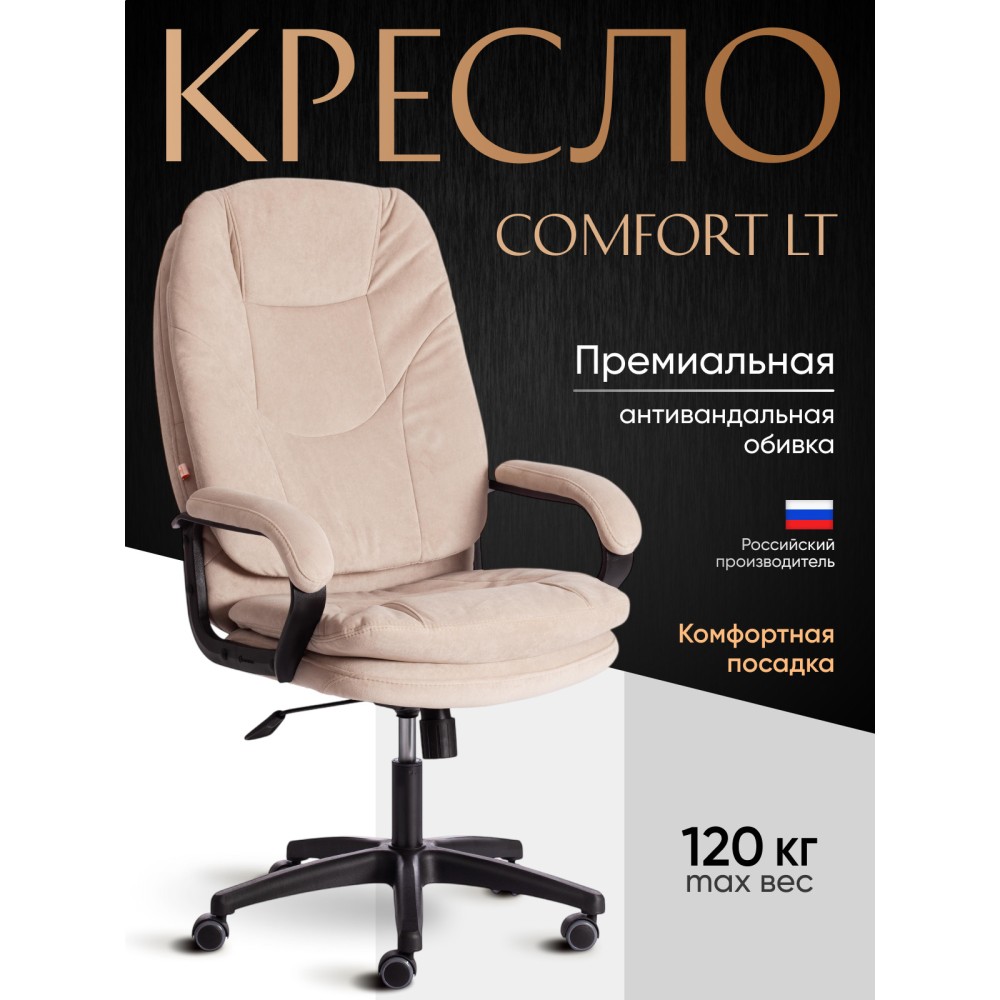 Оригинальное компьютерное кресло COMFORT LT (22) из коллекции OFFICE – удачное сочетание уюта, функциональности и элегантности. Модель будет прекрасно смотреться в рабочем кабинете, в комнате подростка или в зале для переговоров. Каркас выполнен из надежной и гипоаллергенной фанеры толщиной более 10 мм, имеющей отличные эксплуатационные качества. Сиденье с мягким наполнителем из пенополиуретана (до 35 кг/м2) стандартной плотности не деформируется, пропускает воздух. Кресло регулируется по высоте. Механизм качания с фиксацией в одном положении поможет расслабиться и принять удобную позу. Благодаря пластиковой крестовине офисное кресло устойчиво и имеет небольшой вес. Фиксированные подлокотники с мягкими накладками, эргономичная спинка, вместительное сиденье сделают ваше времяпрепровождение за компьютером максимально комфортным. Полиуретановые ролики с прорезиненными вставками не повреждают напольную поверхность, не оставляют следов на паркете и ламинате. Ролики и крестовина в креслах бренда TETCHAIR соответствуют стандарту BIFMA. Во всех креслах бренда TETCHAIR используются газлифты 3 класса, он способен выдерживать вес до 120 кг. Компьютерное кресло изготавливается из экокожи и флока. Обивка из высокопрочной износостойкой экокожи долговечна, не требует сложного ухода, сохраняет свой первоначальный внешний вид долгое время. Флок – красивый, практичный, отталкивающий воду материал. Экокожа, используемая при изготовлении кресла, выдерживает до 50 000 циклов на истирание по Мартиндейлу, ткань флок также выдерживает до 50 000 циклов, ткань велюр выдерживает до 60 000 циклов. Ткани с прочностью более 35 000 циклов являются самыми долговечными. Мебель, в которой используются такие ткани можно использовать не только дома но и в ресторанах, салонах красоты, приемных. Привлекательная модель COMFORT LT (22) представлена в коричневом, черном, бежевом, сером, розовом и лавандовом цветах. Офисное кресло станет отличным решением для вашего интерьера, будет смотреться презентабельно и элегантно в любой обстановке. Модель очень проста в сборке, инструкция по сборке прилагается. Максимальная нагрузка 120 кг.