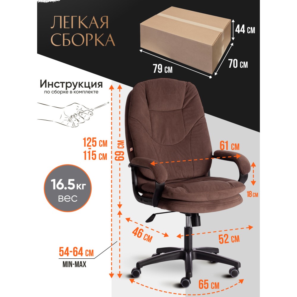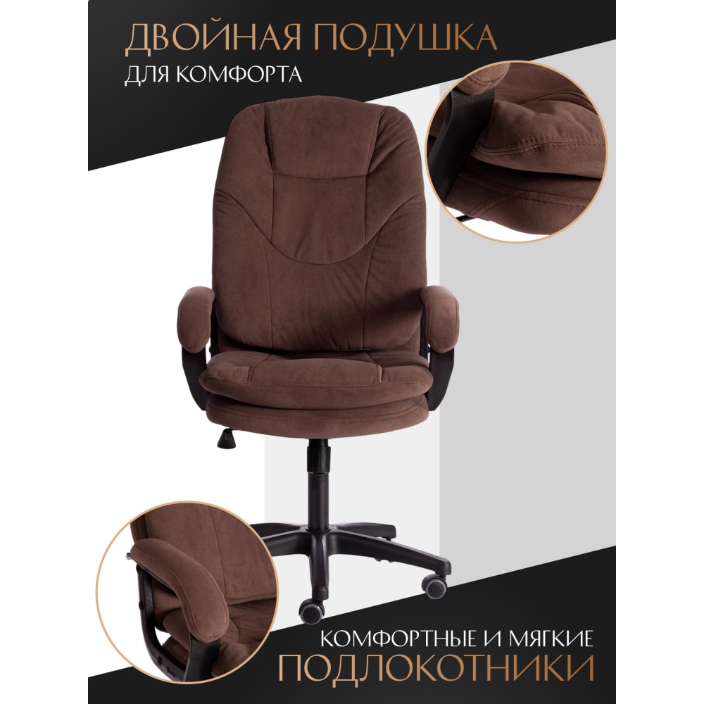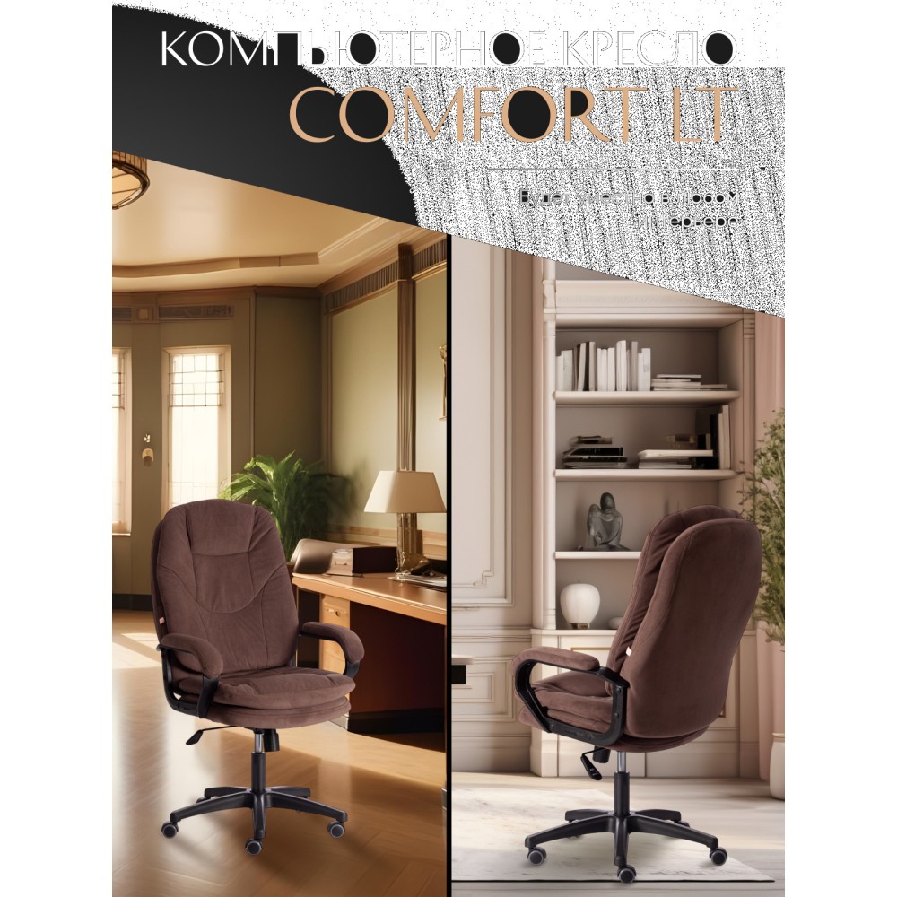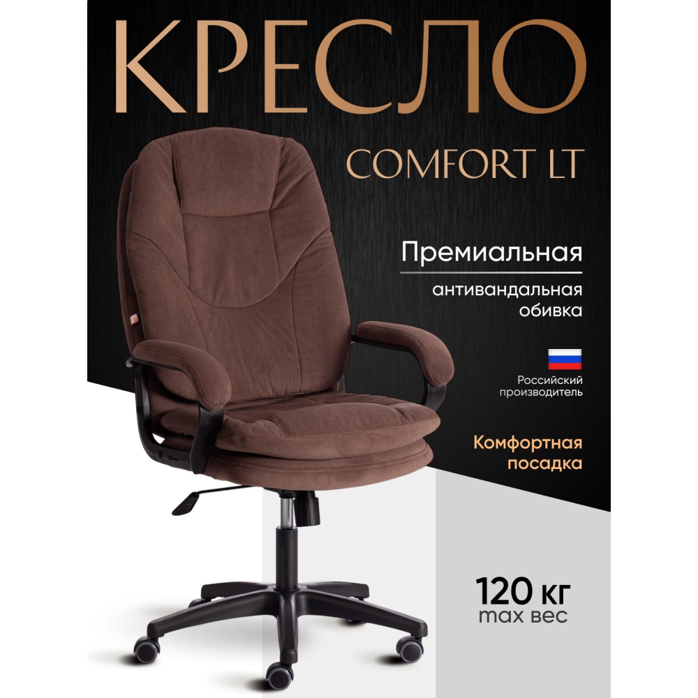 Оригинальное компьютерное кресло COMFORT LT (22) из коллекции OFFICE – удачное сочетание уюта, функциональности и элегантности. Модель будет прекрасно смотреться в рабочем кабинете, в комнате подростка или в зале для переговоров. Каркас выполнен из надежной и гипоаллергенной фанеры толщиной более 10 мм, имеющей отличные эксплуатационные качества. Сиденье с мягким наполнителем из пенополиуретана (до 35 кг/м2) стандартной плотности не деформируется, пропускает воздух. Кресло регулируется по высоте. Механизм качания с фиксацией в одном положении поможет расслабиться и принять удобную позу. Благодаря пластиковой крестовине офисное кресло устойчиво и имеет небольшой вес. Фиксированные подлокотники с мягкими накладками, эргономичная спинка, вместительное сиденье сделают ваше времяпрепровождение за компьютером максимально комфортным. Полиуретановые ролики с прорезиненными вставками не повреждают напольную поверхность, не оставляют следов на паркете и ламинате. Ролики и крестовина в креслах бренда TETCHAIR соответствуют стандарту BIFMA. Во всех креслах бренда TETCHAIR используются газлифты 3 класса, он способен выдерживать вес до 120 кг. Компьютерное кресло изготавливается из экокожи и флока. Обивка из высокопрочной износостойкой экокожи долговечна, не требует сложного ухода, сохраняет свой первоначальный внешний вид долгое время. Флок – красивый, практичный, отталкивающий воду материал. Экокожа, используемая при изготовлении кресла, выдерживает до 50 000 циклов на истирание по Мартиндейлу, ткань флок также выдерживает до 50 000 циклов, ткань велюр выдерживает до 60 000 циклов. Ткани с прочностью более 35 000 циклов являются самыми долговечными. Мебель, в которой используются такие ткани можно использовать не только дома но и в ресторанах, салонах красоты, приемных. Привлекательная модель COMFORT LT (22) представлена в коричневом, черном, бежевом, сером, розовом и лавандовом цветах. Офисное кресло станет отличным решением для вашего интерьера, будет смотреться презентабельно и элегантно в любой обстановке. Модель очень проста в сборке, инструкция по сборке прилагается. Максимальная нагрузка 120 кг.