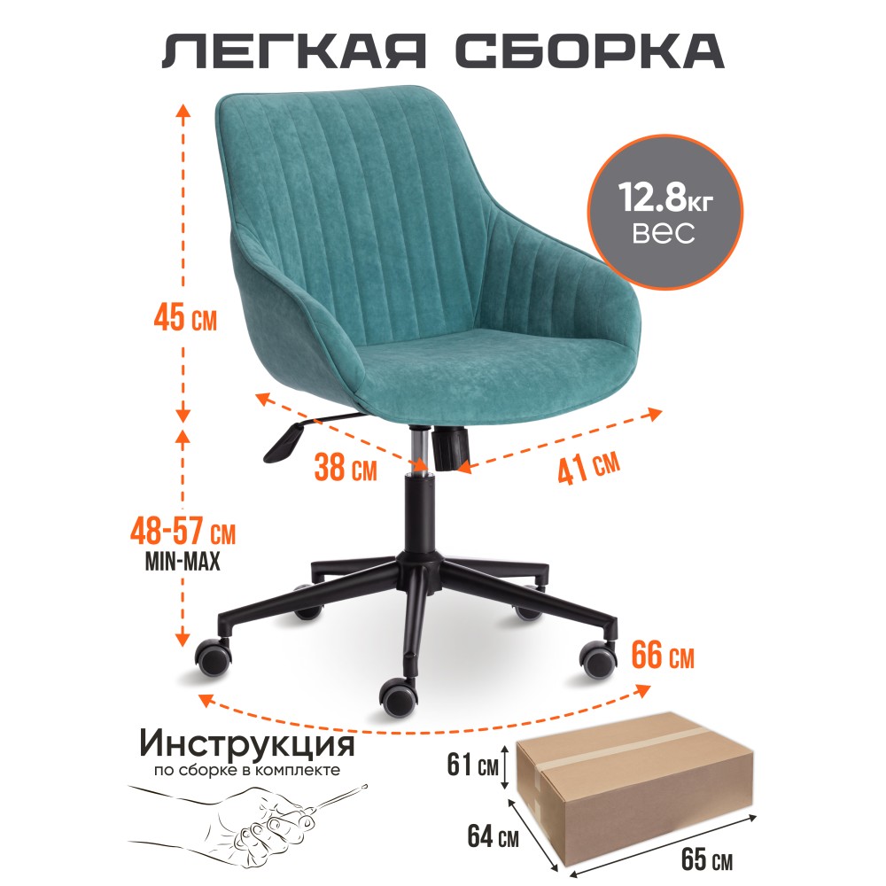 Уникальное компьютерное кресло DUBLIN из коллекции OFFICE добавит интерьеру легкость, грациозность и утонченность. Изысканный дизайн, роскошный внешний вид и функциональность позволят использовать модель в любом рабочем кабинете. Каркас модели изготовлен из фанеры толщиной более 10 мм. Такой материал обладает отличными эксплуатационными качествами, прочен и долговечен. Сиденье и спинка кресла с мягким наполнителем из пенополиуретана (до 35 кг/м2) стандартной плотности не деформируются со временем, не накапливают пыль, хорошо пропускают воздух и отводят влагу, имеют долгий срок службы. Регулировка высоты и наклона с фиксацией в одном положении помогут расслабиться, а также принять удобную позу во время работы. Жесткость механизма качания настраивается при помощи специального барабана. Черная металлическая крестовина устойчива, надежна, выглядит стильно и привлекательно. Бесшумные ролики из полиуретана с прорезиненными вставками не царапают напольное покрытие и подходят для использования на паркете и ламинате. Ролики и крестовина в креслах бренда TETCHAIR соответствуют стандарту BIFMA. Во всех креслах бренда TETCHAIR используются газлифты 3 класса, он способен выдерживать вес до 120 кг. Необычная декоративная стежка на спинке офисного кресла придает изделию особый шарм и оригинальность. Обивка из велюра износостойка, прочна, проста в уходе, приятна на ощупь, сохраняет свой первоначальный вид на протяжении длительного времени. Ткань велюр , используемая при изготовлении кресла, выдерживает до 60 000 циклов на истирание по Мартиндейлу. Ткани с прочностью более 35 000 циклов являются самыми долговечными. Элегантная модель DUBLIN представлена в нескольких цветовых вариантах: синем, зеленом, горчичном, сером и бежевом. Офисное кресло поставляется в разобранном виде. Необходима простая сборка по прилагаемой инструкции. Максимальная нагрузка 120 кг.