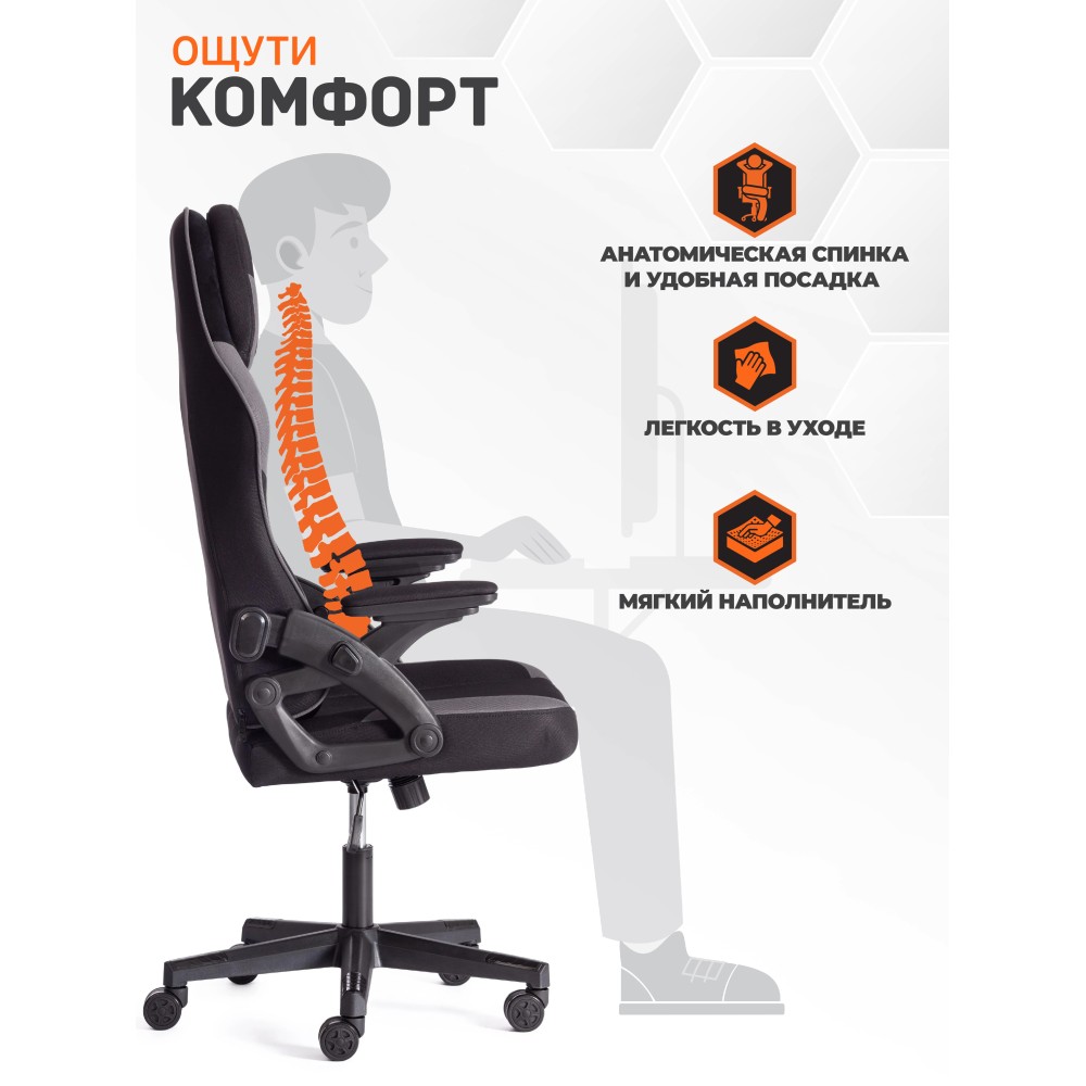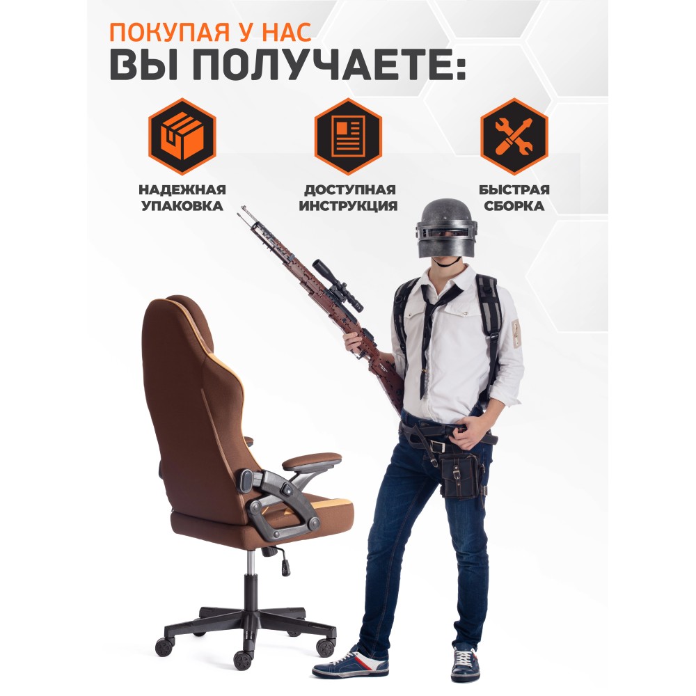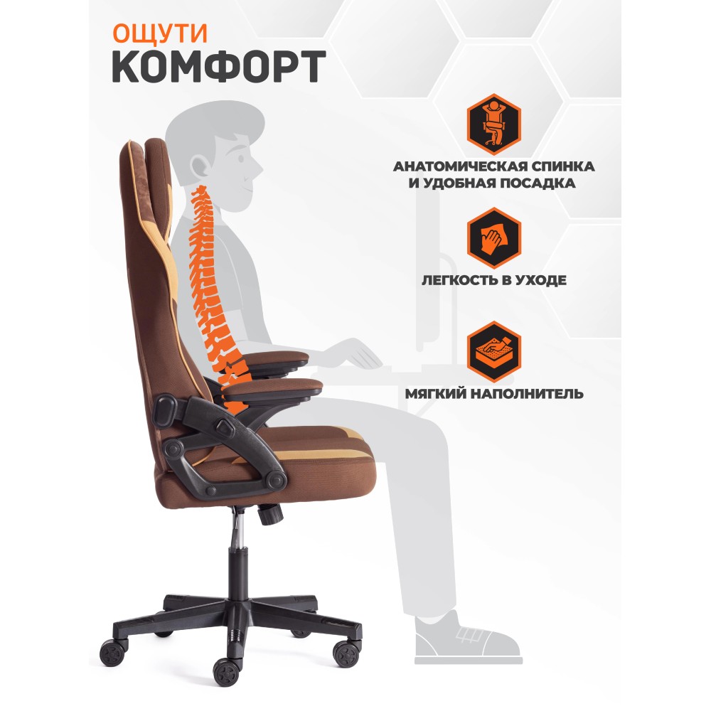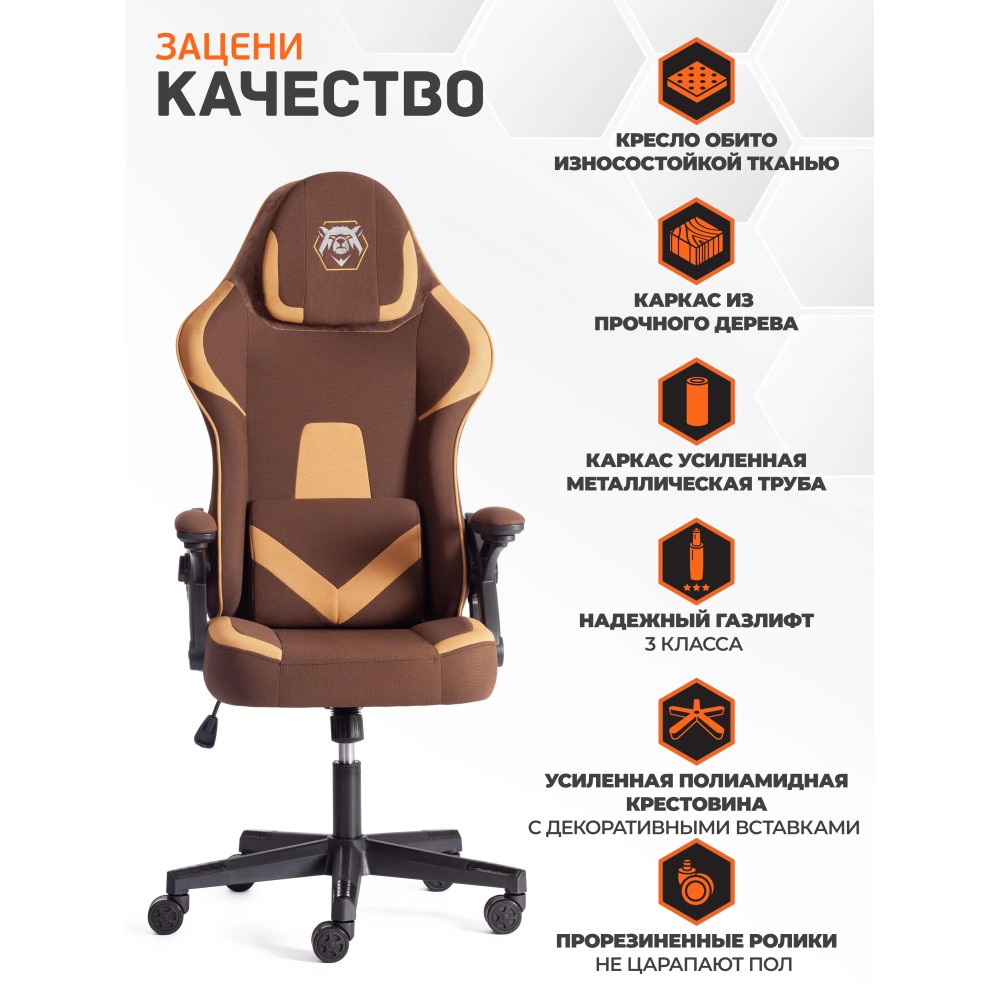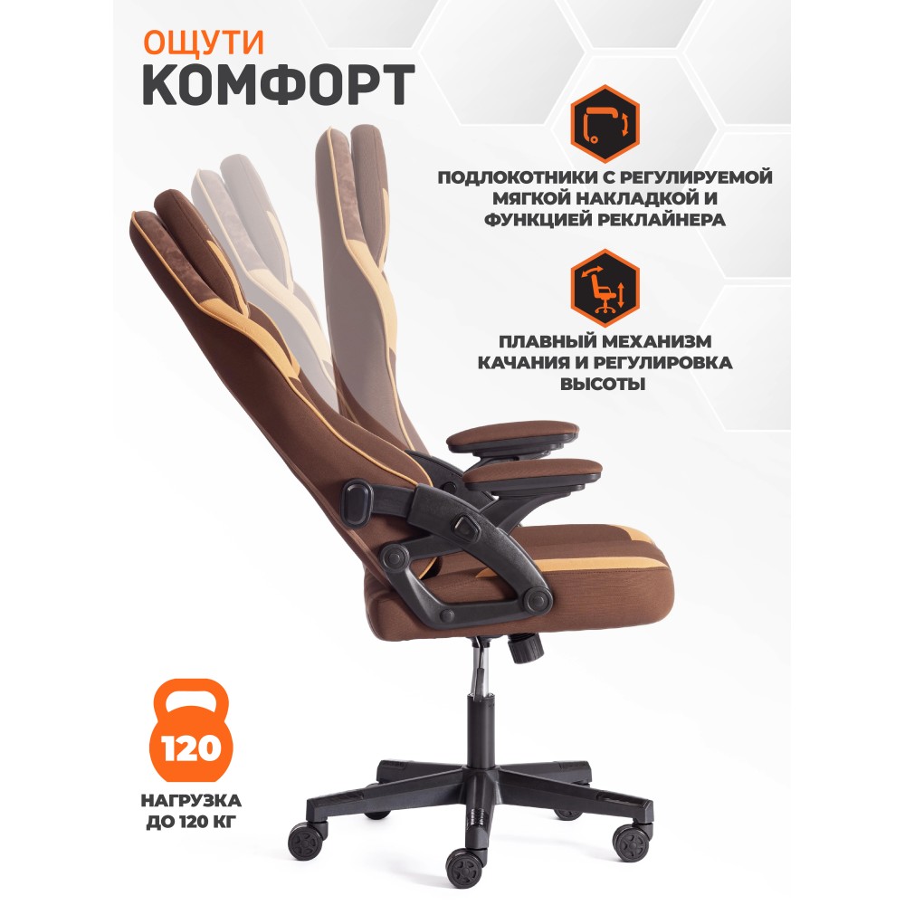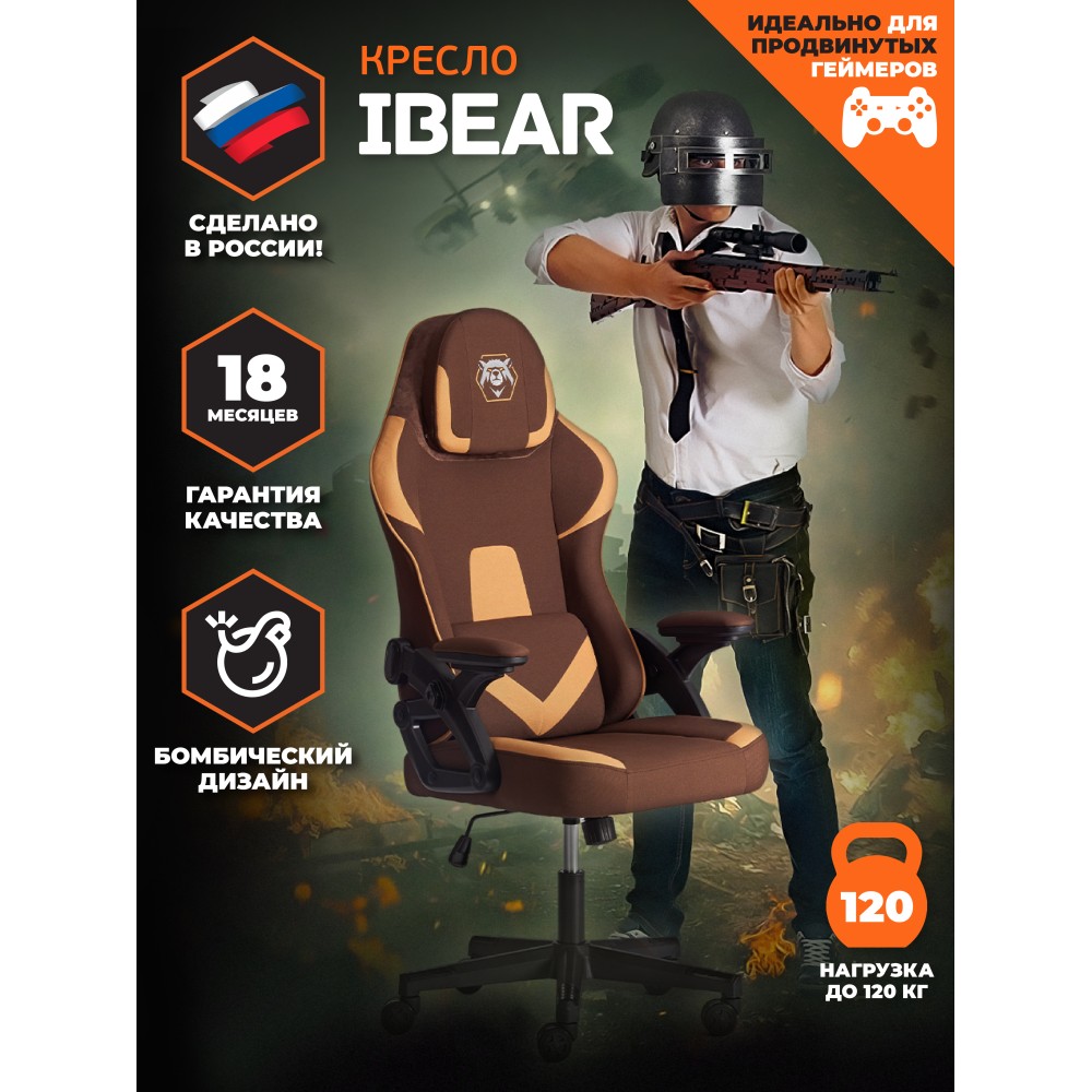 Компьютерное кресло iBear - идеальное сочетание привлекательности, эргономичности и функциональности. Стильная модель будет удачно смотреться как в офисе, так и в рабочем кабинете вашего дома. 5-лучевая крестовина диаметром 650 мм устойчива, прочна и имеет долгий срок службы. Анатомическая спинка с каркасом из металлической трубы толщиной 1.2 мм и наполнителем из пенополиуретана плотностью 25 кг/м3 легко подстраивается под контуры тела, не деформируется со временем. Сиденье изготовлено из многослойной фанеры толщиной 12 мм и пенополиуретанового наполнителя с внешним слоем не менее 25 кг/м3 и внутренним слоем не менее 70 кг/м3. Компьютерное кресло обито износостойкой тканью коричнево-бежевого цвета, выдерживающей 20000 циклов на истирание по Мартиндейлу. Такой материал не требует сложного ухода, обладает отличными эксплуатационными качествами. Модель оборудована надежным газлифтом 3 класса с ходом 80 мм. Подлокотники с регулируемой мягкой накладкой и функцией реклайнера, механизм изменения высоты сиденья и угла наклона до 15 градусов с возможностью фиксации в рабочем положении, настраиваемый подголовник и поясничная подушка позволят принять комфортную позу, снять напряжение с позвоночника. Высококачественные полиамидные ролики с геймерским дизайном диаметром 60 мм дополнительно прорезинены для предотвращения повреждения напольного покрытия, отлично подходят для использования на паркете и ламинате. Элегантное кресло iBear отличается повышенным комфортом, легкостью в уходе и презентабельным внешним видом, удивит владельца своей долговечностью, функциональностью и надежностью. Модель поставляется в разобранном виде. Необходима простая сборка по прилагаемой инструкции. Максимальная нагрузка 120 кг.