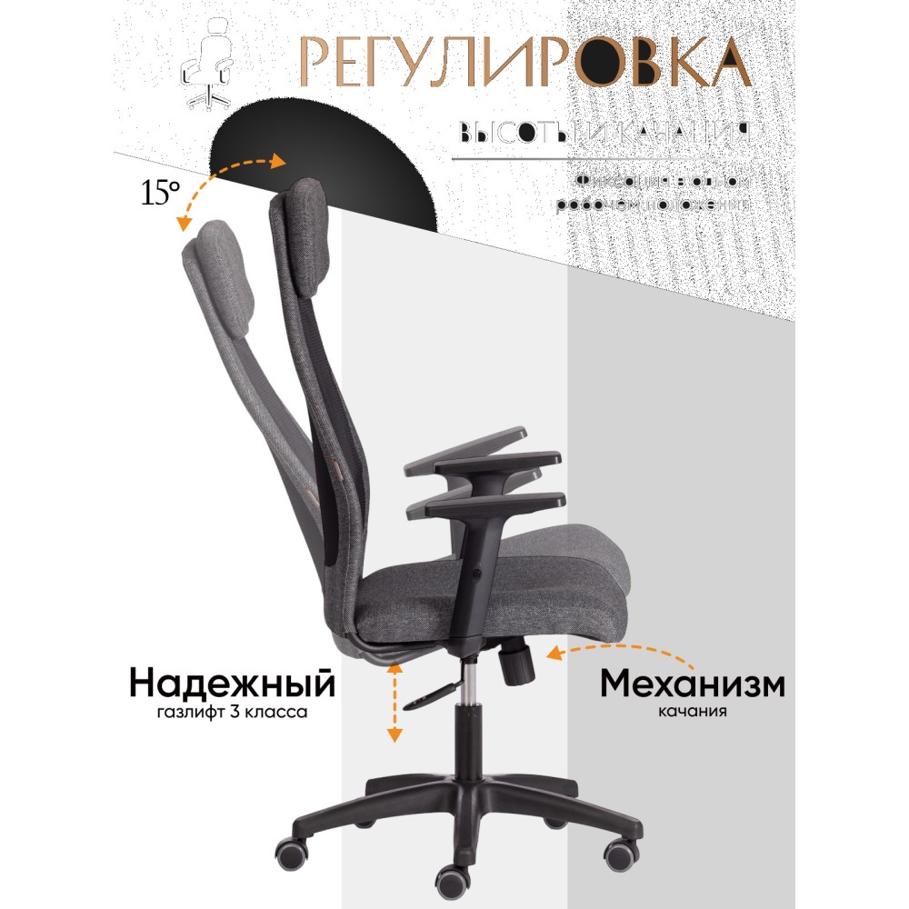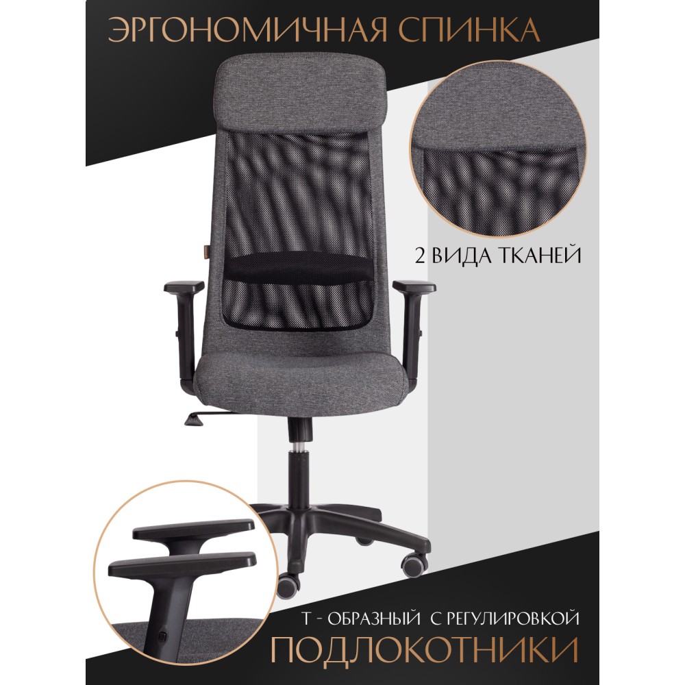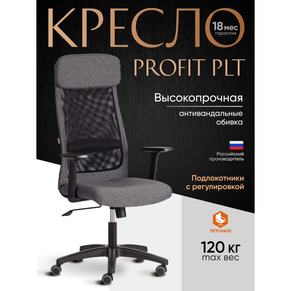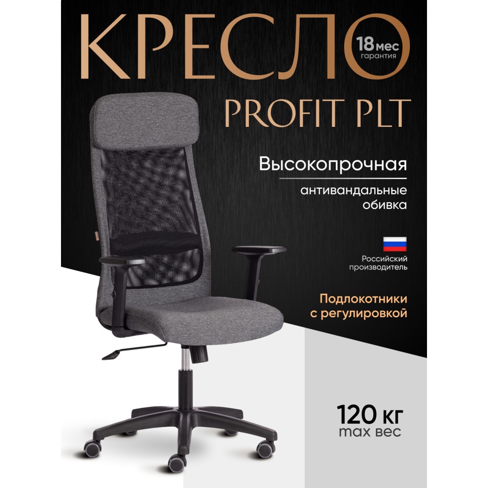 Компьютерное кресло PROFIT PLT удачно сочетает в себе черты функциональности, практичности и привлекательности. Современный дизайн модели позволит использовать ее в любом интерьере, как в офисе так и в домашнем кабинете. Надежная 5-лучевая полиамидная крестовина черного цвета диаметром 650 мм устойчива, прочна и имеет долгий срок службы. Кресло оснащено газлифтом 3 класса с ходом 100 мм, обеспечивающим подъем сиденья на нужную высоту. Высококачественные ролики дополнительно прорезинены для предотвращения повреждения напольного покрытия. Такие колесики отлично подходят для использования на паркете и ламинате. Диаметр штока - 11 мм. Подлокотники Т-образные с регулировкой по высоте, накладка из текстурированно пластика, механизм регулировки сиденья и угла наклона до 15 градусов, интегрированный в чехол мягкий подголовник помогут принять комфортную позу и снять напряжение с позвоночника. Компьютерное кресло обито прочной рогожкой плотностью 270 г/м2., однослойной сеткой плотностью 280 г/м2 которая обеспечит вентиляцию в летний период времени.Ткань, используемая при изготовлении кресла, выдерживает до 50 000 циклов на истирание по Мартиндейлу, сетка до 25 000 циклов. Сиденье и спинка с мягким наполнителем из пенополиуретана плотностью не менее 30 кг/м3 обладают долгим сроком службы, не меняют форму со временем, пропускают воздух, отводят влагу и не накапливают пыль. Оригинальное сочетание черного и серого цветов выглядит стильно и привлекательно. Компьютерное кресло PROFIT PLT удобно, долговечно и функционально, не требует специального ухода, будет радовать вас своим первоначальным видом на протяжении длительного времени. Модель поставляется в разобранном виде. Необходима простая сборка по прилагаемой инструкции. Максимальная нагрузка 120 кг