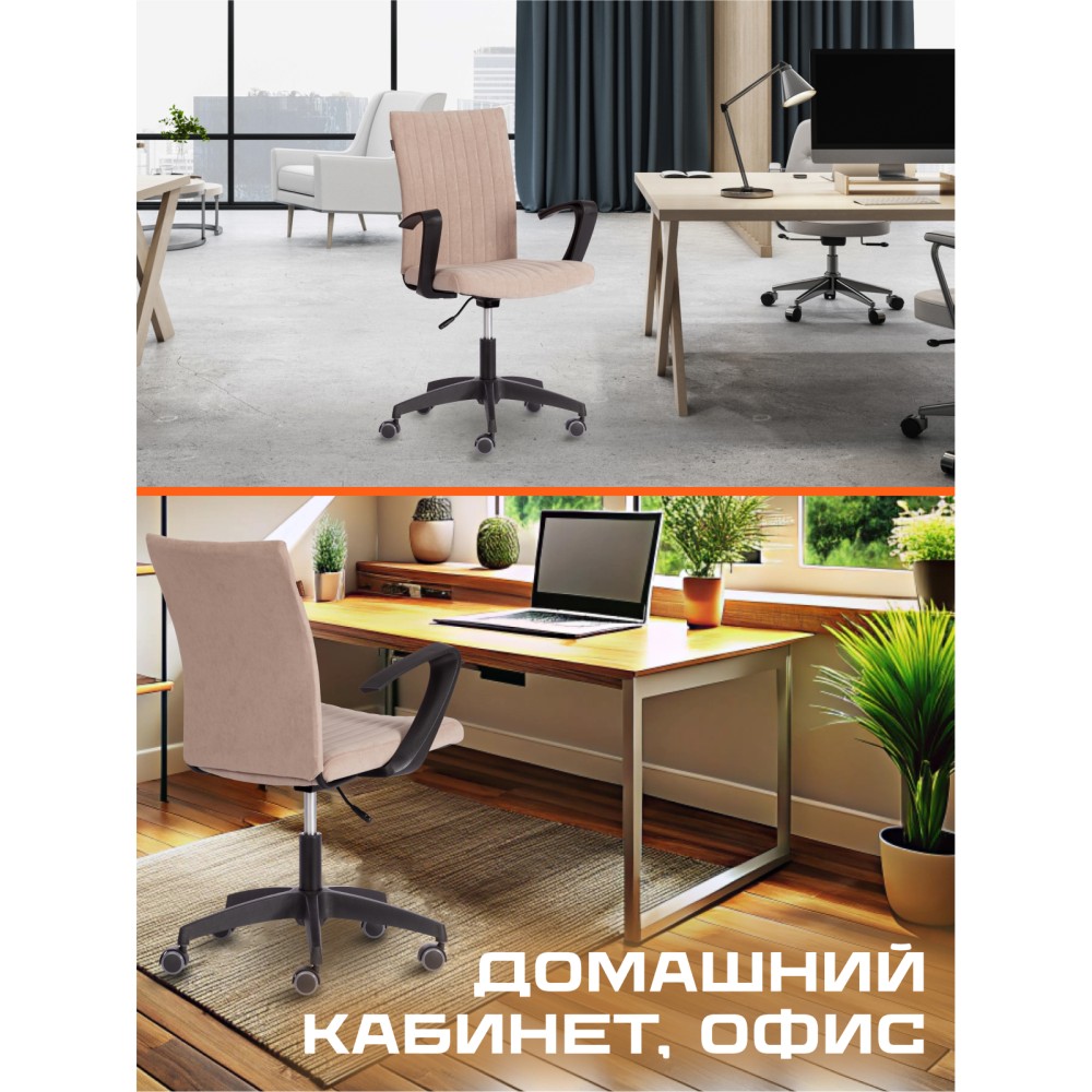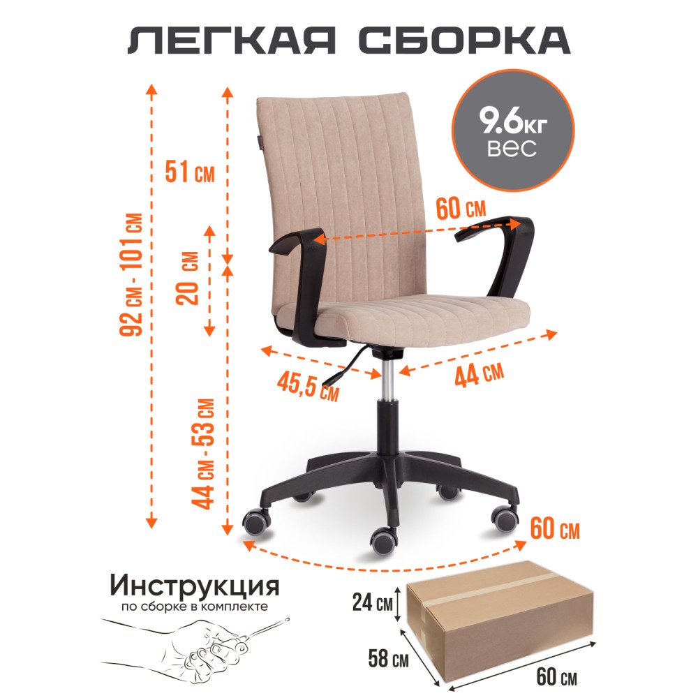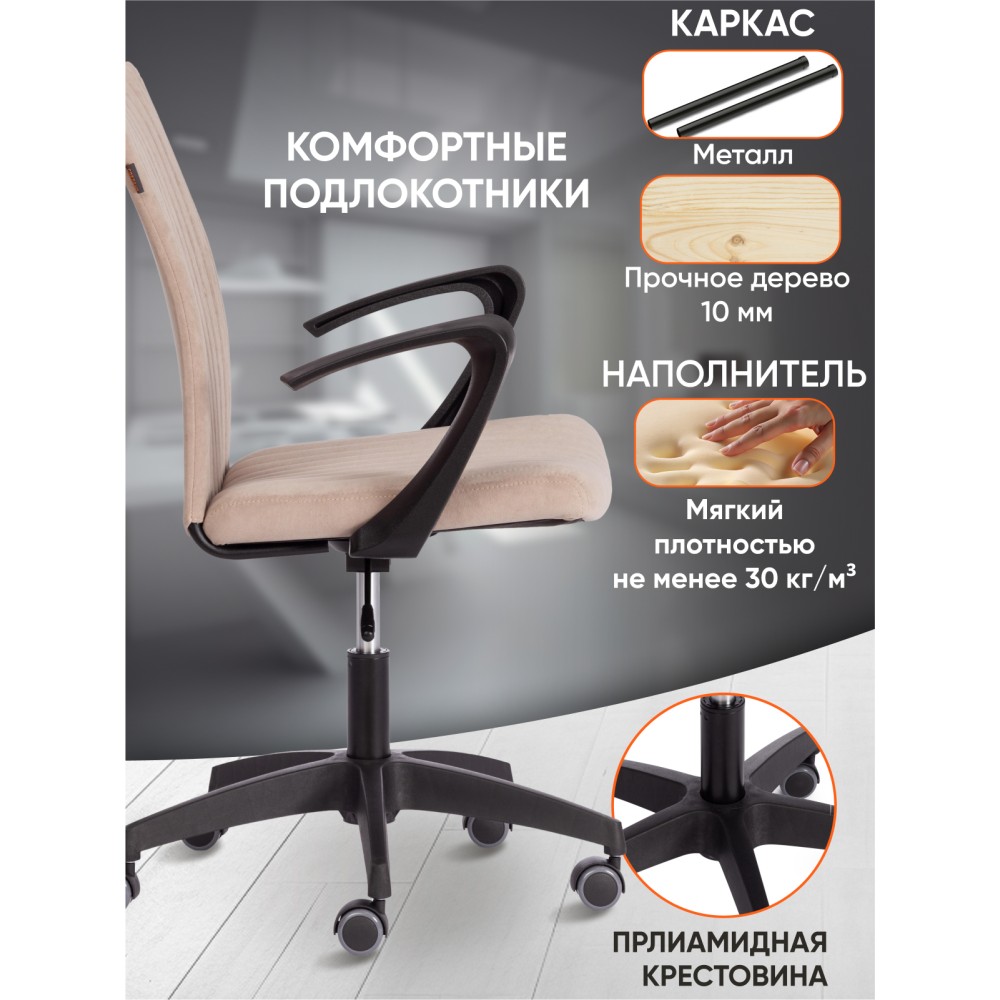 Практичное компьютерное кресло SPARK идеально подойдет для создания комфортного рабочего пространства в доме или офисе. 5-лучевая полиамидная крестовина диаметром 600 мм надежна, прочна, долговечна. Компьютерное кресло регулируется по высоте при помощи газлифта 3 класса с ходом 100 мм, что позволяет настроить его исходя из анатомических особенностей владельца. Высококачественные ролики дополнительно прорезинены для предотвращения повреждения напольного покрытия. Отлично подходят для использования на паркете и ламинате. Диаметр штока ролика – 11 мм. Эргономичная спинка и удобное сиденье с мягким наполнителем из пенополиуретана плотностью не менее 30 кг/м3 легко подстраиваются под контуры тела, не деформируются со временем. Фиксированные пластиковые подлокотники помогут снизить нагрузку на шею и спину, уменьшат усталость и напряжение в позвоночнике, повысят производительность на рабочем месте. Оригинальная модель обита флоком с водоотталкивающей пропиткой 320г/м2. Такой материал не требует сложного ухода, устойчив к механическим повреждениям, приятен на ощупь. Ткань, используемая при изготовлении кресла, выдерживает до 50 000 циклов на истирание по Мартиндейлу. Стильное компьютерное кресло бежевого цвета отличается элегантностью, практичностью и привлекательностью, удивит владельца своей функциональностью, надежностью и долгим сроком службы. Модель поставляется в разобранном виде. Необходима простая сборка по прилагаемой инструкции. Максимальная нагрузка 100 кг