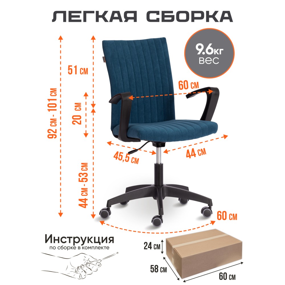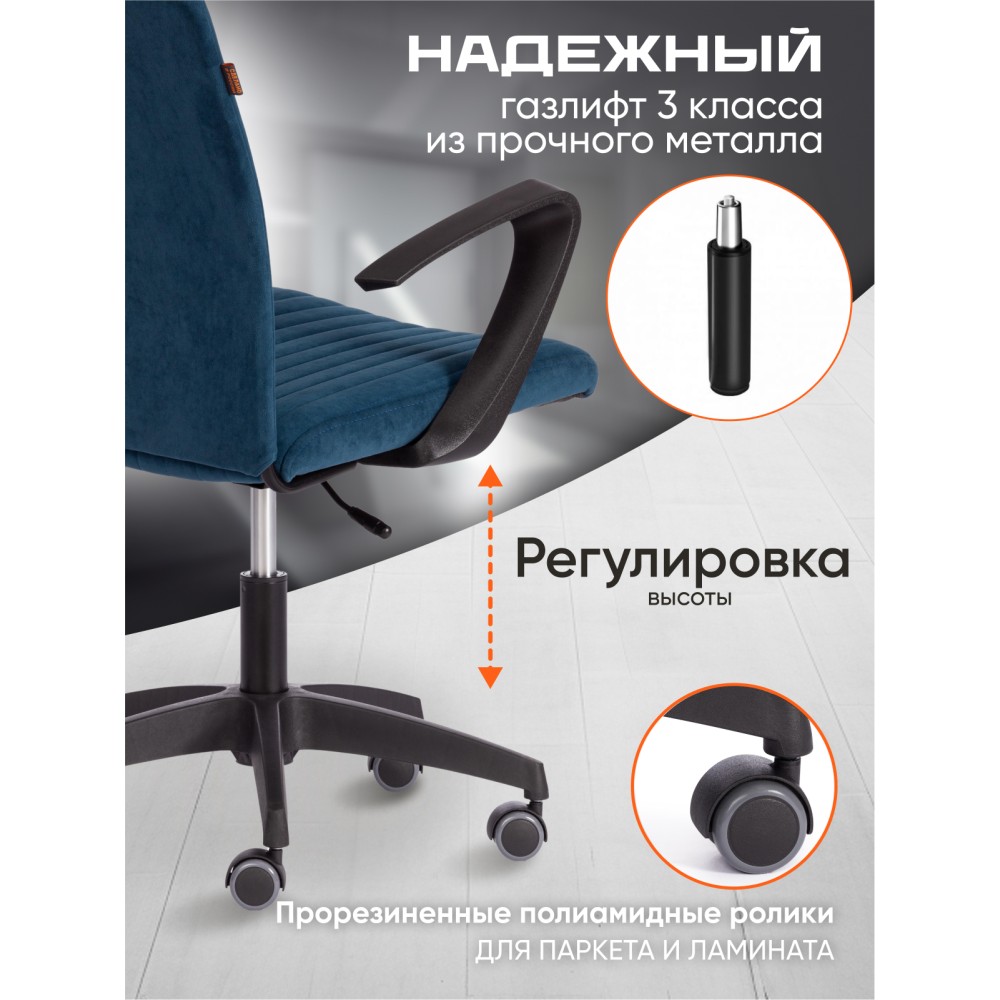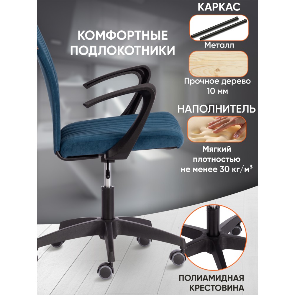 Практичное компьютерное кресло SPARK идеально подойдет для создания комфортного рабочего пространства в доме или офисе. 5-лучевая полиамидная крестовина диаметром 600 мм надежна, прочна, долговечна. Компьютерное кресло регулируется по высоте при помощи газлифта 3 класса с ходом 100 мм, что позволяет настроить его исходя из анатомических особенностей владельца. Высококачественные ролики дополнительно прорезинены для предотвращения повреждения напольного покрытия. Отлично подходят для использования на паркете и ламинате. Диаметр штока ролика – 11 мм. Эргономичная спинка и удобное сиденье с мягким наполнителем из пенополиуретана плотностью не менее 30 кг/м3 легко подстраиваются под контуры тела, не деформируются со временем. Фиксированные пластиковые подлокотники помогут снизить нагрузку на шею и спину, уменьшат усталость и напряжение в позвоночнике, повысят производительность на рабочем месте. Оригинальная модель обита флоком с водоотталкивающей пропиткой 320г/м2. Такой материал не требует сложного ухода, устойчив к механическим повреждениям, приятен на ощупь. Ткань, используемая при изготовлении кресла, выдерживает до 50 000 циклов на истирание по Мартиндейлу. Стильное компьютерное кресло синего цвета отличается элегантностью, практичностью и привлекательностью, удивит владельца своей функциональностью, надежностью и долгим сроком службы. Модель поставляется в разобранном виде. Необходима простая сборка по прилагаемой инструкции. Максимальная нагрузка 100 кг