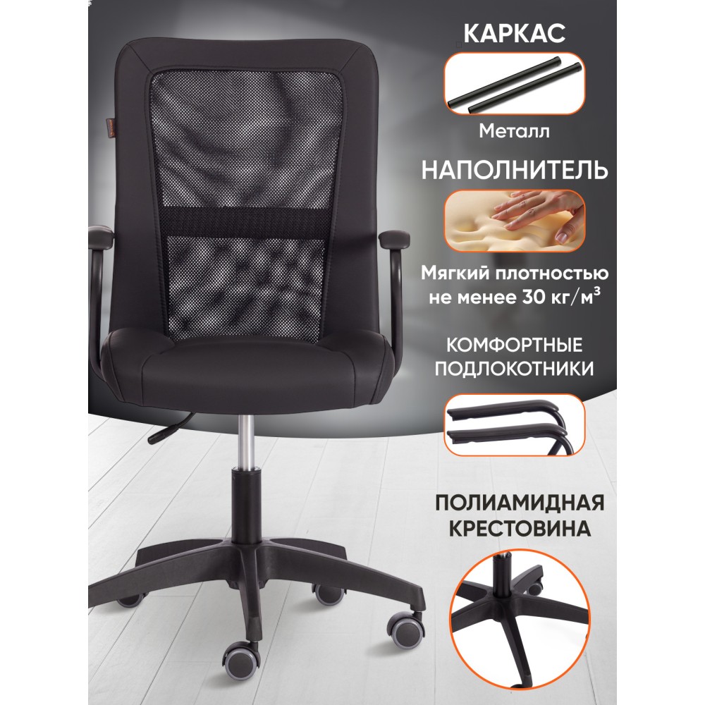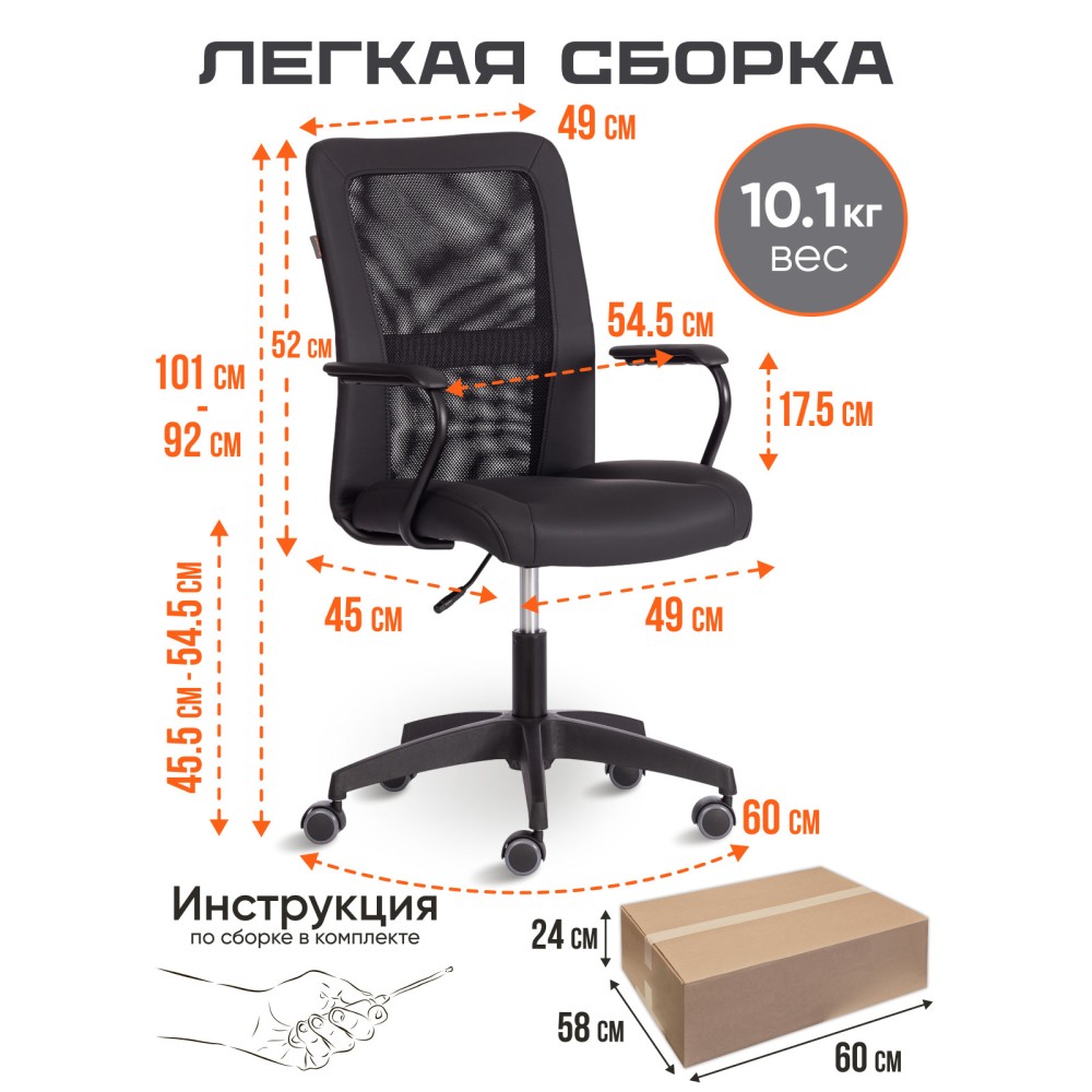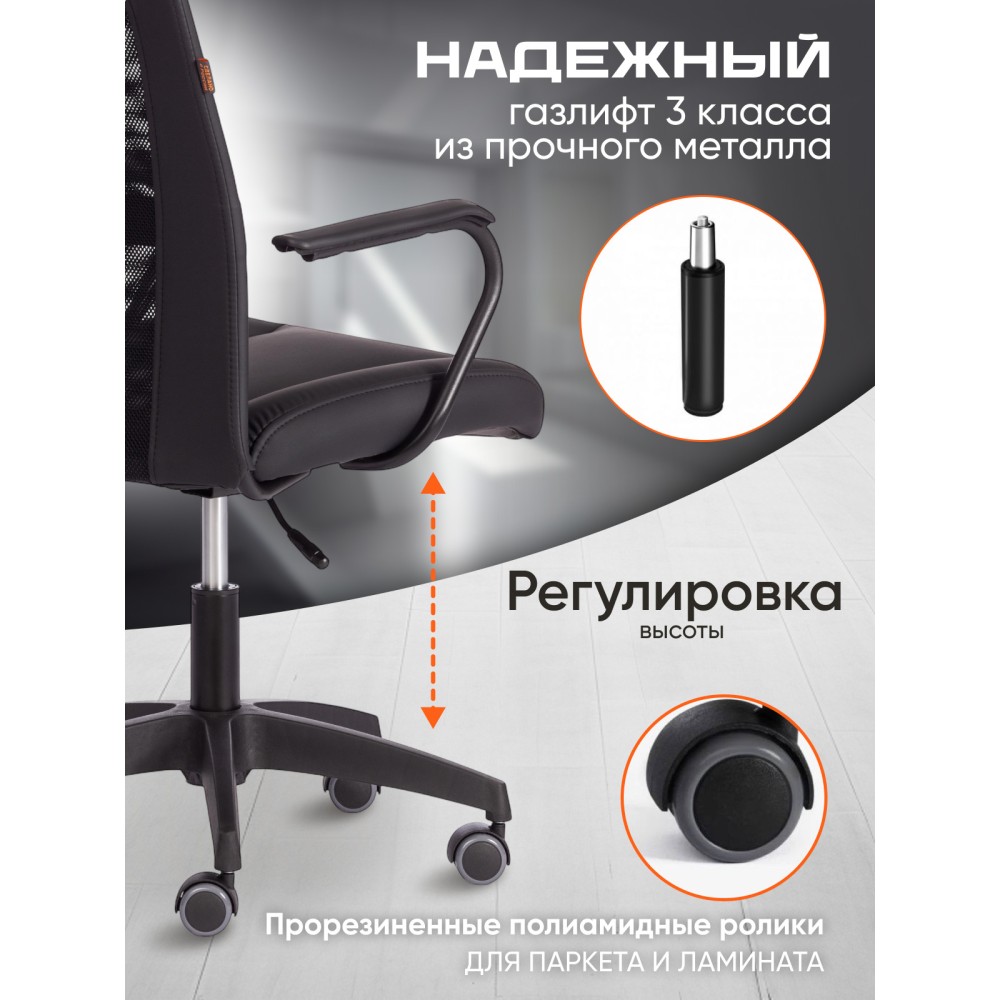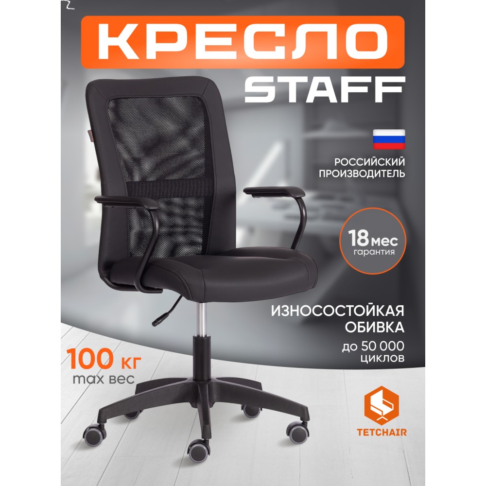 Оригинальное компьютерное кресло STAFF - идеальное решение для комфортной работы дома или в офисе. Каркас сиденья надежен, крепок, выполнен из многослойной фанеры толщиной не менее 10 мм.Для комфорта и долговременной эксплуатации в наполнении сиденья кресла используется ППУ плотностью не менее 30 кг/м3. Модель обита искусственной кожей ПВХ нового поколения, общая толщина рабочего слоя с подкладкой -1,2 мм. Это позволяет сохранить внешний вид обивки гораздо дольше, чем у многочисленных дешевых аналогов, где используется искусственная кожа толщиной 0.6-0.8 мм., выдерживает 50000 циклов на истирание по Мартиндейлу. Однослойная сетчатая обивка плотностью 280 г/м2 обеспечит вентиляцию и добавит комфорта в жаркое время года. Прочный каркас спинки с усилением изготовлен из металлической трубы диаметром 19 мм и стенкой толщиной 1,2 мм. Удобные подлокотники с пластиковой накладкой снизят напряжение в спине, помогут расслабиться при длительном времяпрепровождении за компьютером. Кресло регулируется по высоте. Механизм усилен скобой из стали толщиной 2,5 мм и способен выдержать нагрузку до 100 кг. Газлифт кресла от надежного и проверенного поставщика соответствует 3 классу стандарта DIN и имеет ход около 100 мм. Устойчивое основание модели выполнено в виде 5-лучевой полиамидной (по своей плотности материал близок к стали) крестовины. Ролики диаметром 50 мм, изготовленные из прорезиненного полиамида, бесшумны и не повреждают напольное покрытие. Благодаря своей функциональности и привлекательности компьютерное кресло STAFF черного цвета станет незаменимым предметом интерьера, прекрасно впишется в рабочий кабинет офиса или дома, удивит вас своей долговечностью, удобством и отличными эксплуатационными качествами. Модель поставляется в разобранном виде. Необходима простая сборка по прилагаемой инструкции.