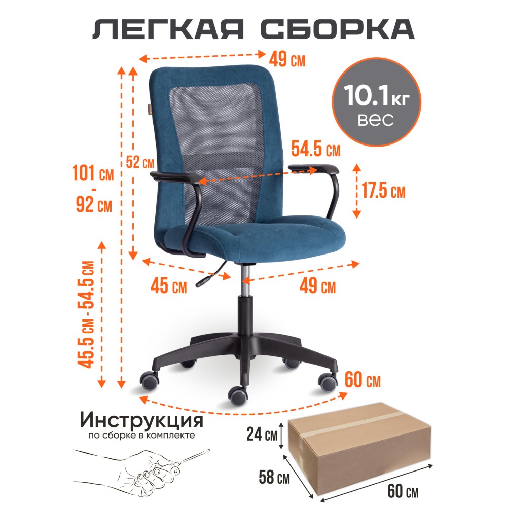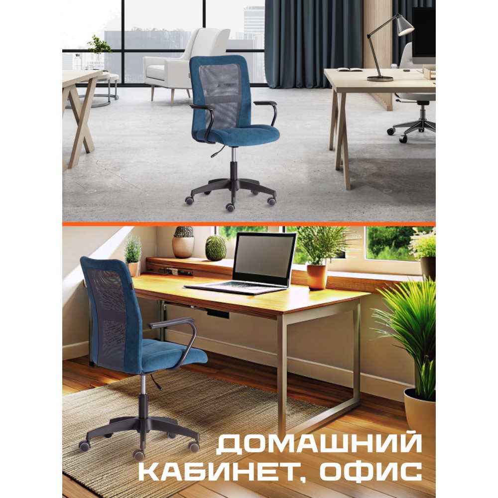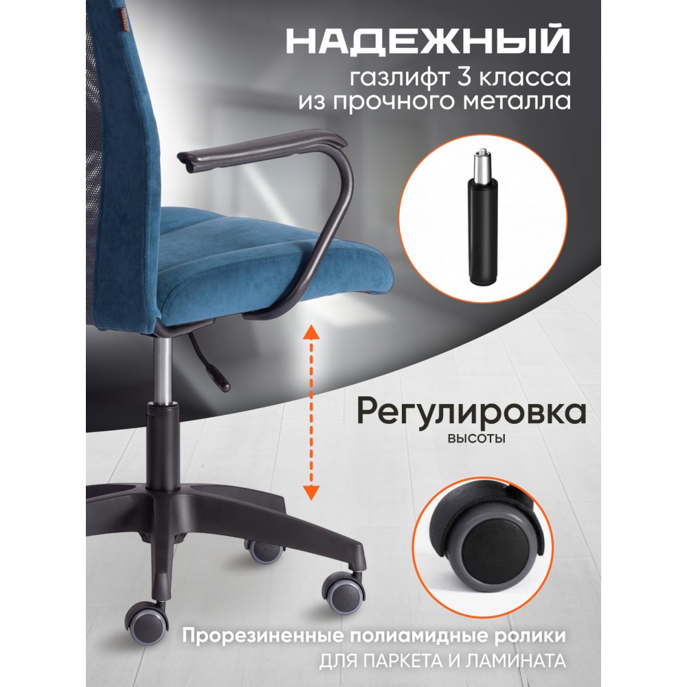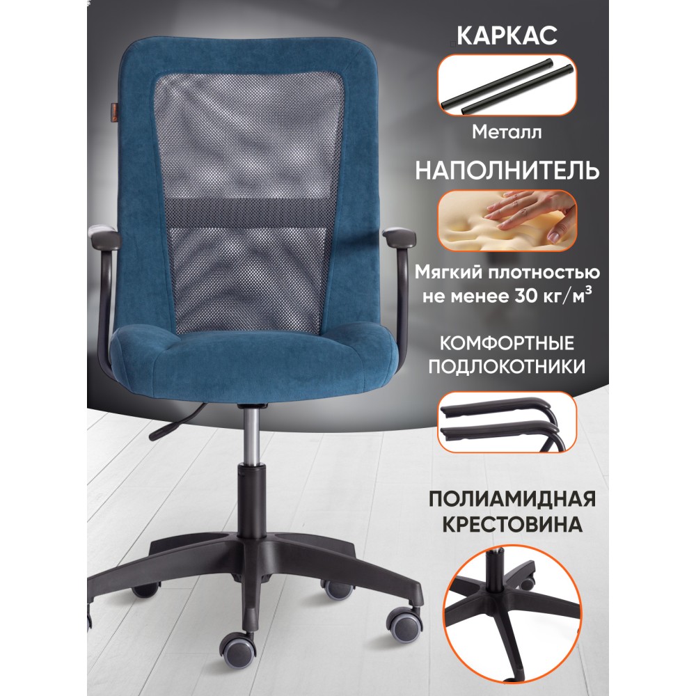 Оригинальное компьютерное кресло STAFF - идеальное решение для комфортной работы дома или в офисе. Каркас сиденья надежен, крепок, выполнен из многослойной фанеры толщиной не менее 10 мм. Для комфорта и долговременной эксплуатации в наполнении сиденья кресла используется ППУ плотностью не менее 30 кг/м3. Модель обита износостойким флоком с водоотталкивающей пропиткой. Такой материал не требует сложного ухода, долговечен, выдерживает 50000 циклов на истирание по Мартиндейлу, выглядит стильно и привлекательно. Однослойная сетчатая обивка серого цвета, плотностью 280 г/м2 обеспечит вентиляцию и добавит комфорта в жаркое время года. Прочный каркас спинки с усилением изготовлен из металлической трубы диаметром 19 мм и стенкой толщиной 1,2 мм. Удобные подлокотники с пластиковой накладкой снизят напряжение в спине, помогут расслабиться при длительном времяпрепровождении за компьютером. Кресло регулируется по высоте. Механизм усилен скобой из стали толщиной 2,5 мм и способен выдержать нагрузку до 100 кг. Газлифт кресла от надежного и проверенного поставщика соответствует 3 классу стандарта DIN и имеет ход около 100 мм. Устойчивое основание модели выполнено в виде 5-лучевой полиамидной (по своей плотности материал близок к стали) крестовины. Ролики диаметром 50 мм, изготовленные из прорезиненного полиамида, бесшумны и не повреждают напольное покрытие. Благодаря своей функциональности и привлекательности компьютерное кресло STAFF синего цвета станет незаменимым предметом интерьера, прекрасно впишется в рабочий кабинет офиса или дома, удивит вас своей долговечностью, удобством и отличными эксплуатационными качествами. Модель поставляется в разобранном виде. Необходима простая сборка по прилагаемой инструкции.