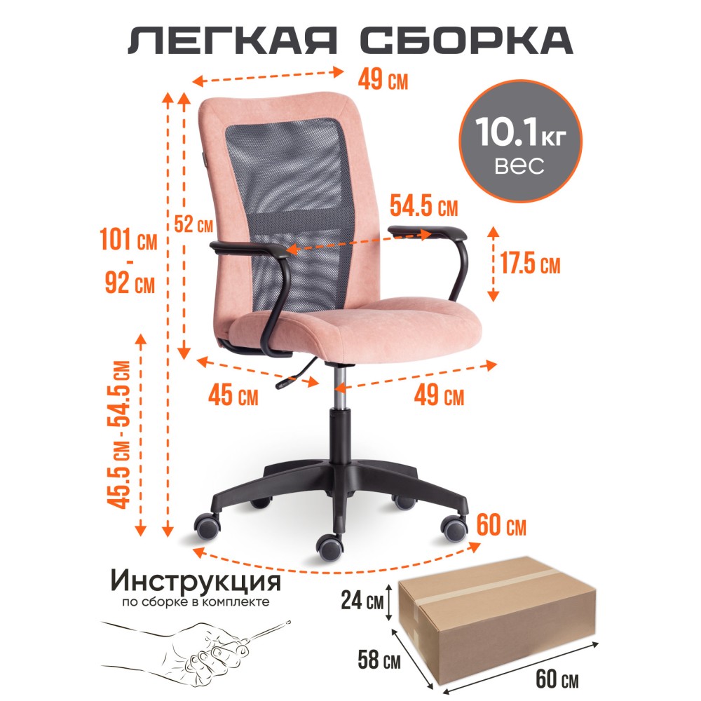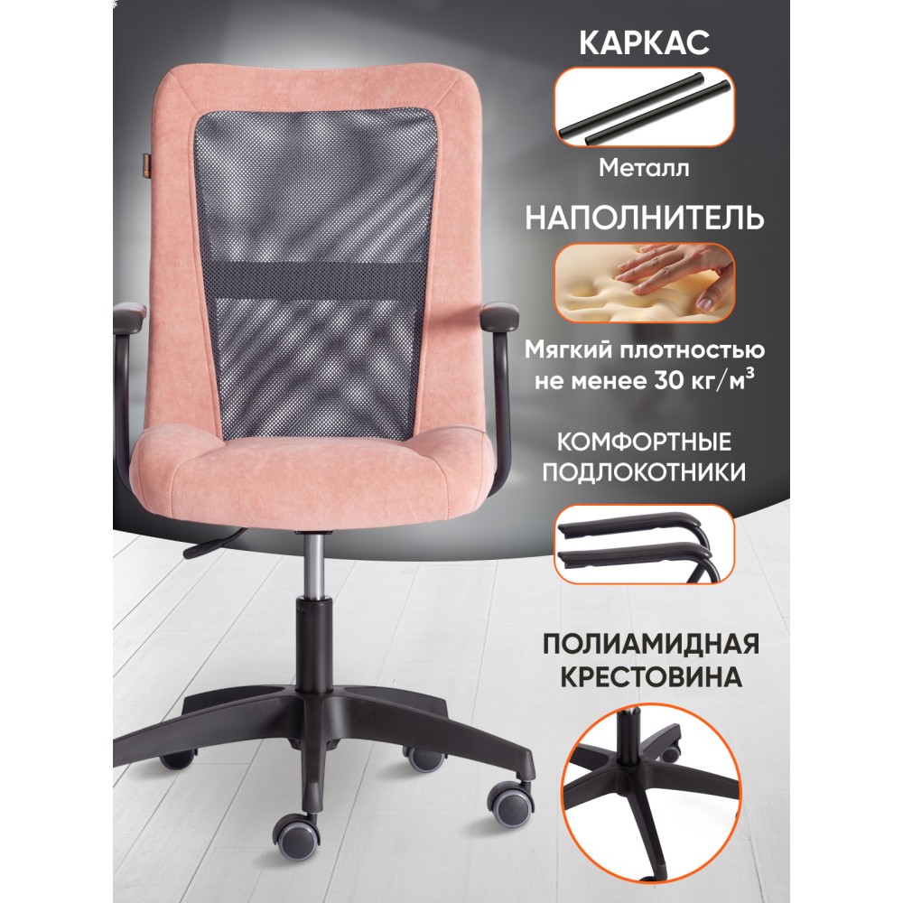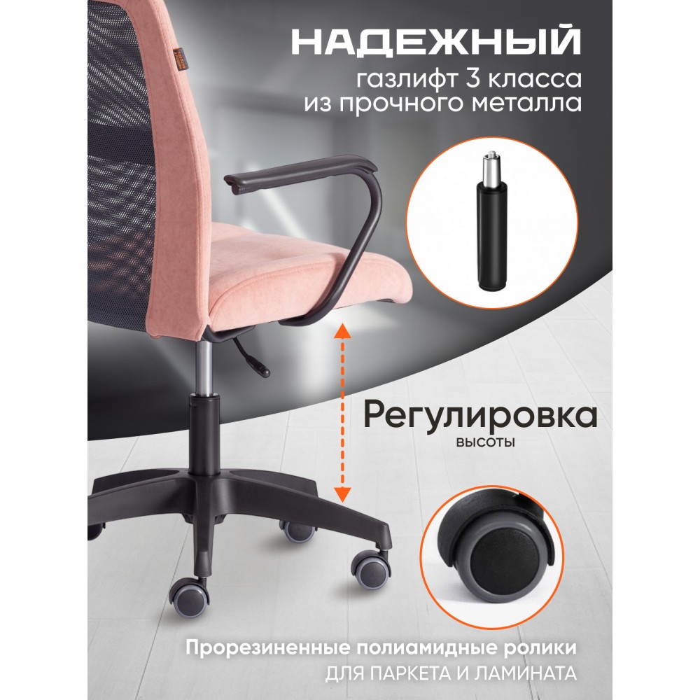Оригинальное компьютерное кресло STAFF - идеальное решение для комфортной работы дома или в офисе. Каркас сиденья надежен, крепок, выполнен из многослойной фанеры толщиной не менее 10 мм. Для комфорта и долговременной эксплуатации в наполнении сиденья кресла используется ППУ плотностью не менее 30 кг/м3. Модель обита износостойким флоком с водоотталкивающей пропиткой. Такой материал не требует сложного ухода, долговечен, выдерживает 50000 циклов на истирание по Мартиндейлу, выглядит стильно и привлекательно. Однослойная сетчатая обивка серого цвета, плотностью 280 г/м2 обеспечит вентиляцию и добавит комфорта в жаркое время года. Прочный каркас спинки с усилением изготовлен из металлической трубы диаметром 19 мм и стенкой толщиной 1,2 мм. Удобные подлокотники с пластиковой накладкой снизят напряжение в спине, помогут расслабиться при длительном времяпрепровождении за компьютером. Кресло регулируется по высоте. Механизм усилен скобой из стали толщиной 2,5 мм и способен выдержать нагрузку до 100 кг. Газлифт кресла от надежного и проверенного поставщика соответствует 3 классу стандарта DIN и имеет ход около 100 мм. Устойчивое основание модели выполнено в виде 5-лучевой полиамидной (по своей плотности материал близок к стали) крестовины. Ролики диаметром 50 мм, изготовленные из прорезиненного полиамида, бесшумны и не повреждают напольное покрытие. Благодаря своей функциональности и привлекательности компьютерное кресло STAFF розового цвета станет незаменимым предметом интерьера, прекрасно впишется в рабочий кабинет офиса или дома, удивит вас своей долговечностью, удобством и отличными эксплуатационными качествами. Модель поставляется в разобранном виде. Необходима простая сборка по прилагаемой инструкции.