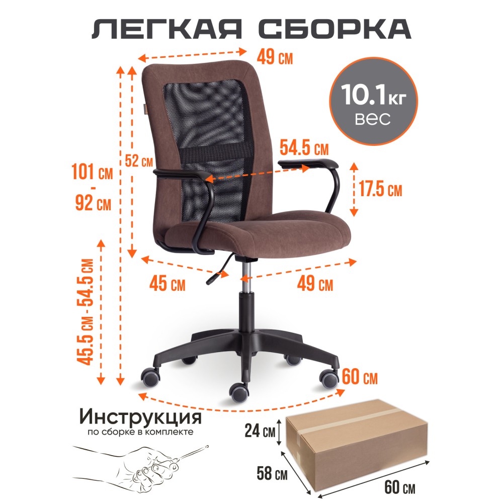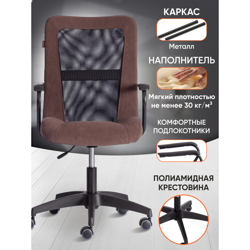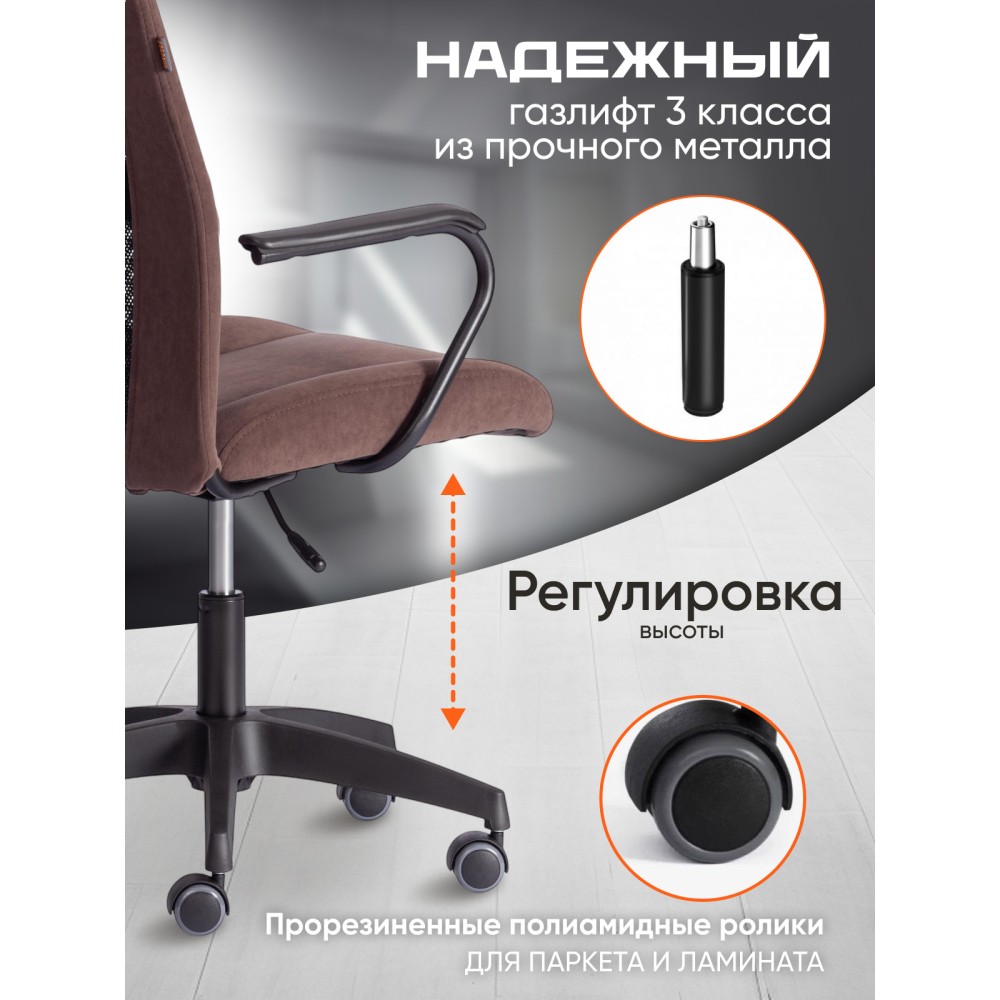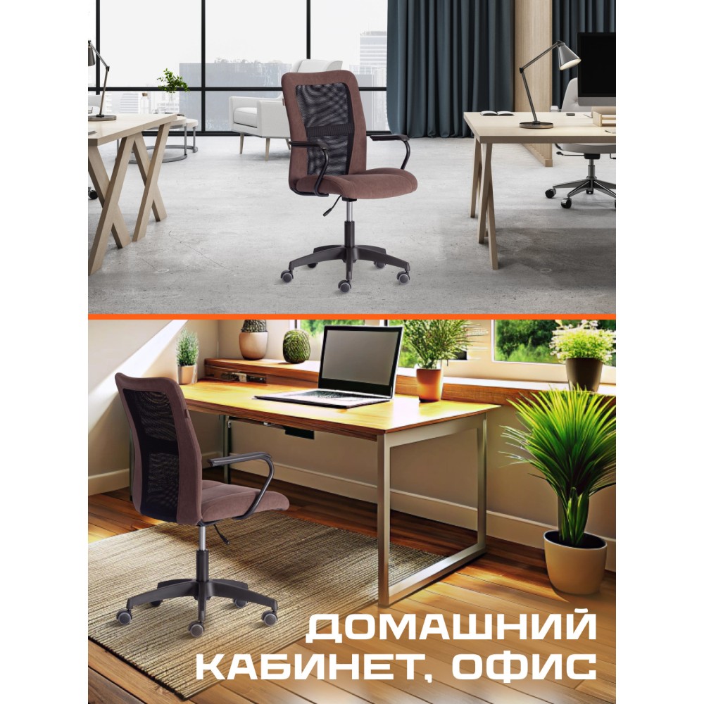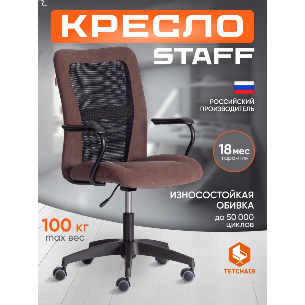Оригинальное компьютерное кресло STAFF - идеальное решение для комфортной работы дома или в офисе. Каркас сиденья надежен, крепок, выполнен из многослойной фанеры толщиной не менее 10 мм. Для комфорта и долговременной эксплуатации в наполнении сиденья кресла используется ППУ плотностью не менее 30 кг/м3. Модель обита износостойким флоком с водоотталкивающей пропиткой. Такой материал не требует сложного ухода, долговечен, выдерживает 50000 циклов на истирание по Мартиндейлу, выглядит стильно и привлекательно. Однослойная сетчатая обивка черного цвета, плотностью 280 г/м2 обеспечит вентиляцию и добавит комфорта в жаркое время года. Прочный каркас спинки с усилением изготовлен из металлической трубы диаметром 19 мм и стенкой толщиной 1,2 мм. Удобные подлокотники с пластиковой накладкой снизят напряжение в спине, помогут расслабиться при длительном времяпрепровождении за компьютером. Кресло регулируется по высоте. Механизм усилен скобой из стали толщиной 2,5 мм и способен выдержать нагрузку до 100 кг. Газлифт кресла от надежного и проверенного поставщика соответствует 3 классу стандарта DIN и имеет ход около 100 мм. Устойчивое основание модели выполнено в виде 5-лучевой полиамидной (по своей плотности материал близок к стали) крестовины. Ролики диаметром 50 мм, изготовленные из прорезиненного полиамида, бесшумны и не повреждают напольное покрытие. Благодаря своей функциональности и привлекательности компьютерное кресло STAFF коричневого цвета станет незаменимым предметом интерьера, прекрасно впишется в рабочий кабинет офиса или дома, удивит вас своей долговечностью, удобством и отличными эксплуатационными качествами. Модель поставляется в разобранном виде. Необходима простая сборка по прилагаемой инструкции.
