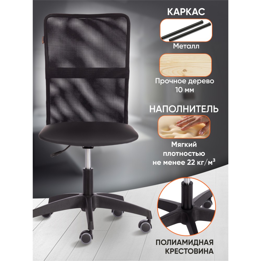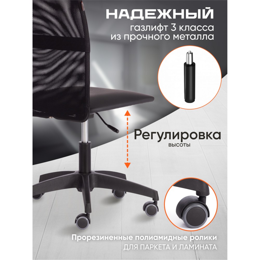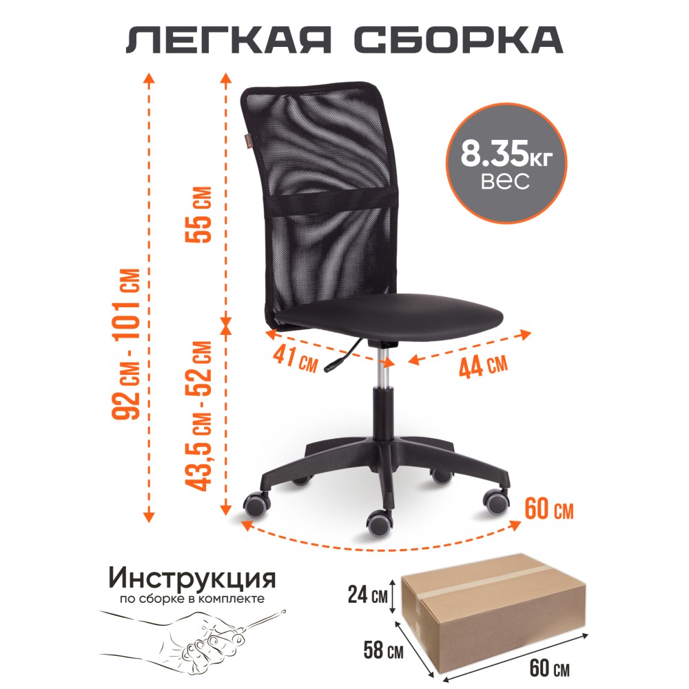 Оригинальное компьютерное кресло START – незаменимый предмет мебели в рабочем кабинете городской квартиры, загородного дома или офиса. Одновременно простая и функциональная модель прекрасно дополнит любой интерьер и создаст в помещении атмосферу комфорта и уюта. Крепкая 5-лучевая полиамидная крестовина диаметром 600 мм устойчива, прочна и надежна. Компьютерное кресло оснащено газлифтом 3 класса с ходом 100 мм, позволяющим настроить нужную высоту. Высококачественные ролики дополнительно прорезинены, не шумят при передвижении кресла и не оставляют царапин на паркете или ламинате. Диаметр штока – 11 мм. Компьютерное кресло с мягким наполнителем из пенополиуретана плотностью не менее 22 кг/м3 обладает отличными эксплуатационными качествами, не деформируется, пропускает тепло и отводит влагу, не накапливает пыль. Удобная спинка из однослойной сетки, обеспечивающей вентиляцию в жаркое время года, уменьшит дискомфорт в позвоночнике при длительном времяпрепровождении за компьютером. Экокожа , используемая при изготовлении кресла, выдерживает до 50 000 циклов на истирание по Мартиндейлу. Такой материал прост в уходе, устойчив к механическим повреждениям, приятен на ощупь. Сочетание чернрй экокожи и черной сетки идеально подойдет для создания гармоничного и привлекательного образа рабочего кабинета. Кресло поставляется в разобранном виде. Необходима простая сборка по прилагаемой инструкции. Максимальная нагрузка 100 кг.
