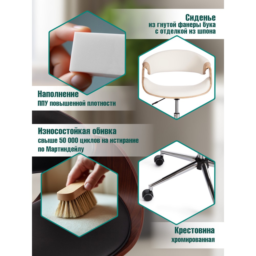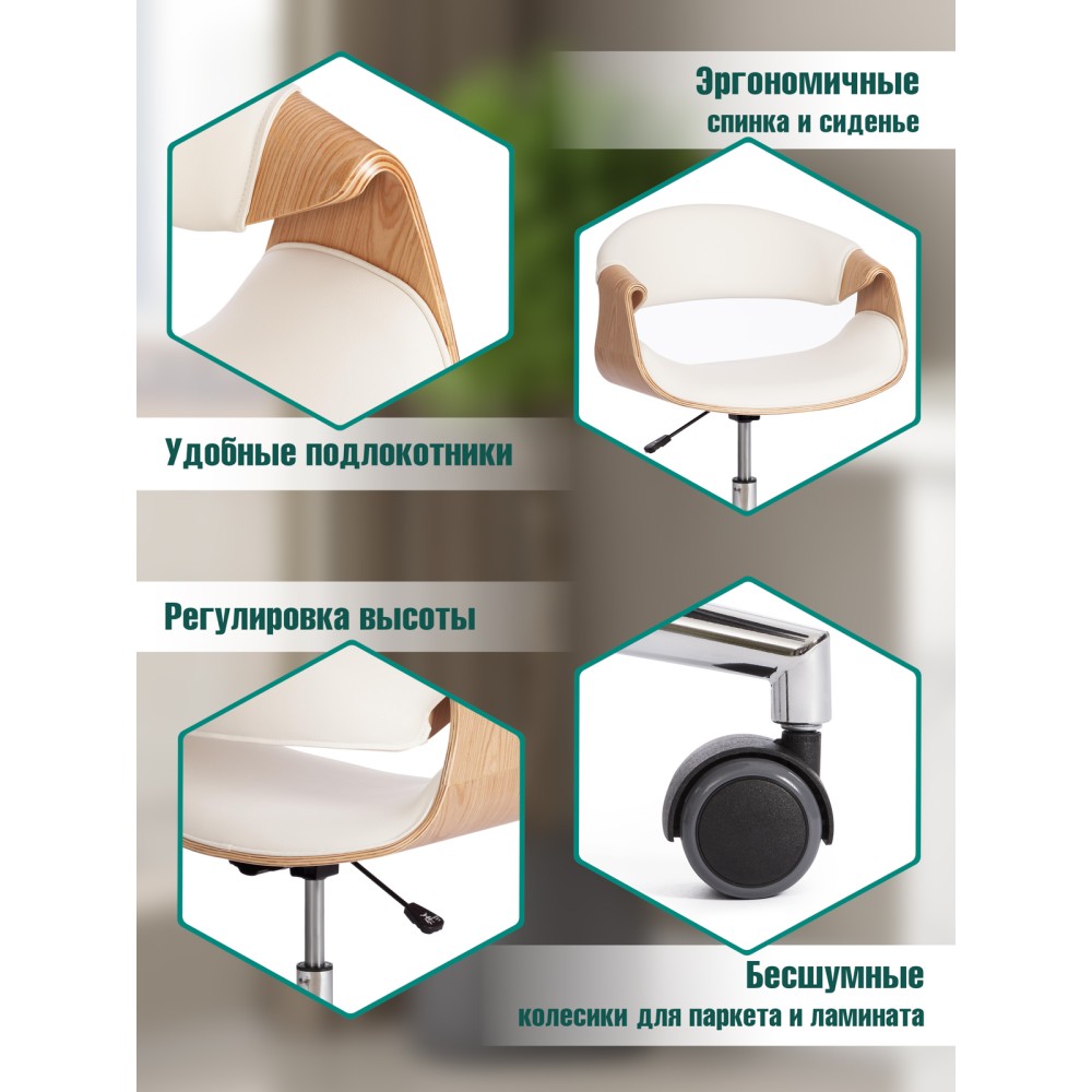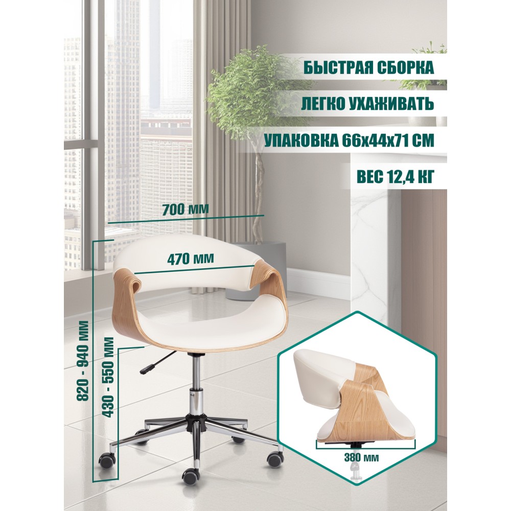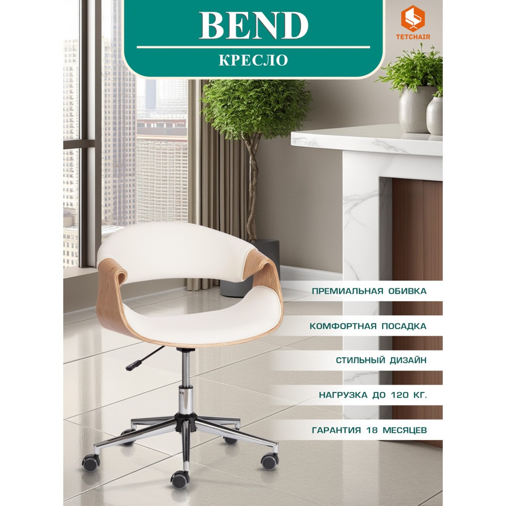 Элегантное и надежное кресло BEND из коллекции OFFICE - показатель безупречного вкуса своего владельца. Уникальная модель прекрасно впишется в дизайн офиса или дома. Деревянный каркас из шпонированной фанеры и обивка из искусственной кожи – удачное сочетание надежности и элегантности. Искусственная кожа гипоаллергенна, износостойка и проста в уходе. Сиденье с мягким наполнителем из пенополиуретана стандартной плотности пропускает воздух, не накапливает пыль, не деформируется на протяжении длительного времени. Для принятия удобной позы кресло регулируется по высоте. Деревянные подлокотники необычной формы помогут уменьшить дискомфорт в плечах и шее при длительной работе, а также комфортно расположиться у стола. Металлическая хромированная крестовина диаметром 640 мм обеспечивает устойчивость и безопасность модели. Сочетание каркаса натурального оттенка с белым сиденьем и спинкой выглядит привлекательно и эстетично. Наличие высококачественных полиамидных роликов позволяет легко передвигаться на кресле, даже не вставая с него. Колесики подходят для использования на низковорсовых ковровых покрытиях и на специальных защитных поверхностях. Модель BEND отличается повышенным комфортом и презентабельным внешним видом, удивит владельца своей долговечностью и надежностью. Максимальная нагрузка кресла 120 кг. Кресло поставляется в разобранном виде. Инструкция по сборке прилагается.