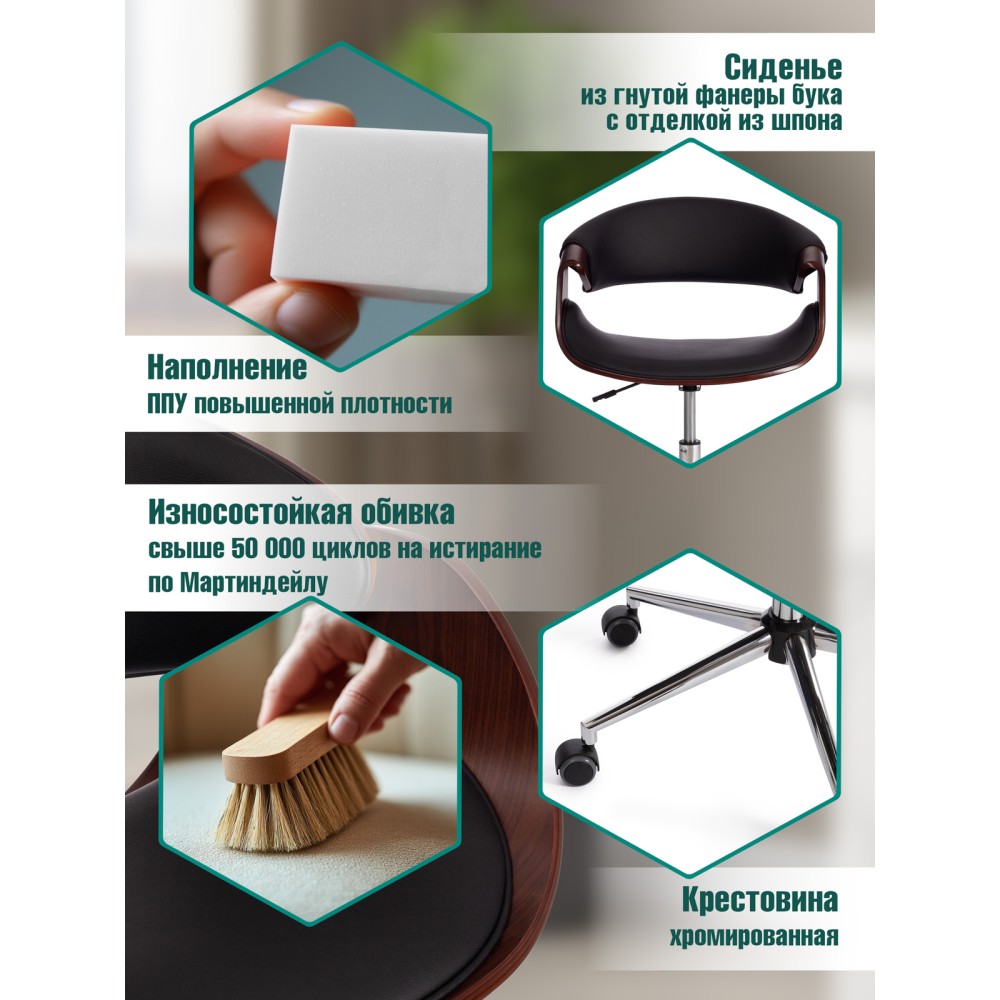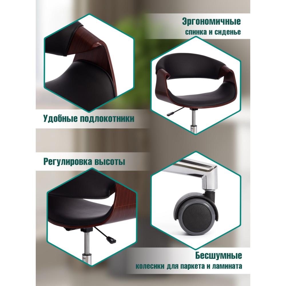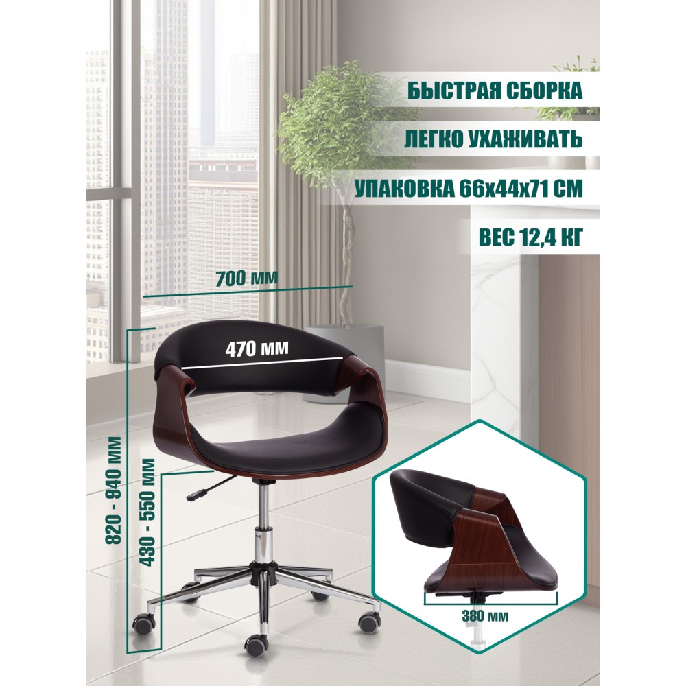 Элегантное и надежное кресло BEND из коллекции OFFICE - показатель безупречного вкуса своего владельца. Уникальная модель прекрасно впишется в дизайн офиса или дома. Деревянный каркас из шпонированной фанеры и обивка из искусственной кожи – удачное сочетание надежности и элегантности. Искусственная кожа гипоаллергенна, износостойка и проста в уходе. Сиденье с мягким наполнителем из пенополиуретана стандартной плотности пропускает воздух, не накапливает пыль, не деформируется на протяжении длительного времени. Для принятия удобной позы кресло регулируется по высоте. Деревянные подлокотники необычной формы помогут уменьшить дискомфорт в плечах и шее при длительной работе, а также комфортно расположиться у стола. Металлическая хромированная крестовина диаметром 640 мм обеспечивает устойчивость и безопасность модели. Сочетание каркаса цвета орех с черным сиденьем и спинкой выглядит привлекательно и эстетично. Наличие высококачественных полиамидных роликов позволяет легко передвигаться на кресле, даже не вставая с него. Колесики подходят для использования на низковорсовых ковровых покрытиях и на специальных защитных поверхностях. Модель BEND отличается повышенным комфортом и презентабельным внешним видом, удивит владельца своей долговечностью и надежностью. Максимальная нагрузка кресла 120 кг. Кресло поставляется в разобранном виде. Инструкция по сборке прилагается.