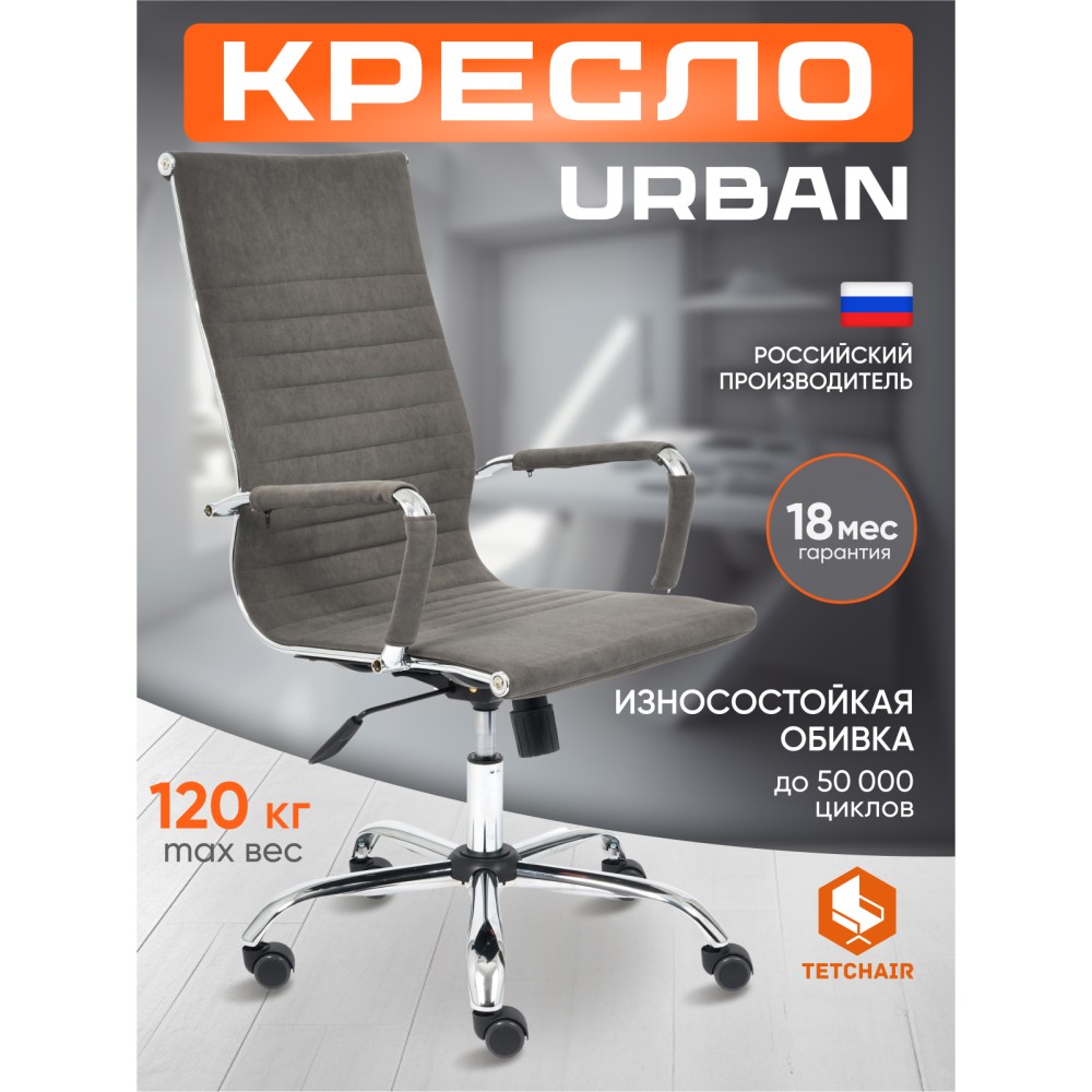 Эргономичное компьютерное кресло на колесиках URBAN из коллекции OFFICE станет центральным элементом в рабочем кабинете дома или офиса. Хромированный каркас модели выполнен из высокопрочного металла он прочен, надежен и долговечен. Эргономичная слегка изогнутая спинка отлично поддерживает спину в поясничной области. Фиксированные подлокотники с декоративными чехлами уменьшат дискомфорт в плечах и шее при длительной работе. Кресло регулируется по высоте. Механизм качания с фиксацией в одном положении поможет расслабиться и принять удобную позу. Металлическая хромированная крестовина не только обеспечивает маневренность и мобильность модели, она также необходима для устойчивости кресла. Во всех креслах бренда TETCHAIR используются газлифты 3 класса, он способен выдерживать вес до 120 кг. при интенсивном использовании кресла. Высококачественные полиуретановые ролики с прорезиненными вставками отличаются плавным и тихим ходом, устойчивы к износу и разрывам, бесшумны, не повреждают напольное покрытие. Компьютерное кресло изготавливается в нескольких вариантах: из флока оттенка олива, черного, серого, синего, коричневого и бордового цвета, а также из износостойкой высокопрочной экокожи цвета металлик, черного, белого, коричневого, бежевого цвета. Экокожа, используемая при изготовлении кресла, выдерживает до 50 000 циклов на истирание по Мартиндейлу, ткань флок выдерживает до 50 000 циклов. Ткани с прочностью более 35 000 циклов являются самыми долговечными. Мебель, в которой используются такие ткани можно использовать не только дома но и в ресторанах, салонах красоты, приемных. Привлекательная модель URBAN LOW не требует сложного ухода, подчеркнет безупречный вкус владельца, будет радовать своей долговечностью, красотой и практичностью продолжительное время. Кресло поставляется в разобранном виде. Необходима простая сборка по прилагаемой инструкции. Максимальная нагрузка модели 120 кг.