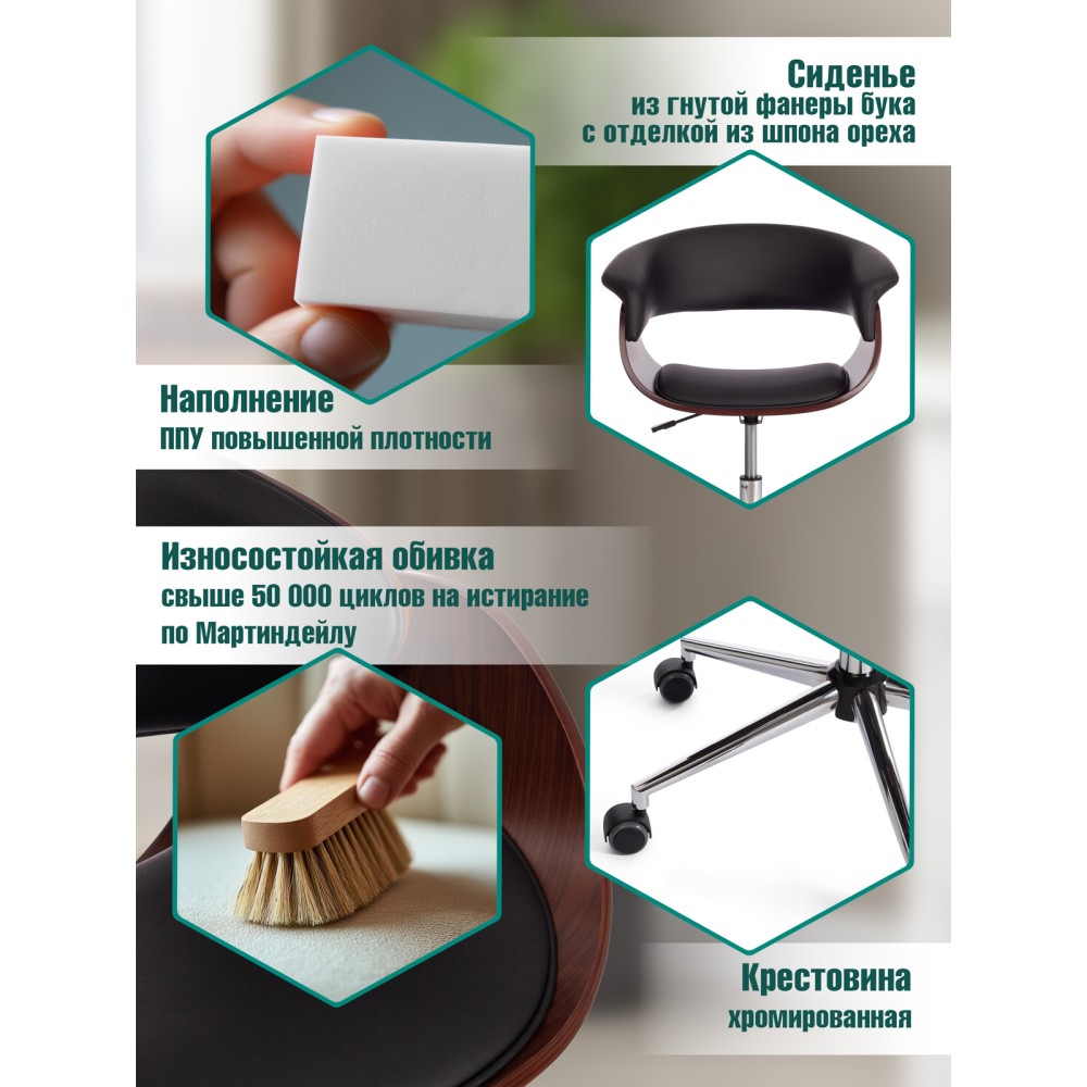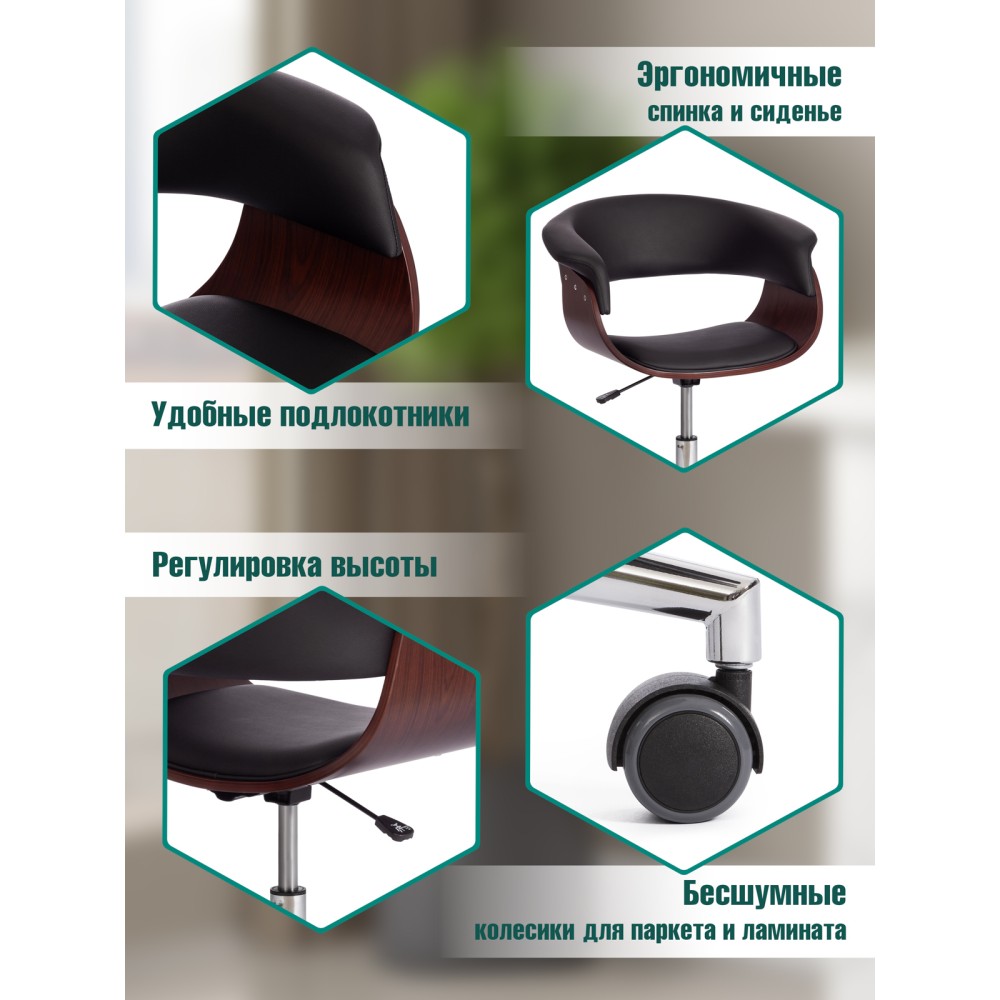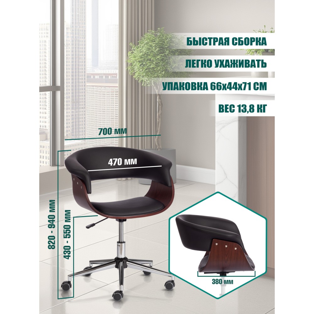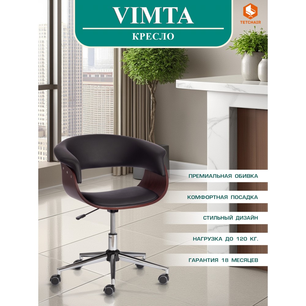 Изысканный дизайн кресла VIMTA из коллекции OFFICE удачно объединяет в себе черты элегантности и презентабельности. Благодаря своему уникальному внешнему виду модель отлично впишется в интерьер рабочего кабинета в доме или офисе. Прочный каркас, переходящий в подлокотники, изготовлен из шпонированной фанеры с красивым природным рисунком. Шпонированная фанера является безвредным и экологически чистым материалом. Комфортное сиденье с мягким наполнителем из пенополиуретана стандартной плотности легко подстраивается под контуры тела, не деформируется со временем. Высота кресла регулируется при помощи надежного и основательного механизма. Хромированная металлическая крестовина диаметром 640 мм устойчива, износостойка, имеет долгий срок службы. Для легкого перемещения модель оснащена высококачественными полиамидными роликами, которые подходят для использования на низковорсовых ковровых покрытиях и на специальных защитных поверхностях. Сочетание деревянного каркаса цвета орех, хромированной крестовины и обивки из черной искусственной кожи выглядит стильно и элегантно. Оригинальное кресло VIMTA станет основным акцентом в помещении, восхитит владельца своей привлекательностью, изысканностью и долговечностью. Максимальная нагрузка 120кг. Кресло поставляется в разобранном виде. Инструкция по сборке прилагается.