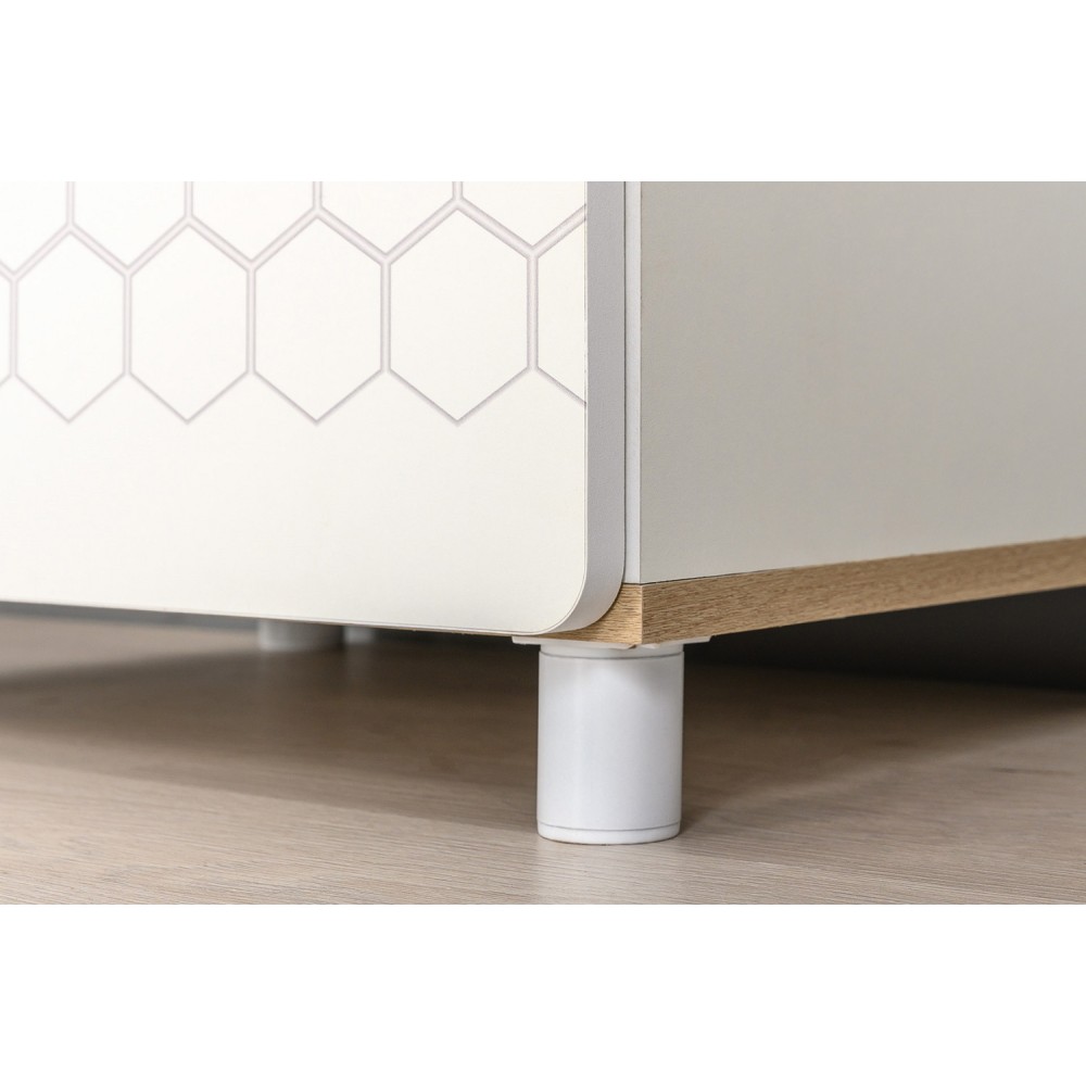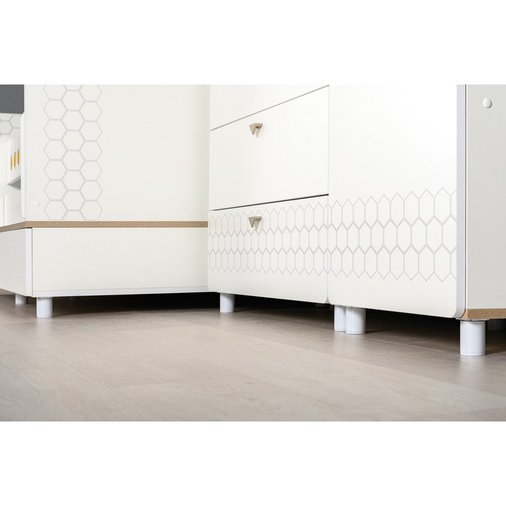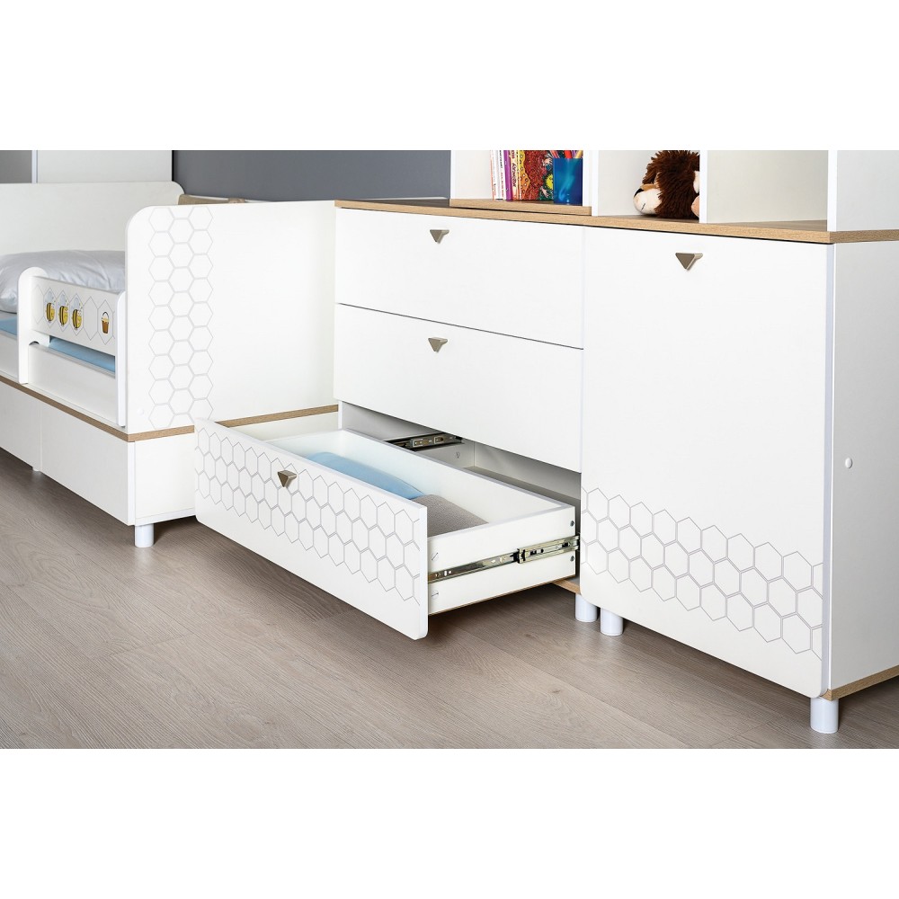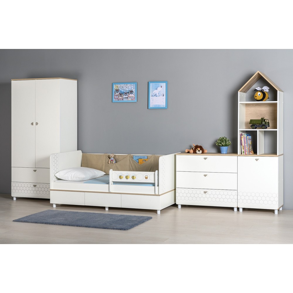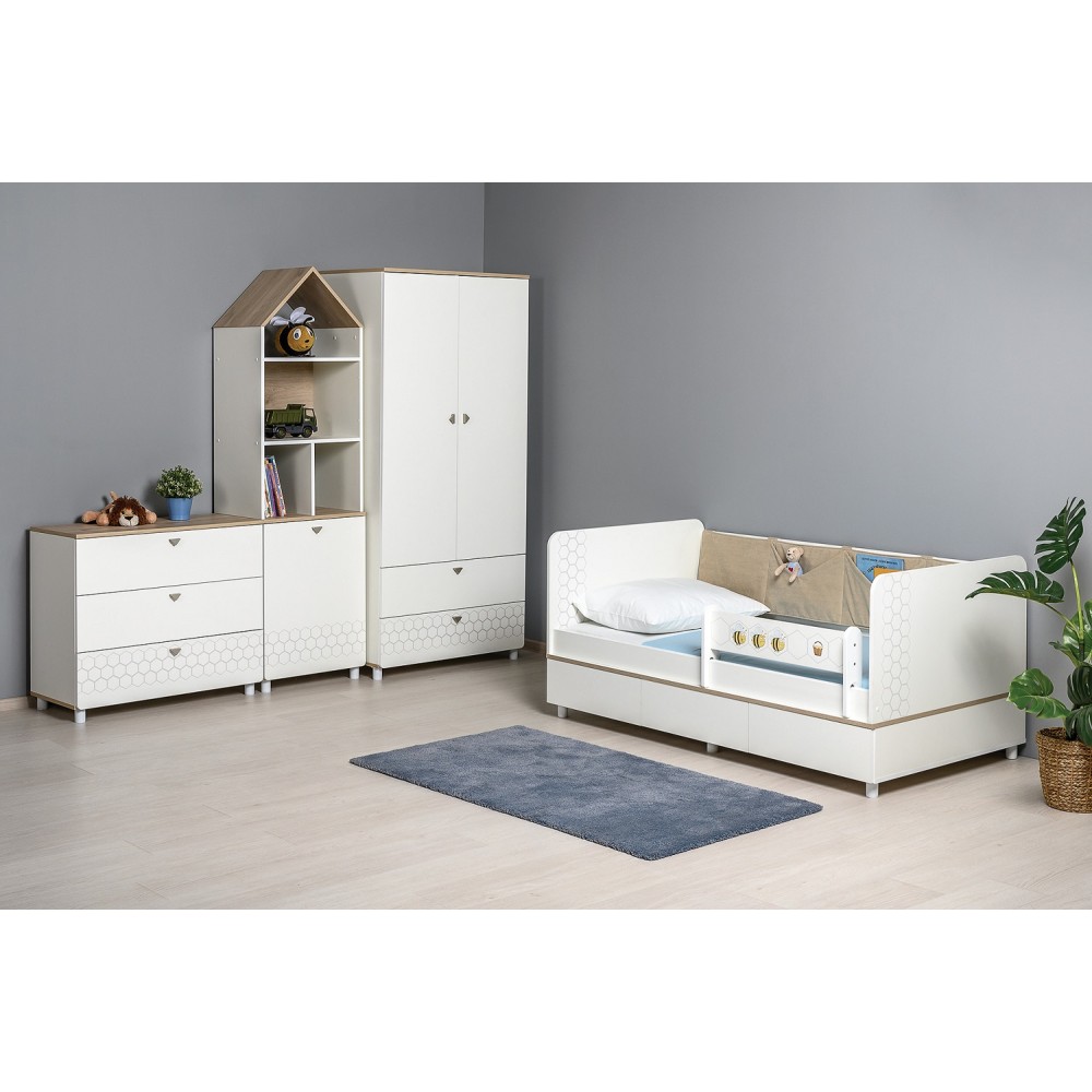 Кровать оснащена съёмным мягким элементом с карманами, передвижным бортиком и декорирована оригинальным рисунком - мультяшными пчёлками, которые никого не оставят равнодушным.