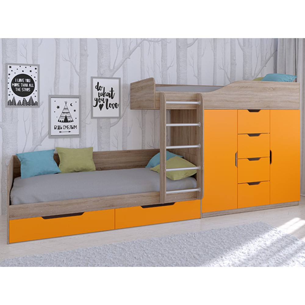 Двухъярусная кровать Астра 6 с полноценным размером спальных мест. Две кровати расположены не как обычно, одна над другой, а со смещением, что позволило вместить большой шкаф. Вся конструкция располагается вдоль одной стены и имеет ширину порядка трех метров. Доступ в верхнюю часть обеспечен удобной лестницей. Нижний ярус двухъярусной кровати Астра 6 может использоваться в качестве дивана, если вдоль стены расположить маленькие подушки. Постельное белье может быть убрано в выдвижные и вместительные ящики, размещенные под нижним ярусом. Один из них можно использовать для хранения игрушек. Эта удобная двухъярусная кровать Астра 6 снабжена вместительным шкафом для одежды и белья. Конфигурация шкафа позволяет разделить места хранения для каждого пользователя отдельно. Для этого имеются два отдельных платяных шкафа и четыре выдвижных ящика.