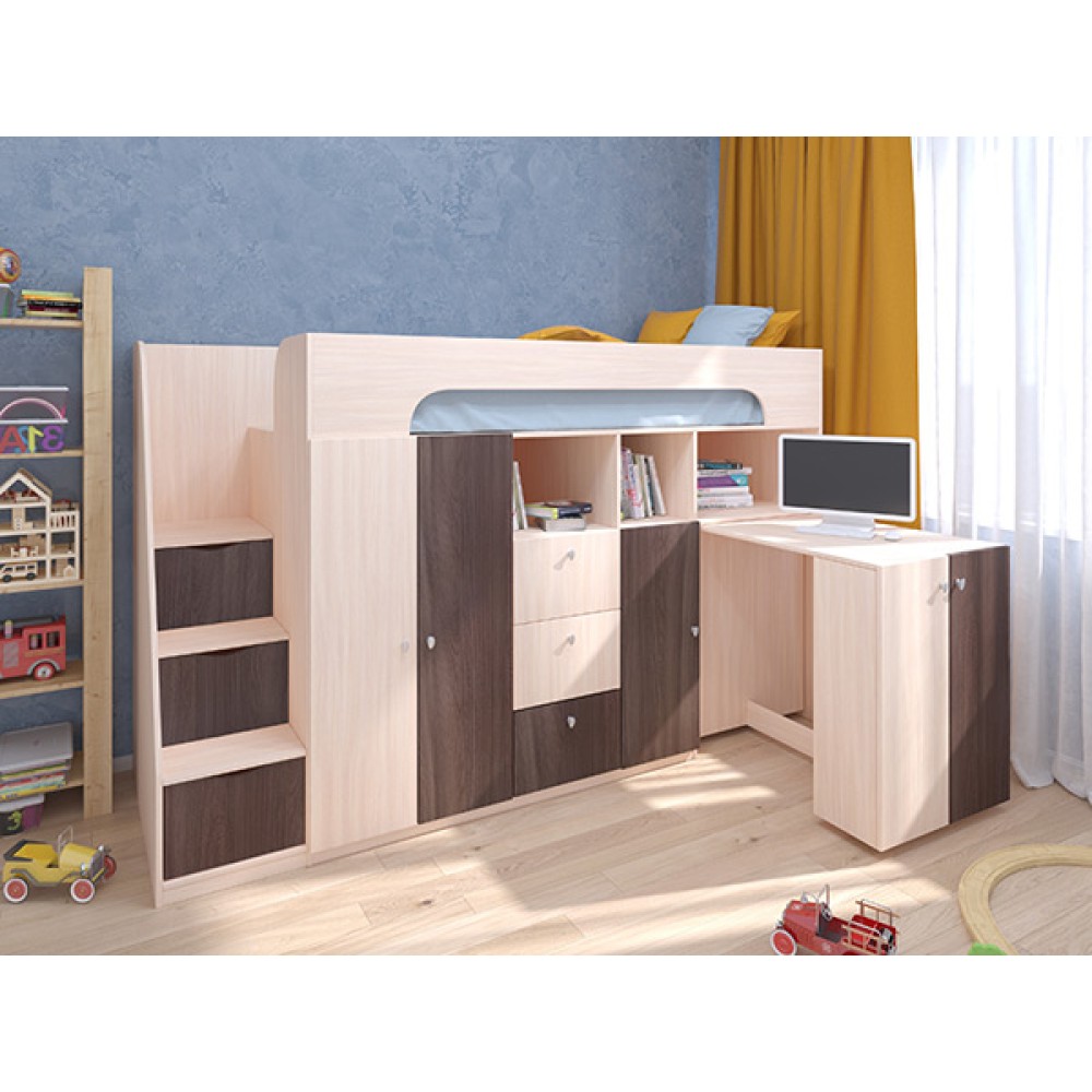 Интересная компоновка предметов позволяет с тем же рациональным расчетом использовать пространство. Под кроватью, которая находится практически на уровне стола, расположен выдвижной столик для занятий, который также легко спрятать по необходимости. В боковую ножку столика встроен компактный мини-шкаф. Там же имеется двустворчатый шкафчик и разноуровневые полки, две из которых открыты. Сбоку детской кровати расположена лестница, имитированная под шкафы разной глубины.