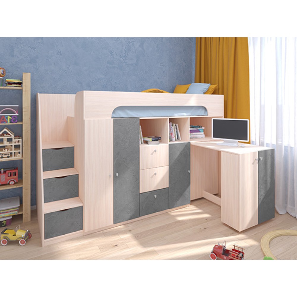 Интересная компоновка предметов позволяет с тем же рациональным расчетом использовать пространство. Под кроватью, которая находится практически на уровне стола, расположен выдвижной столик для занятий, который также легко спрятать по необходимости. В боковую ножку столика встроен компактный мини-шкаф. Там же имеется двустворчатый шкафчик и разноуровневые полки, две из которых открыты. Сбоку детской кровати расположена лестница, имитированная под шкафы разной глубины.