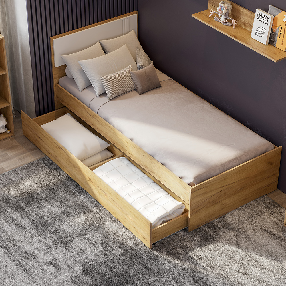 Односпальная кровать Милан привнесет яркий акцент в подростковую или детскую комнату. В выкатном ящике можно разместить постельные принадлежности и игрушки.