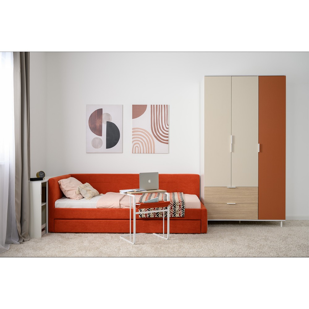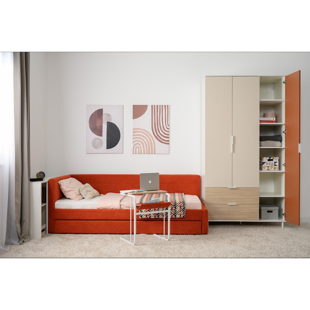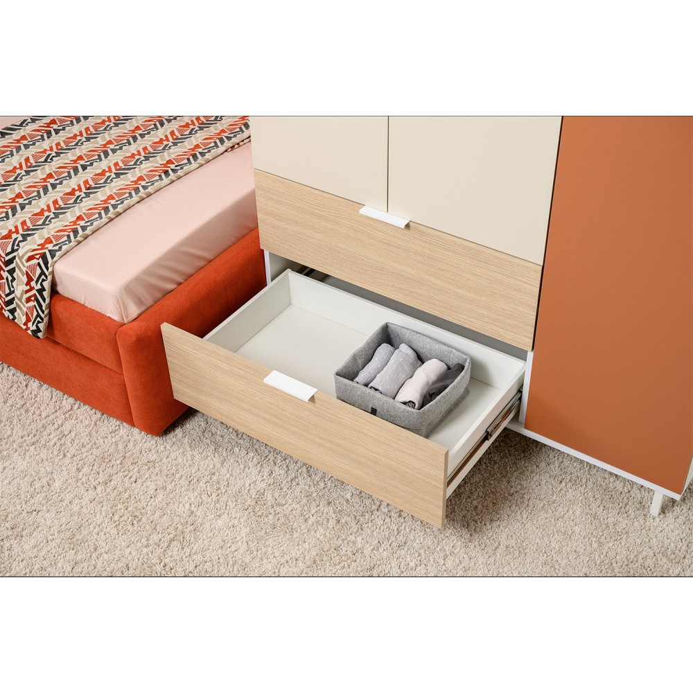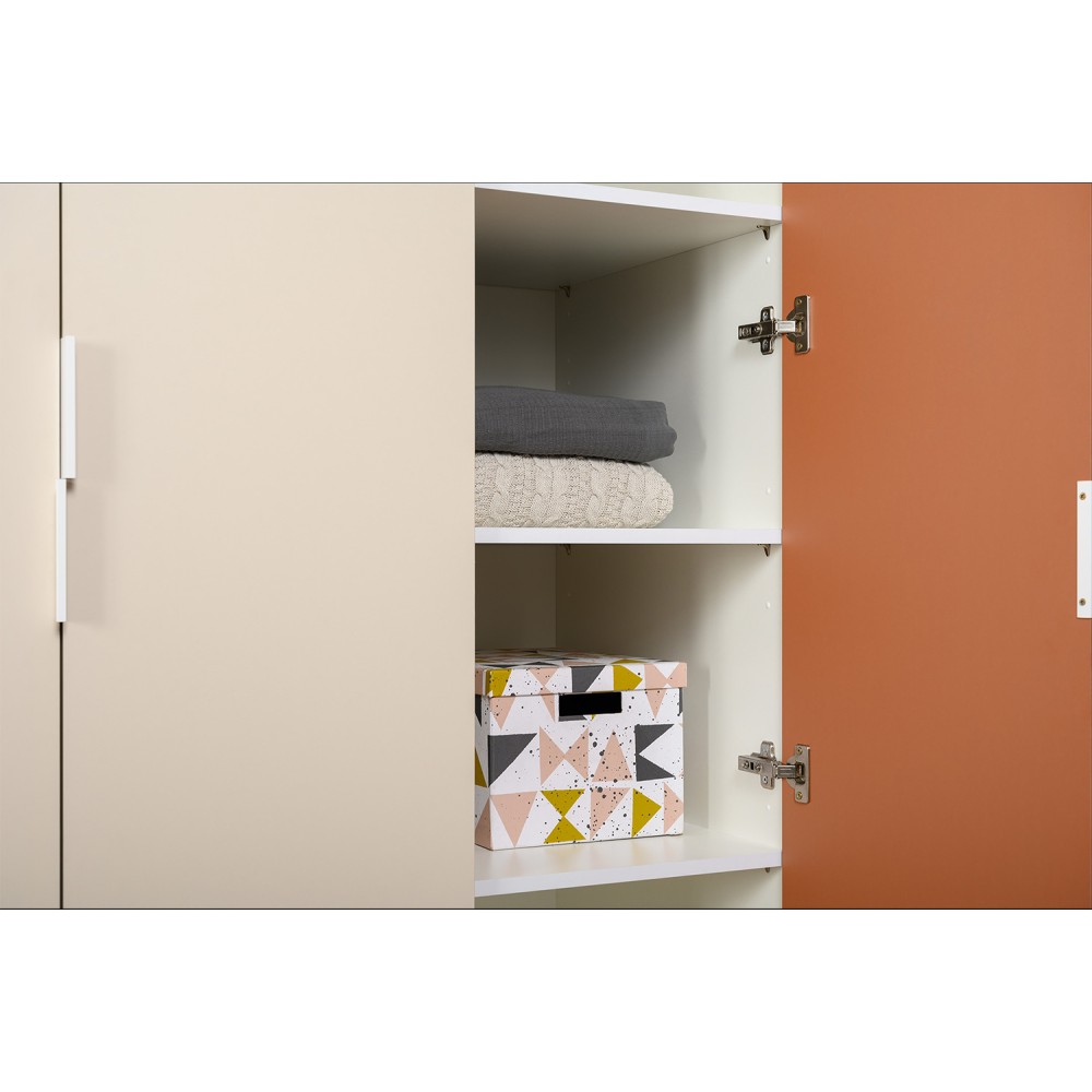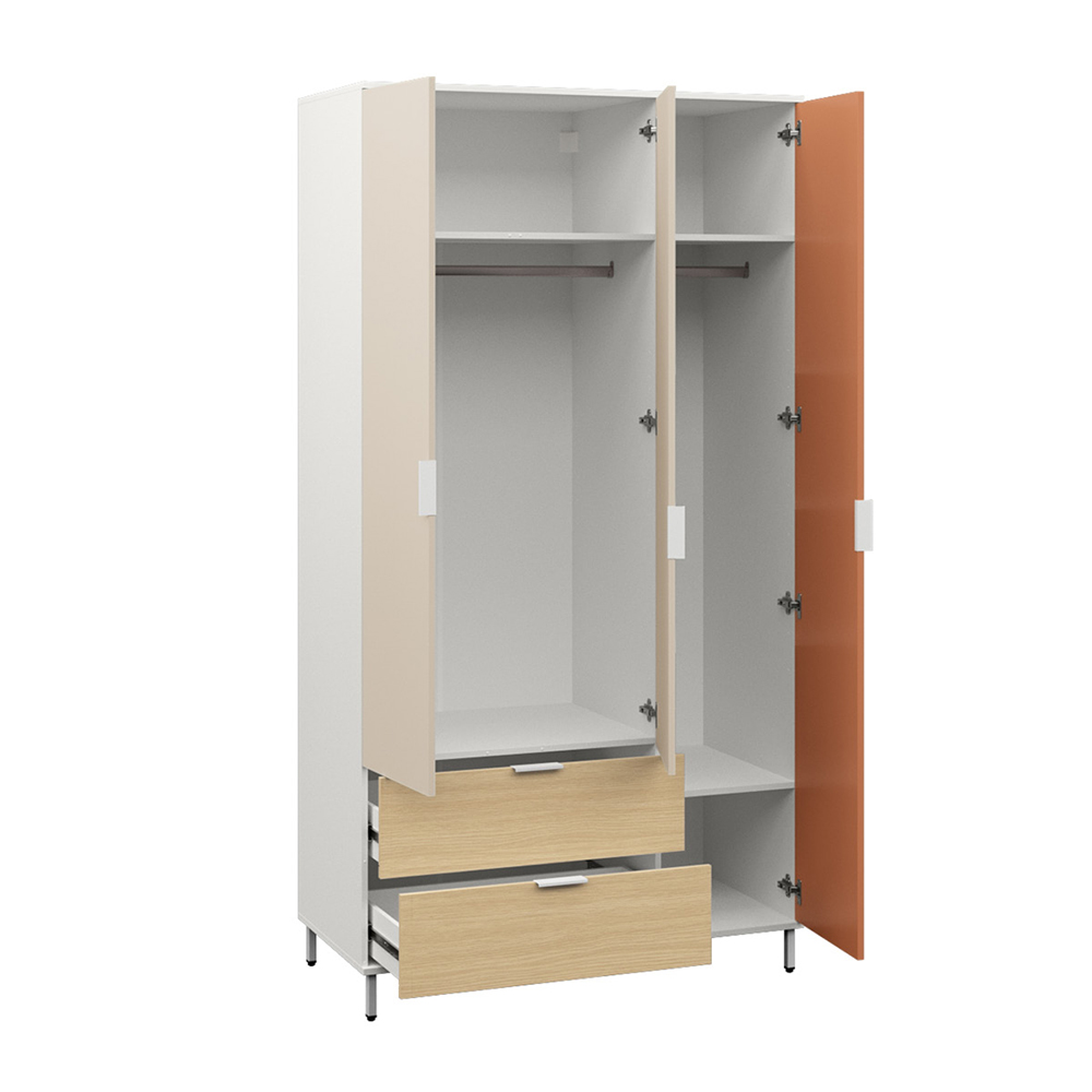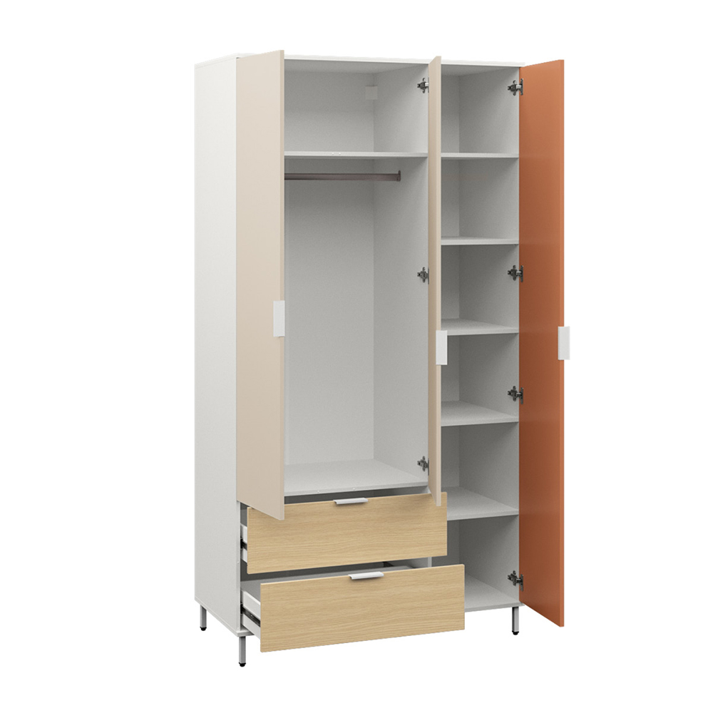 Все вещи ребёнка будут на своём месте. На столе есть крепление для рюкзака или наушников. Наполнение шкафов для одежды можно менять на выбор: полки либо штанги. Петли фасадов оснащены доводчиками.