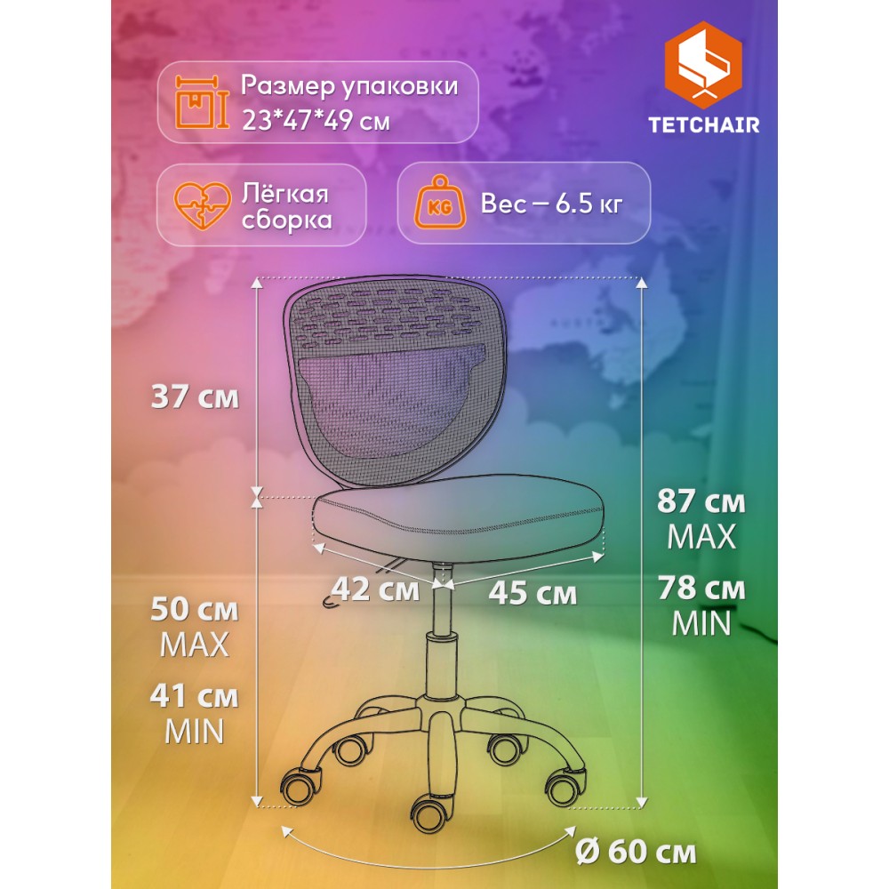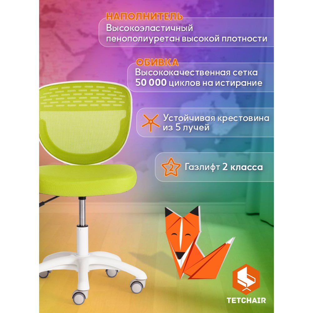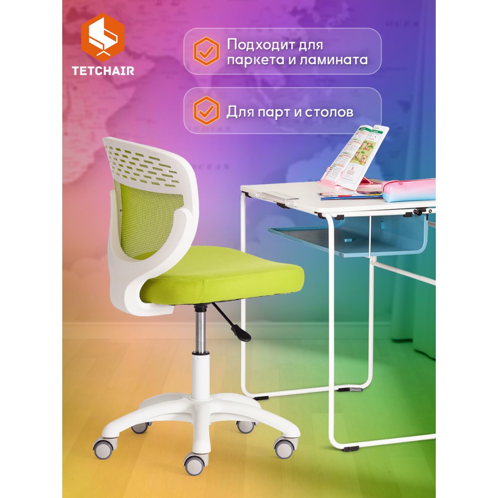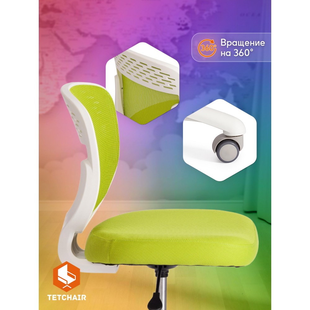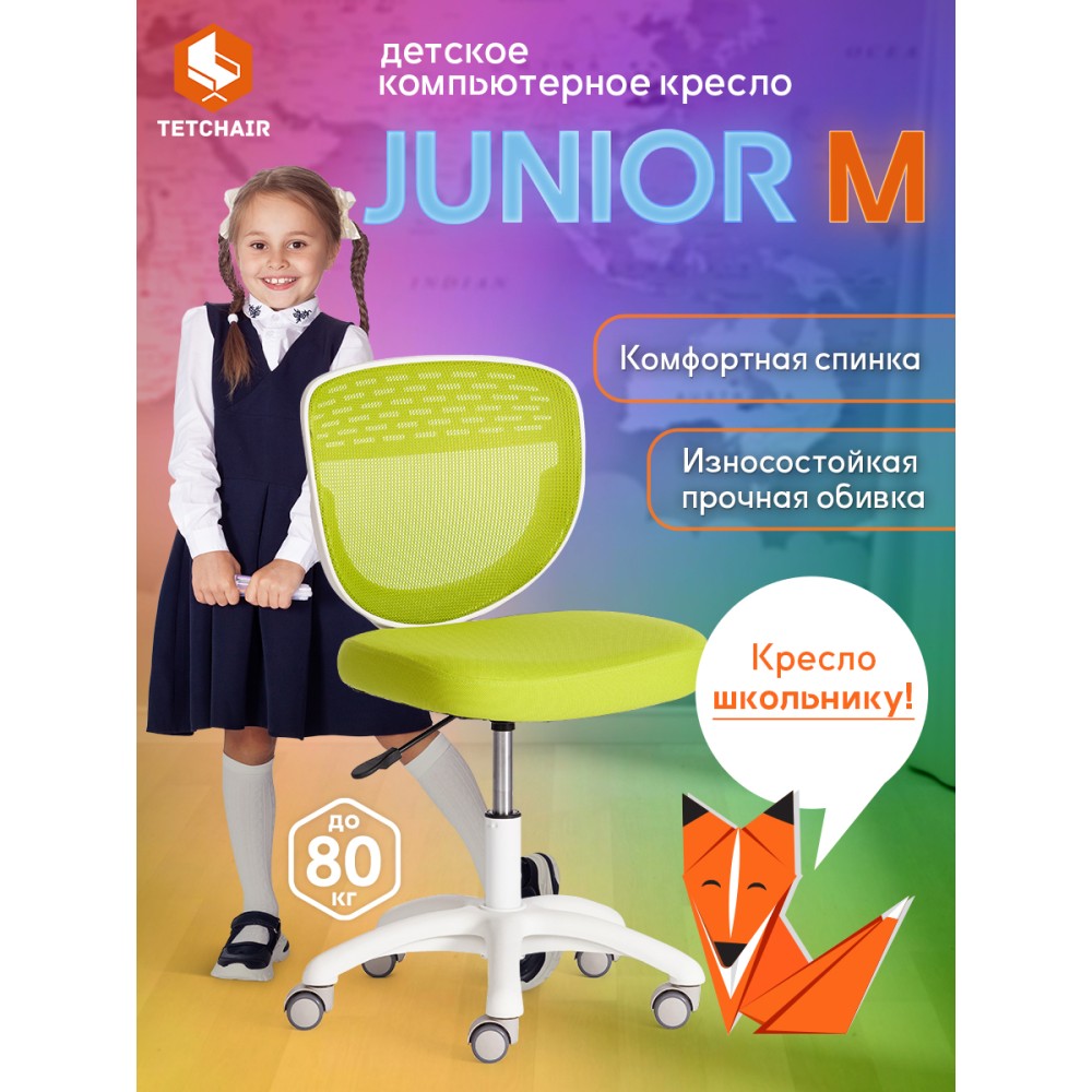 Детское кресло Junior M/Джуниор М - незаменимый предмет мебели в комнате ребенка младшего школьного возраста. Привлекательная модель прекрасно дополнит любой интерьер городской квартиры или загородного дома, создаст в помещении атмосферу комфорта, уюта и непринужденности. Прочная и устойчивая 5-лучевая полипропиленовая крестовина 600 мм надежна и основательна. Бесшумные высококачественные прорезиненные ролики с функцией блокировки при нагрузке не повреждают поверхность, подойдут для использования на паркете и ламинате. Кресло оснащено газлифтом 2 класса. Удобная сетчатая спинка кресла позволяет свободно циркулировать воздуху, создавая ребенку комфортные условия труда. Мягкое сиденье с наполнителем из пенополиуретана 30 кг/м3 не деформируется со временем, не требует сложной чистки. Кресло регулируется по высоте. Модель обита износостойкой мебельной тканью, обладающей отличными эксплуатационными качествами, не требующей сложного ухода, выдерживающей 50 000 циклов на истирание по Мартиндейлу. Контрастное сочетание белого пластика с обивкой зеленого цвета (Green/Грин) выглядит выразительно и привлекательно. Кресло Junior M/Джуниор М идеально впишется в любой современный интерьер и станет ярким акцентом в детской комнате. Максимальная нагрузка 80 кг. Кресло поставляется в разобранном виде. Необходима простая сборка по прилагаемой инструкции.
