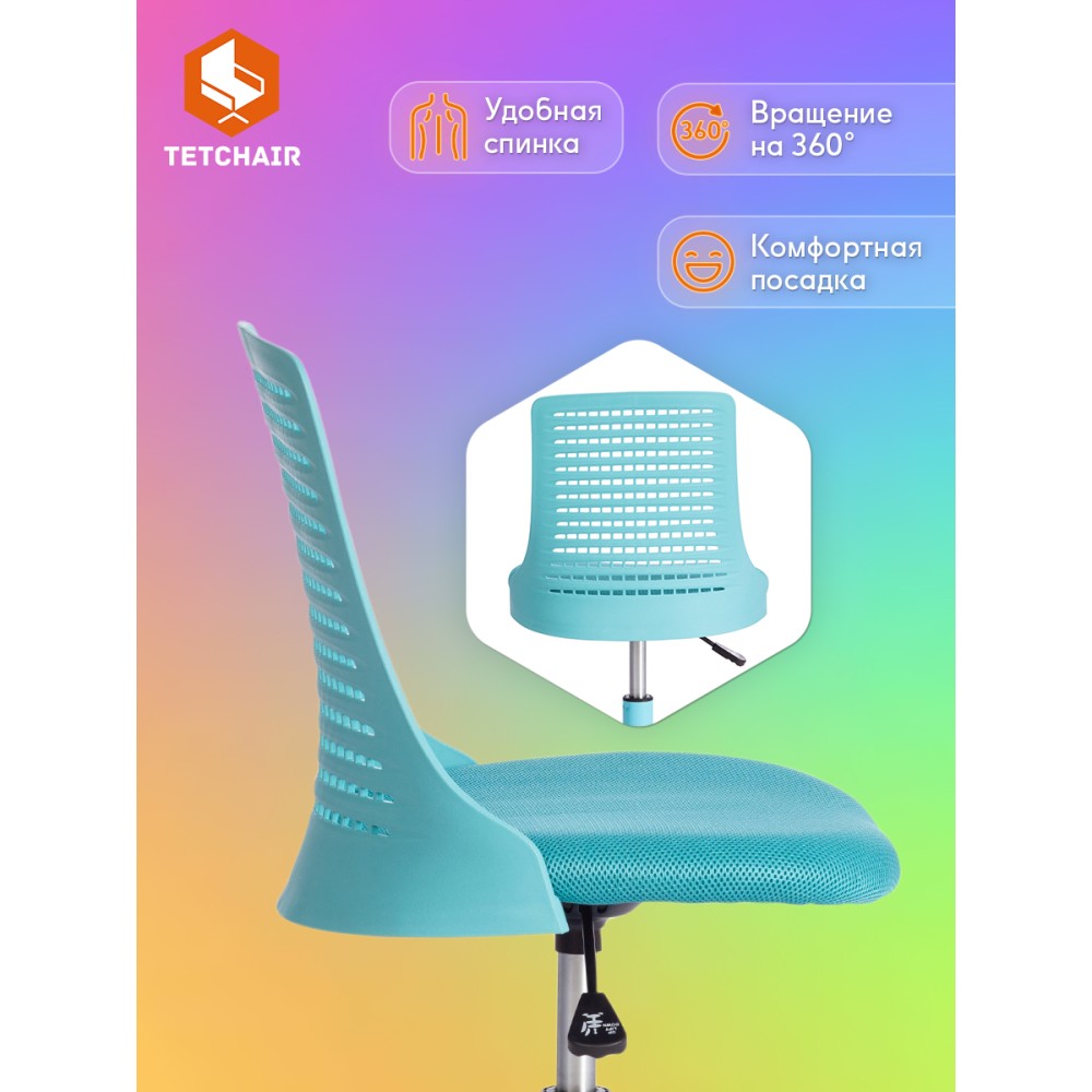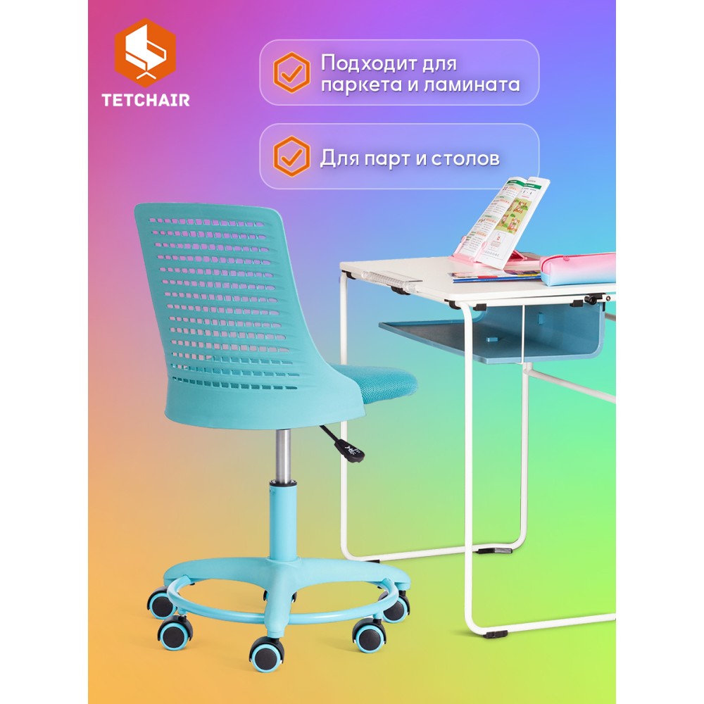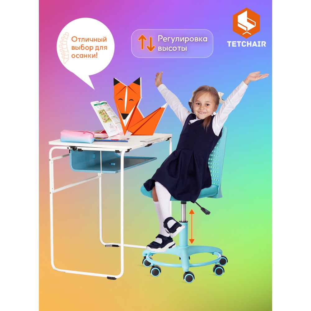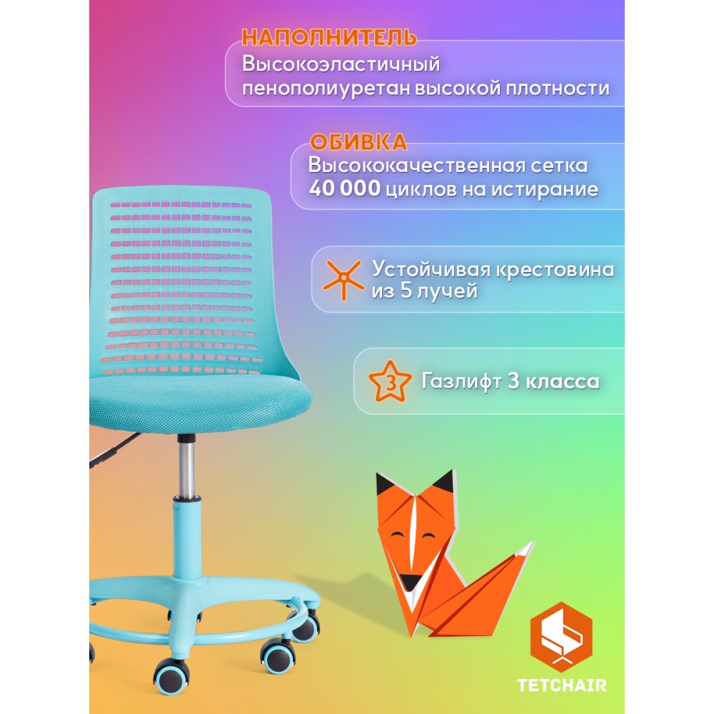 Оригинальное кресло KIDDY – это незаменимый предмет мебели в комнате вашего ребенка. Привлекательная модель бирюзового цвета прекрасно дополнит любой интерьер и создаст в помещении атмосферу комфорта и уюта. Пластиковый каркас модели бирюзового цвета долговечен и надежен, не теряет своего первоначального вида продолжительное время. Сиденье бирюзового цвета выполнено из сетчатой ткани с дополнительной перфорацией для поступления воздуха. Сетка, используемая при изготовлении кресла, выдерживает до 25 000 циклов на истирание по Мартиндейлу. В сиденье используется мягкий наполнитель из пенополиуретана стандартной плотности. Прочная и устойчивая пластиковая крестовина диаметром 500 мм оснащена металлической подставкой для ног, которая позволит ребенку расположиться на кресле с комфортом и удобством. Бесшумные высококачественные прорезиненные ролики не повреждают поверхность, подойдут для использования на паркете и ламинате. Ролики и крестовина в креслах бренда TETCHAIR соответствуют стандарту BIFMA. Во всех креслах бренда TETCHAIR используются газлифты 3 класса, он способен выдерживать вес до 80 кг. Яркая расцветка, привлекательный дизайн, крепкое основание, эргономичная спинка и надежный механизм регулировки высоты будут доставлять удовольствие, восхищать вас и вашего ребенка долгие годы. Модель поставляется в разобранном виде. Необходима несложная сборка по прилагаемой инструкции. Максимальная нагрузка модели 80 кг.