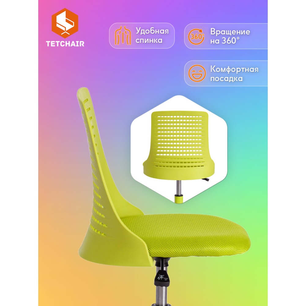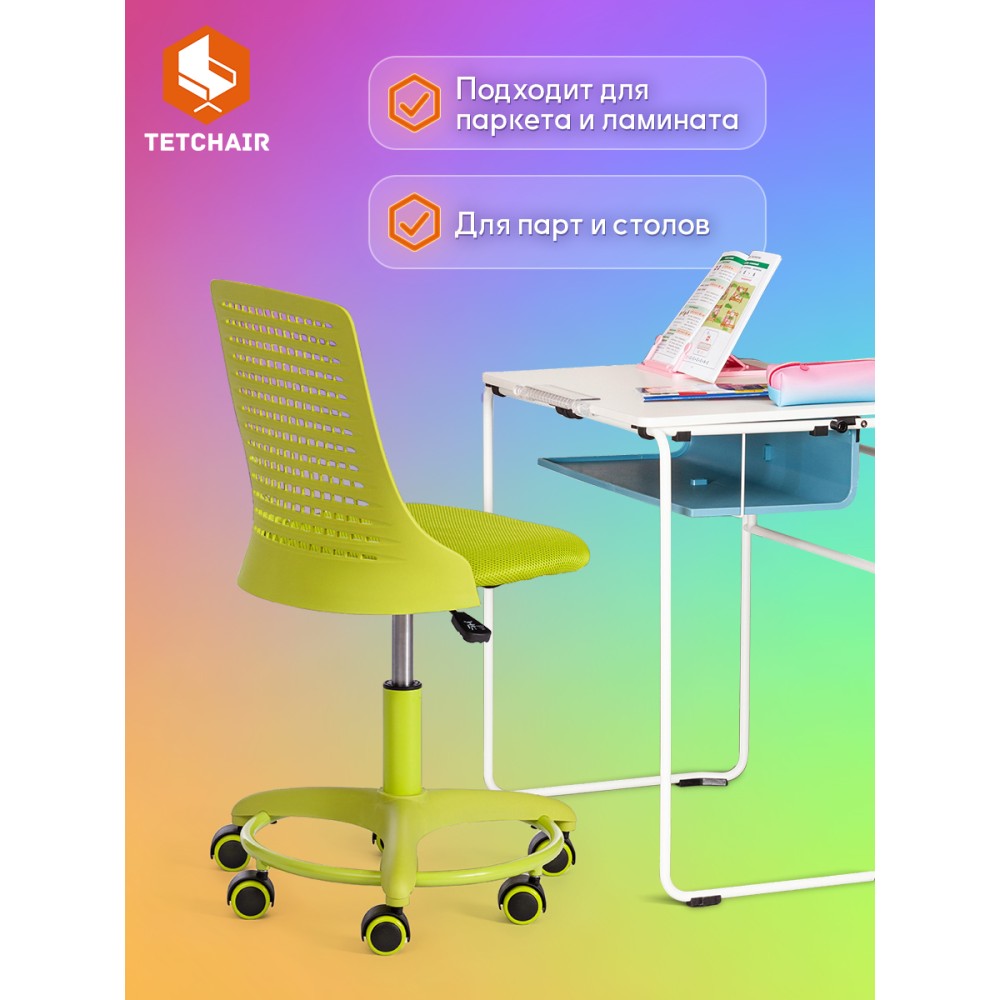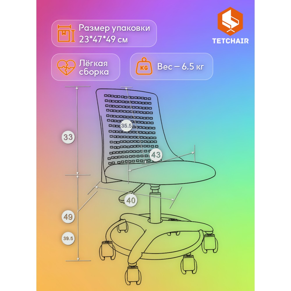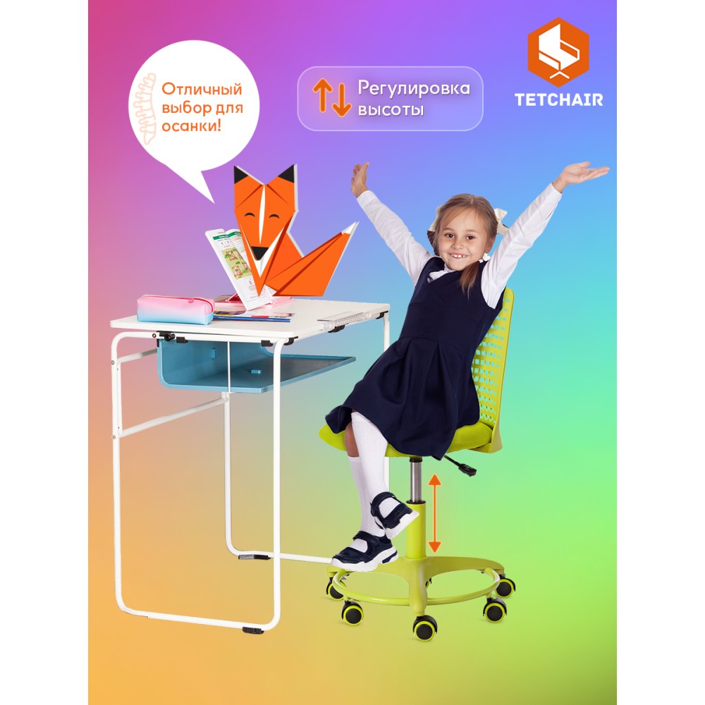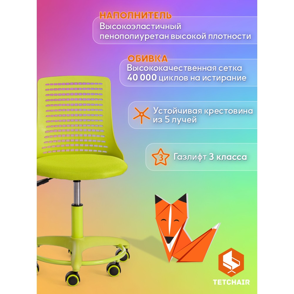 Оригинальное кресло KIDDY – это незаменимый предмет мебели в комнате вашего ребенка. Привлекательная модель салатового цвета прекрасно дополнит любой интерьер и создаст в помещении атмосферу комфорта и уюта. Пластиковый каркас модели салатового цвета долговечен и надежен, не теряет своего первоначального вида продолжительное время. Сиденье слатового цвета выполнено из сетчатой ткани с дополнительной перфорацией для поступления воздуха. Сетка, используемая при изготовлении кресла, выдерживает до 25 000 циклов на истирание по Мартиндейлу. В сиденье используется мягкий наполнитель из пенополиуретана стандартной плотности. Прочная и устойчивая пластиковая крестовина диаметром 500 мм оснащена металлической подставкой для ног, которая позволит ребенку расположиться на кресле с комфортом и удобством. Бесшумные высококачественные прорезиненные ролики не повреждают поверхность, подойдут для использования на паркете и ламинате. Ролики и крестовина в креслах бренда TETCHAIR соответствуют стандарту BIFMA. Во всех креслах бренда TETCHAIR используются газлифты 3 класса, он способен выдерживать вес до 80 кг. Яркая расцветка, привлекательный дизайн, крепкое основание, эргономичная спинка и надежный механизм регулировки высоты будут доставлять удовольствие, восхищать вас и вашего ребенка долгие годы. Модель поставляется в разобранном виде. Необходима несложная сборка по прилагаемой инструкции. Максимальная нагрузка модели 80 кг.