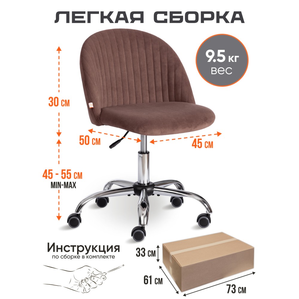 Яркий дизайн компьютерного кресла MELODY из коллекции OFFICE создаст в помещении атмосферу уюта и непринужденности. Модель будет отлично смотреться и в рабочем кабинете, и в комнате школьника. Крепкий каркас выполнен из фанеры толщиной более 10 мм – экологически чистого, надежного и долговечного материала. Сиденье с мягким наполнителем из пенополиуретана (до 35 кг/м2) стандартной плотности обладает высокими эксплуатационными качествами, не меняет форму со временем. Компьютерный стул регулируется по высоте с помощью специального прочного механизма. Металлическая хромированная крестовина устойчива, выдерживает большой вес, выглядит привлекательно и стильно. Полиуретановые ролики с прорезиненными вставками бесшумны, имеют долгий срок службы, не повреждают паркет и ламинате. Ролики и крестовина в креслах бренда TETCHAIR соответствуют стандарту BIFMA. Во всех креслах бренда TETCHAIR используются газлифты 3 класса, он способен выдерживать вес до 90 кг. Необычная декоративная стежка на спинке офисного кресла придает изделию особый шарм и оригинальность. Обивка из велюра или флока износостойка, прочна, проста в уходе, приятна на ощупь, сохраняет свой первоначальный вид на протяжении длительного времени. Ткань флок , используемая при изготовлении кресла, выдерживает до 50 000 циклов на истирание по Мартиндейлу, ткань велюр выдерживает до 60 000 циклов. Ткани с прочностью более 35 000 циклов являются самыми долговечными. Мебель, в которой используются такие ткани можно использовать не только дома но и в ресторанах, салонах красоты, приемных. Элегантное компьютерное кресло MELODY изготавливается в черном, сером, коричневом, бежевом, бордовом, оранжевом, розовом, фиолетовом цветах. Также представлены варианты с комбинированной клеткой и комбинированным рисунком. Офисное кресло поставляется в разобранном виде. Необходима простая сборка по прилагаемой инструкции. Максимальная нагрузка модели 90 кг.