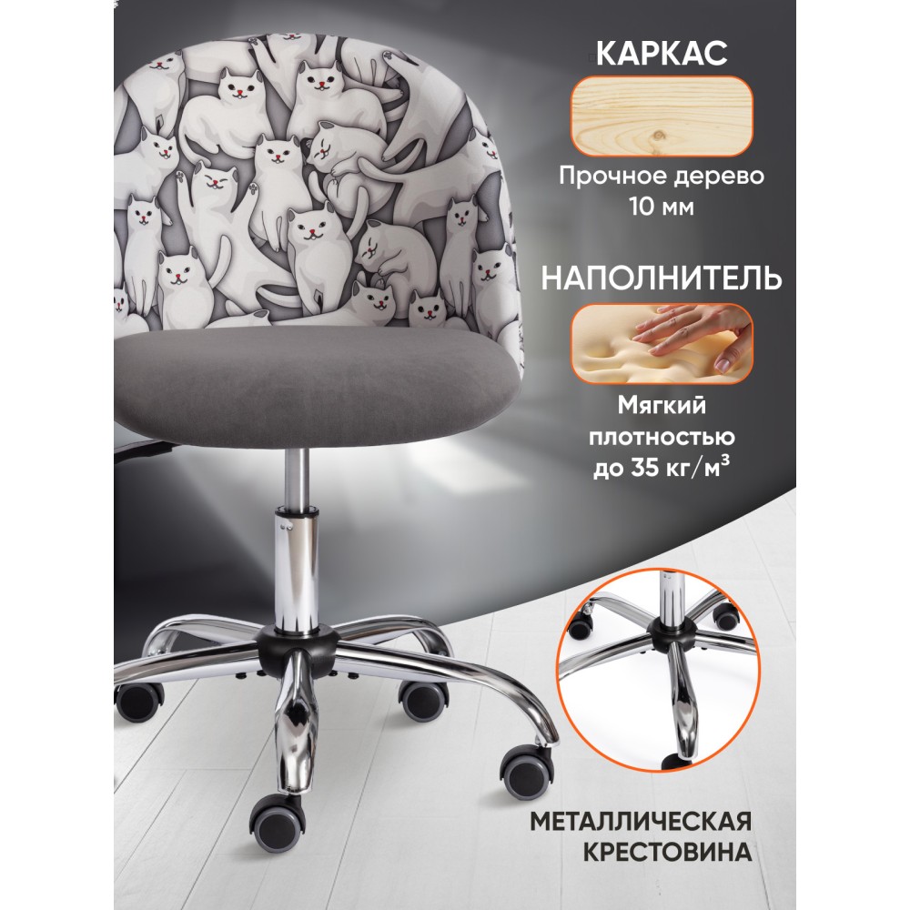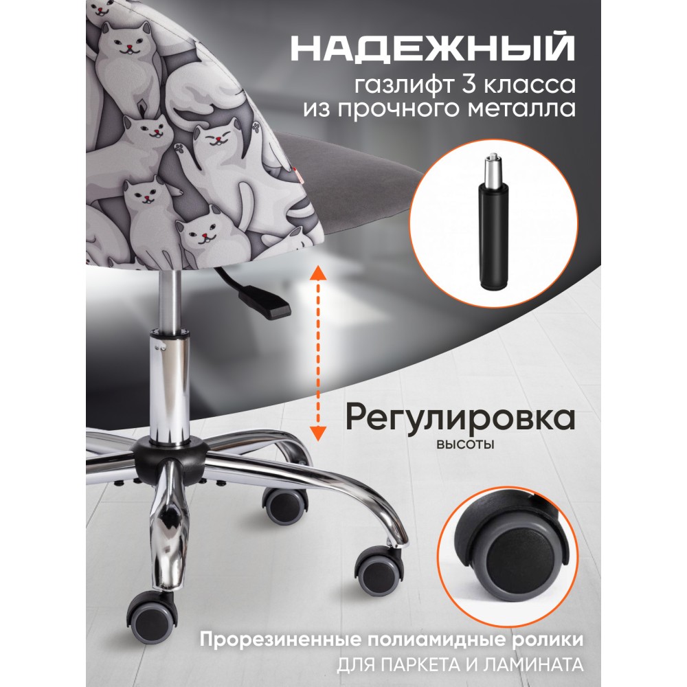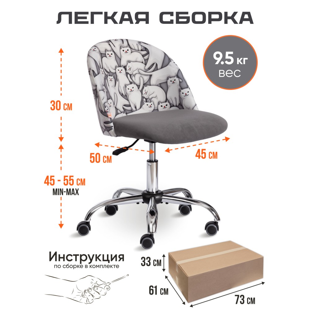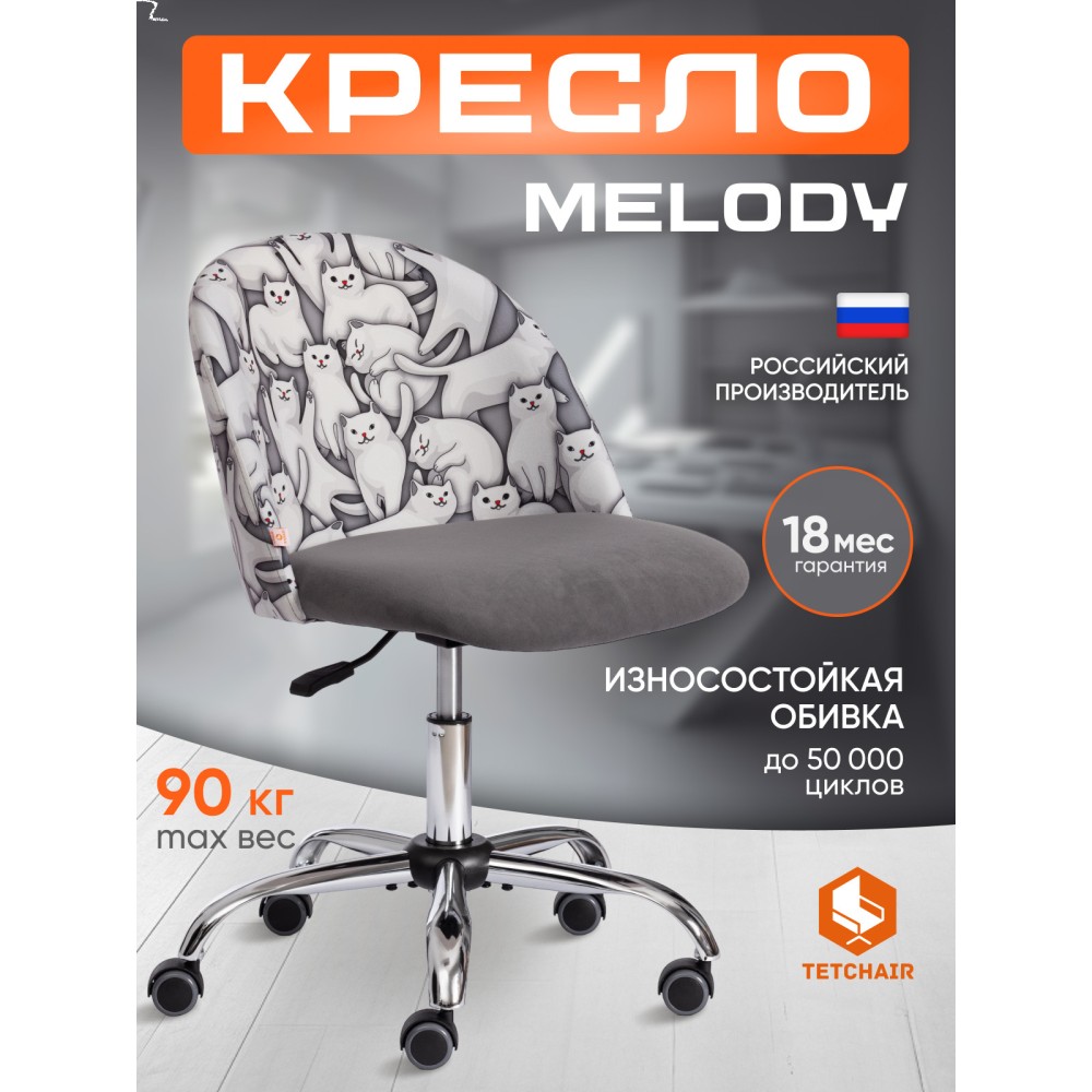 Яркий дизайн компьютерного кресла MELODY из коллекции OFFICE создаст в помещении атмосферу уюта и непринужденности. Модель будет отлично смотреться и в рабочем кабинете, и в комнате школьника. Крепкий каркас выполнен из фанеры толщиной более 10 мм – экологически чистого, надежного и долговечного материала. Сиденье с мягким наполнителем из пенополиуретана (до 35 кг/м2) стандартной плотности обладает высокими эксплуатационными качествами, не меняет форму со временем. Компьютерный стул регулируется по высоте с помощью специального прочного механизма. Металлическая хромированная крестовина устойчива, выдерживает большой вес, выглядит привлекательно и стильно. Полиуретановые ролики с прорезиненными вставками бесшумны, имеют долгий срок службы, не повреждают паркет и ламинате. Ролики и крестовина в креслах бренда TETCHAIR соответствуют стандарту BIFMA. Во всех креслах бренда TETCHAIR используются газлифты 3 класса, он способен выдерживать вес до 90 кг. Необычная декоративная стежка на спинке офисного кресла придает изделию особый шарм и оригинальность. Обивка из велюра или флока износостойка, прочна, проста в уходе, приятна на ощупь, сохраняет свой первоначальный вид на протяжении длительного времени. Ткань флок , используемая при изготовлении кресла, выдерживает до 50 000 циклов на истирание по Мартиндейлу, ткань велюр выдерживает до 60 000 циклов. Ткани с прочностью более 35 000 циклов являются самыми долговечными. Мебель, в которой используются такие ткани можно использовать не только дома но и в ресторанах, салонах красоты, приемных. Элегантное компьютерное кресло MELODY изготавливается в черном, сером, коричневом, бежевом, бордовом, оранжевом, розовом, фиолетовом цветах. Также представлены варианты с комбинированной клеткой и комбинированным рисунком. Офисное кресло поставляется в разобранном виде. Необходима простая сборка по прилагаемой инструкции. Максимальная нагрузка модели 90 кг.