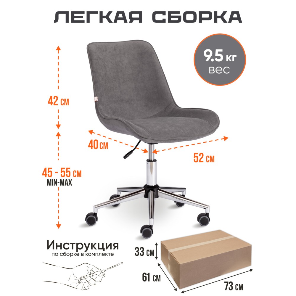 Яркое компьютерное кресло STYLE из коллекции OFFICE - идеальное сочетание практичности, функциональности и привлекательности. Модель прекрасно впишется в комнату школьника или в рабочий кабинет в офисе. Прочный каркас изготовлен из экологически безопасной и влагостойкой фанеры толщиной более 10 мм . Компьютерное кресло с мягким наполнителем из пенополиуретана стандартной плотности (до 35 кг/м2) обладает долгим сроком службы, не деформируется, пропускает воздух, не накапливает пыль. Модель регулируется по высоте при помощи надежного механизма. Хромированная крестовина изготовлена из металла, основательна, устойчива, выдерживает сильные нагрузки. Прорезиненные ролики из полиуретана с прорезиненными вставками отличаются плавным и тихим ходом, не повреждают напольное покрытие. Ролики и крестовина в креслах бренда TETCHAIR соответствуют стандарту BIFMA. Во всех креслах бренда TETCHAIR используются газлифты 3 класса, он способен выдерживать вес до 90 кг. Офисное кресло, обитое флоком или износостойкой высокопрочной экокожей с шерстью, не требует сложного ухода, выглядит стильно и оригинально. Экокожа, используемая при изготовлении кресла, выдерживает до 50 000 циклов на истирание по Мартиндейлу, ткань флок также выдерживает до 50 000 циклов. Ткани с прочностью более 35 000 циклов являются самыми долговечными. Мебель, в которой используются такие ткани можно использовать не только дома но и в ресторанах, салонах красоты, приемных. Элегантная модель STYLE представлена в сером, коричневом, бежевом, бордовом, оранжевом, розовом, синем, оливковом и розовом цветах. Эргономичное компьютерное кресло подчеркнет безупречный вкус владельца, будет радовать своей долговечностью, красотой и простотой в уходе продолжительное время. Офисный стул поставляется в разобранном виде. Необходима простая сборка по прилагаемой инструкции. Максимальная нагрузка 90 кг.