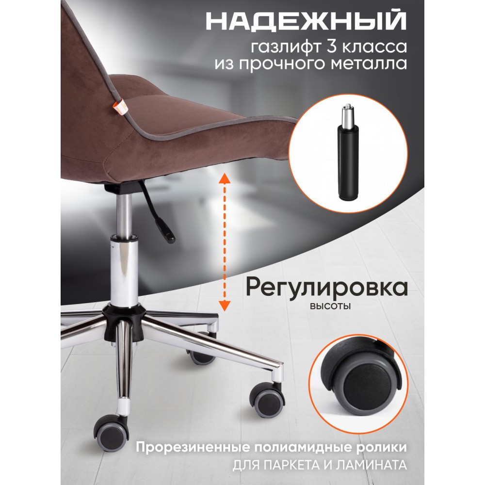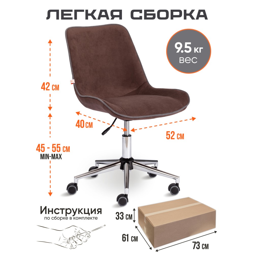 Яркое компьютерное кресло STYLE из коллекции OFFICE - идеальное сочетание практичности, функциональности и привлекательности. Модель прекрасно впишется в комнату школьника или в рабочий кабинет в офисе. Прочный каркас изготовлен из экологически безопасной и влагостойкой фанеры толщиной более 10 мм . Компьютерное кресло с мягким наполнителем из пенополиуретана стандартной плотности (до 35 кг/м2) обладает долгим сроком службы, не деформируется, пропускает воздух, не накапливает пыль. Модель регулируется по высоте при помощи надежного механизма. Хромированная крестовина изготовлена из металла, основательна, устойчива, выдерживает сильные нагрузки. Прорезиненные ролики из полиуретана с прорезиненными вставками отличаются плавным и тихим ходом, не повреждают напольное покрытие. Ролики и крестовина в креслах бренда TETCHAIR соответствуют стандарту BIFMA. Во всех креслах бренда TETCHAIR используются газлифты 3 класса, он способен выдерживать вес до 90 кг. Офисное кресло, обитое флоком или износостойкой высокопрочной экокожей с шерстью, не требует сложного ухода, выглядит стильно и оригинально. Экокожа, используемая при изготовлении кресла, выдерживает до 50 000 циклов на истирание по Мартиндейлу, ткань флок также выдерживает до 50 000 циклов. Ткани с прочностью более 35 000 циклов являются самыми долговечными. Мебель, в которой используются такие ткани можно использовать не только дома но и в ресторанах, салонах красоты, приемных. Элегантная модель STYLE представлена в сером, коричневом, бежевом, бордовом, оранжевом, розовом, синем, оливковом и розовом цветах. Эргономичное компьютерное кресло подчеркнет безупречный вкус владельца, будет радовать своей долговечностью, красотой и простотой в уходе продолжительное время. Офисный стул поставляется в разобранном виде. Необходима простая сборка по прилагаемой инструкции. Максимальная нагрузка 90 кг.