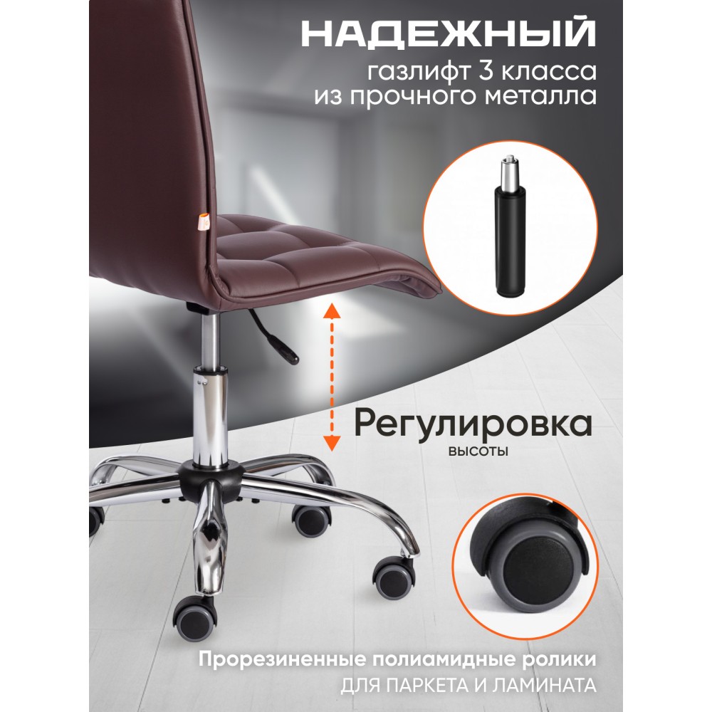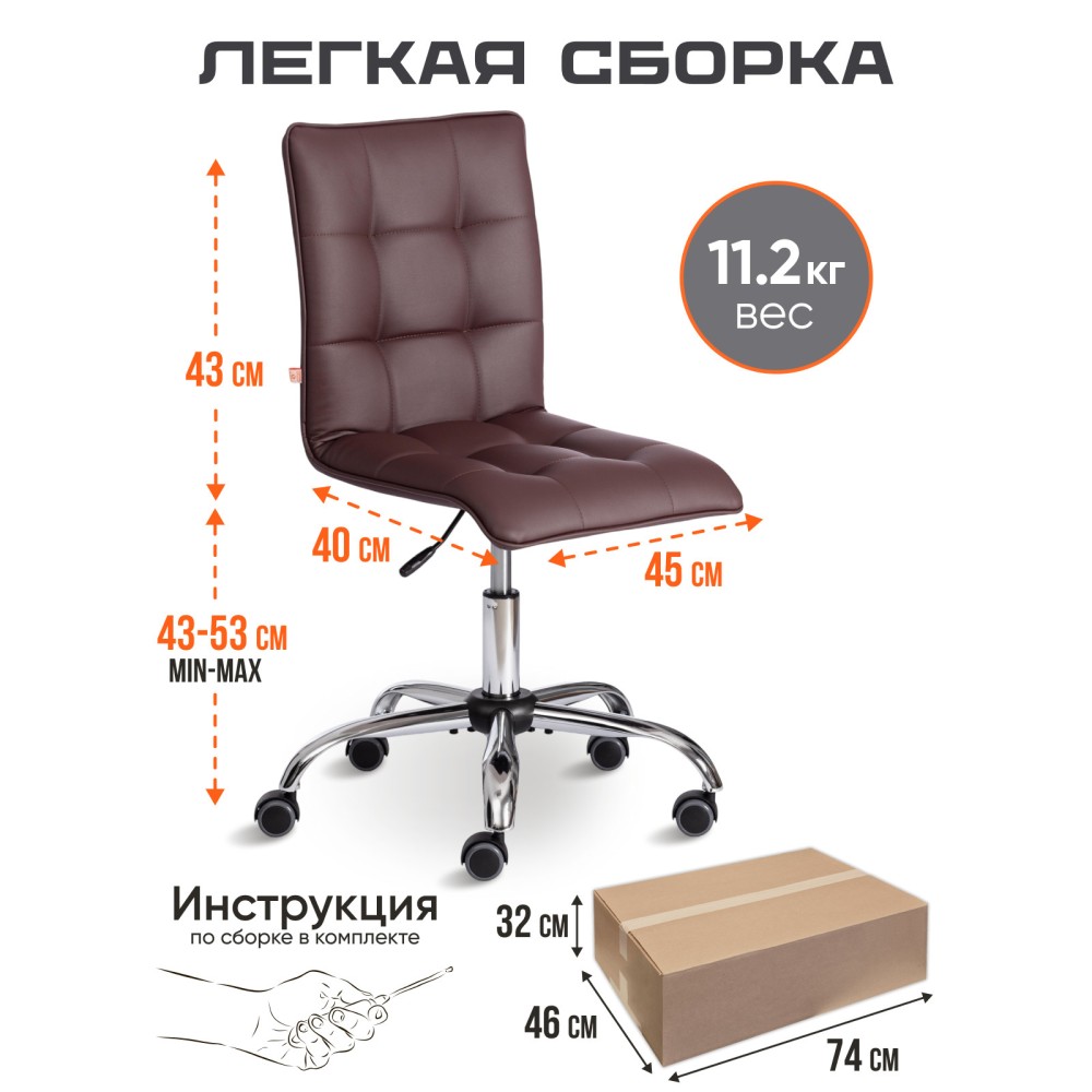 Эргономичная спинка, прочный каркас, мягкое сиденье компьютерного кресла ZERO из коллекции OFFICE - воплощение элегантности, практичности и оригинальности. Модель отлично подойдет как для комнаты школьника, так и для рабочего кабинета в офисе или дома. Каркас модели изготовлен из фанеры толщиной более 10 мм. Такой материал обладает отличными эксплуатационными качествами, прочен и долговечен. Сиденье кресла с мягким наполнителем из пенополиуретана стандартной плотности (до 35 кг/м2) не деформируется со временем, не накапливает пыль, хорошо пропускает воздух и отводит влагу, имеет долгий срок службы. В кресле установлен механизм плавной регулировки по высоте. Металлическая хромированная крестовина надежна, устойчива, способна выдерживать большие нагрузки. Полиуретановые ролики с прорезиненными вставками не шумят при передвижении кресла и не оставляют царапин на паркете или ламинате. Ролики и крестовина в креслах бренда TETCHAIR соответствуют стандарту BIFMA. Во всех креслах бренда TETCHAIR используются газлифты 3 класса, он способен выдерживать вес до 90 кг. при интенсивном использовании кресла. Рабочее кресло ZERO изготовлено из износостойкой высокопрочной экокожи, флока, велюра, а также из экокожи и сетки, ткани и сетки в нескольких вариантах: черном, коричневом, бежевом, сером, синем, бордовом, оливковом, розовом, горчичном, зеленом и белом цветах. Экокожа, используемая при изготовлении кресла, выдерживает до 50 000 циклов на истирание по Мартиндейлу, ткань флок также выдерживает до 50 000 циклов, ткань велюр выдерживает до 60 000 циклов. Ткани с прочностью более 35 000 циклов являются самыми долговечными. Мебель, в которой используются такие ткани можно использовать не только дома но и в ресторанах, салонах красоты, приемных. Элегантная модель не требует сложного ухода, практична, функциональна, обладает отличными эксплуатационными качествами, прослужит своему владельцу долгие годы. Кресло поставляется в разобранном виде. Необходима простая сборка по прилагаемой инструкции. Максимальная нагрузка 90 кг.