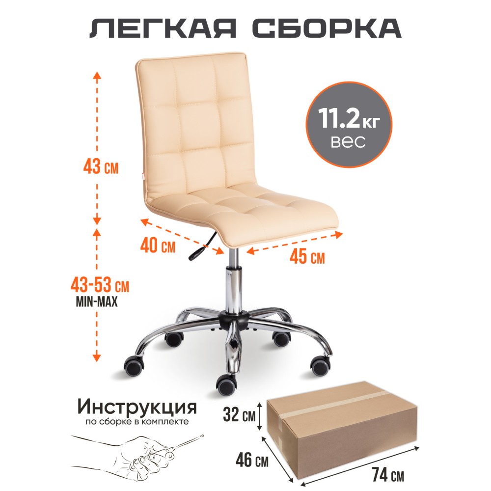 Эргономичная спинка, прочный каркас, мягкое сиденье компьютерного кресла ZERO из коллекции OFFICE - воплощение элегантности, практичности и оригинальности. Модель отлично подойдет как для комнаты школьника, так и для рабочего кабинета в офисе или дома. Каркас модели изготовлен из фанеры толщиной более 10 мм. Такой материал обладает отличными эксплуатационными качествами, прочен и долговечен. Сиденье кресла с мягким наполнителем из пенополиуретана стандартной плотности (до 35 кг/м2) не деформируется со временем, не накапливает пыль, хорошо пропускает воздух и отводит влагу, имеет долгий срок службы. В кресле установлен механизм плавной регулировки по высоте. Металлическая хромированная крестовина надежна, устойчива, способна выдерживать большие нагрузки. Полиуретановые ролики с прорезиненными вставками не шумят при передвижении кресла и не оставляют царапин на паркете или ламинате. Ролики и крестовина в креслах бренда TETCHAIR соответствуют стандарту BIFMA. Во всех креслах бренда TETCHAIR используются газлифты 3 класса, он способен выдерживать вес до 90 кг. при интенсивном использовании кресла. Рабочее кресло ZERO изготовлено из износостойкой высокопрочной экокожи, флока, велюра, а также из экокожи и сетки, ткани и сетки в нескольких вариантах: черном, коричневом, бежевом, сером, синем, бордовом, оливковом, розовом, горчичном, зеленом и белом цветах. Экокожа, используемая при изготовлении кресла, выдерживает до 50 000 циклов на истирание по Мартиндейлу, ткань флок также выдерживает до 50 000 циклов, ткань велюр выдерживает до 60 000 циклов. Ткани с прочностью более 35 000 циклов являются самыми долговечными. Мебель, в которой используются такие ткани можно использовать не только дома но и в ресторанах, салонах красоты, приемных. Элегантная модель не требует сложного ухода, практична, функциональна, обладает отличными эксплуатационными качествами, прослужит своему владельцу долгие годы. Кресло поставляется в разобранном виде. Необходима простая сборка по прилагаемой инструкции. Максимальная нагрузка 90 кг.