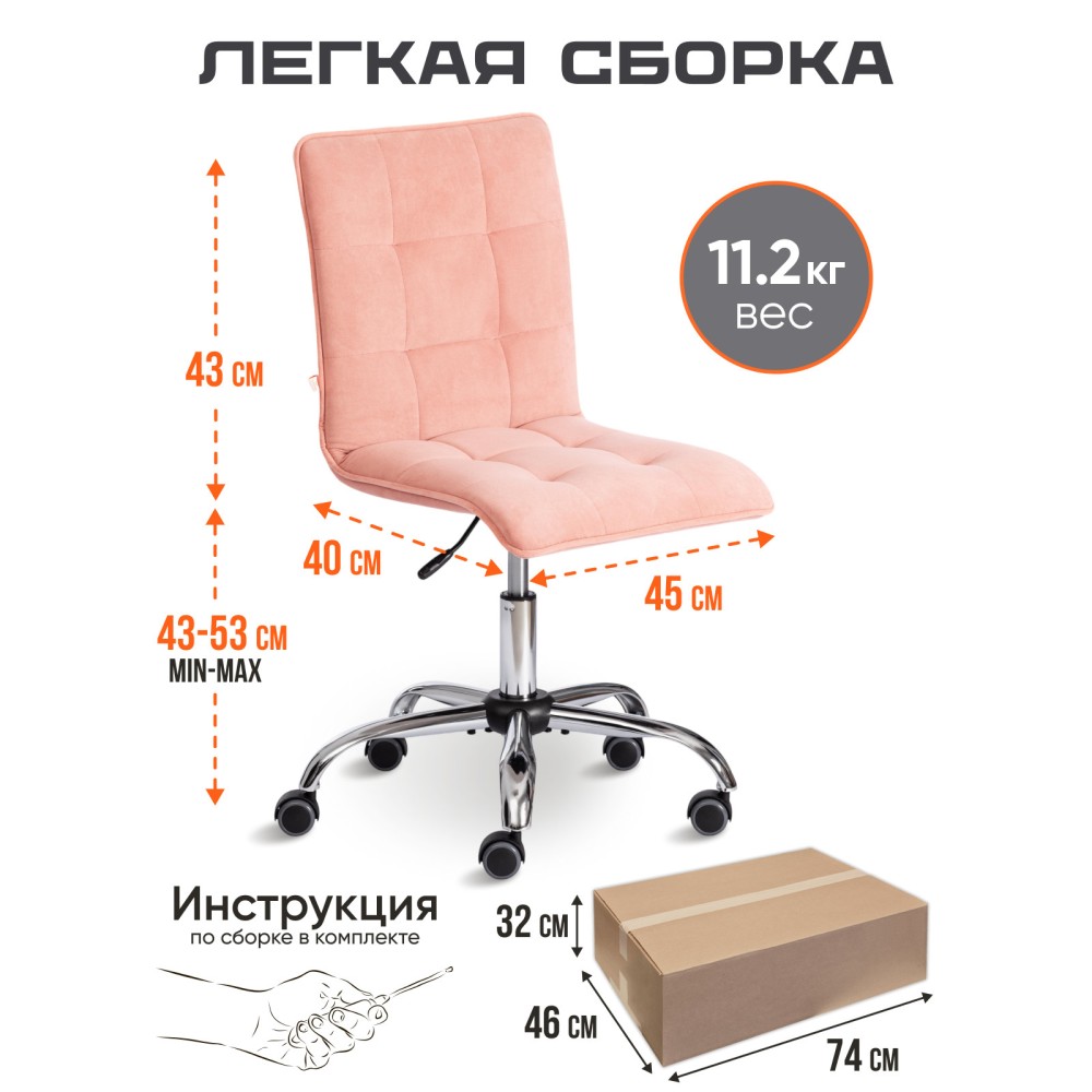 Эргономичная спинка, прочный каркас, мягкое сиденье компьютерного кресла ZERO из коллекции OFFICE - воплощение элегантности, практичности и оригинальности. Модель отлично подойдет как для комнаты школьника, так и для рабочего кабинета в офисе или дома. Каркас модели изготовлен из фанеры толщиной более 10 мм. Такой материал обладает отличными эксплуатационными качествами, прочен и долговечен. Сиденье кресла с мягким наполнителем из пенополиуретана стандартной плотности (до 35 кг/м2) не деформируется со временем, не накапливает пыль, хорошо пропускает воздух и отводит влагу, имеет долгий срок службы. В кресле установлен механизм плавной регулировки по высоте. Металлическая хромированная крестовина надежна, устойчива, способна выдерживать большие нагрузки. Полиуретановые ролики с прорезиненными вставками не шумят при передвижении кресла и не оставляют царапин на паркете или ламинате. Ролики и крестовина в креслах бренда TETCHAIR соответствуют стандарту BIFMA. Во всех креслах бренда TETCHAIR используются газлифты 3 класса, он способен выдерживать вес до 90 кг. при интенсивном использовании кресла. Рабочее кресло ZERO изготовлено из износостойкой высокопрочной экокожи, флока, велюра, а также из экокожи и сетки, ткани и сетки в нескольких вариантах: черном, коричневом, бежевом, сером, синем, бордовом, оливковом, розовом, горчичном, зеленом и белом цветах. Экокожа, используемая при изготовлении кресла, выдерживает до 50 000 циклов на истирание по Мартиндейлу, ткань флок также выдерживает до 50 000 циклов, ткань велюр выдерживает до 60 000 циклов. Ткани с прочностью более 35 000 циклов являются самыми долговечными. Мебель, в которой используются такие ткани можно использовать не только дома но и в ресторанах, салонах красоты, приемных. Элегантная модель не требует сложного ухода, практична, функциональна, обладает отличными эксплуатационными качествами, прослужит своему владельцу долгие годы. Кресло поставляется в разобранном виде. Необходима простая сборка по прилагаемой инструкции. Максимальная нагрузка 90 кг.