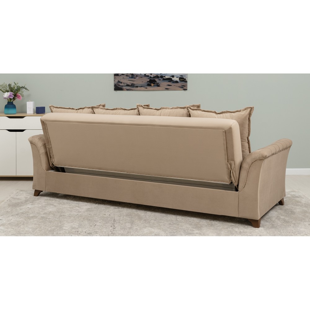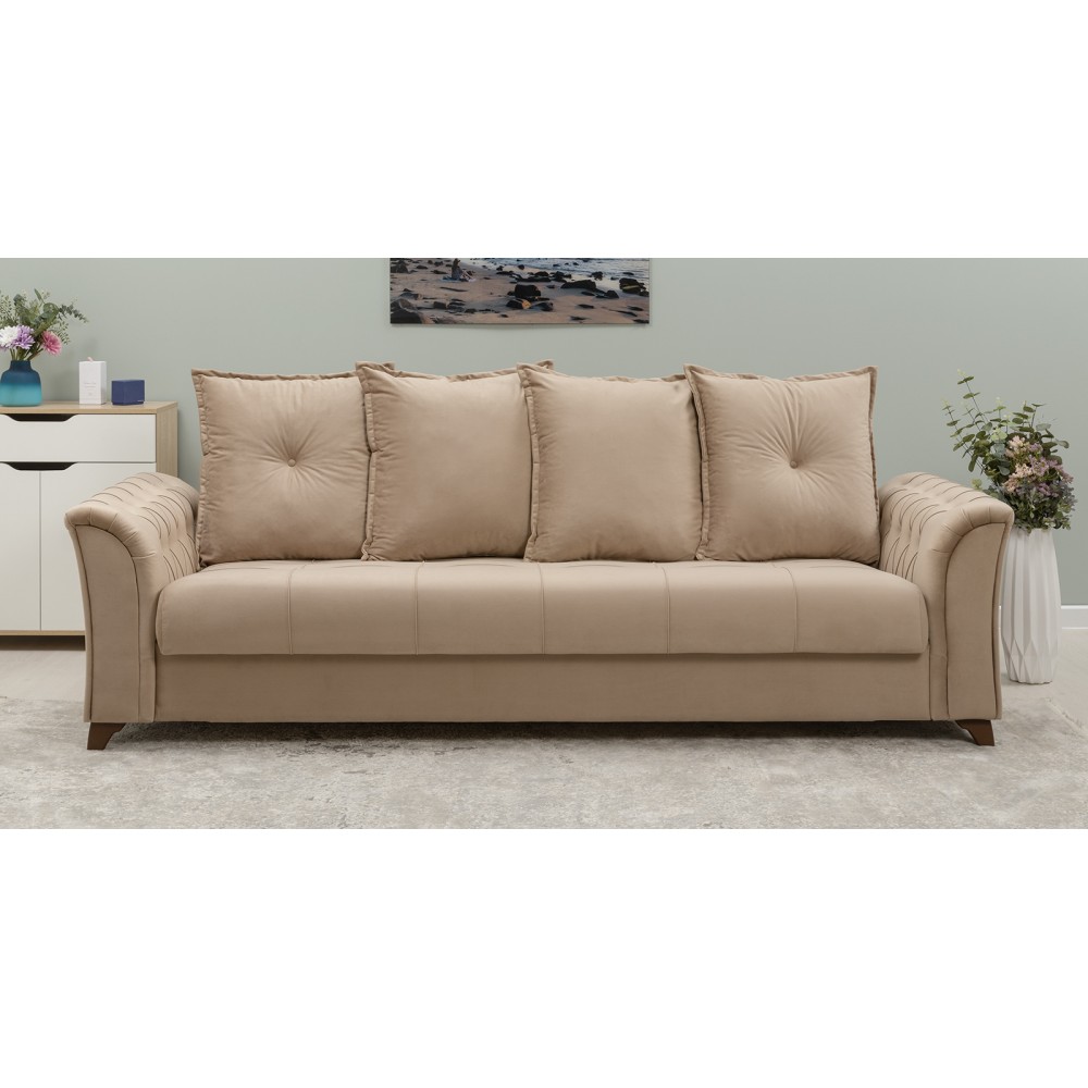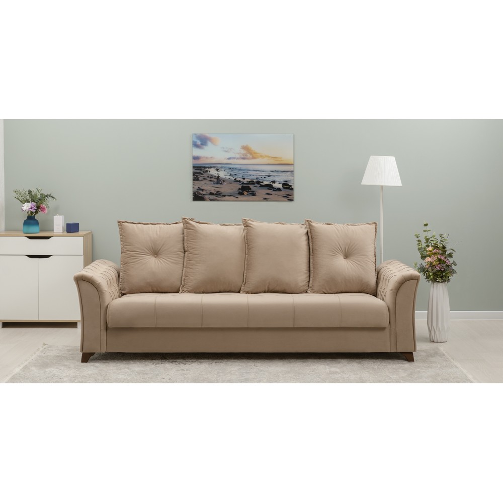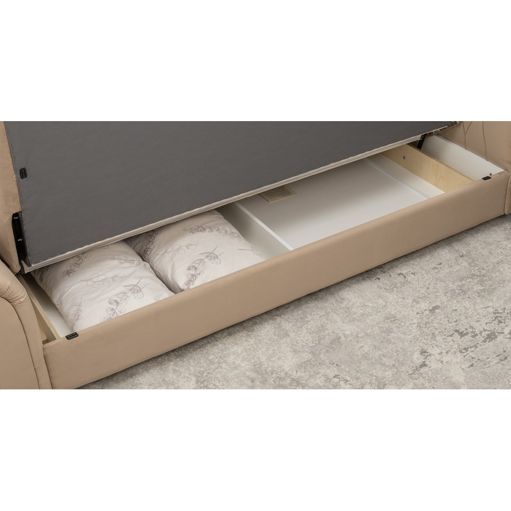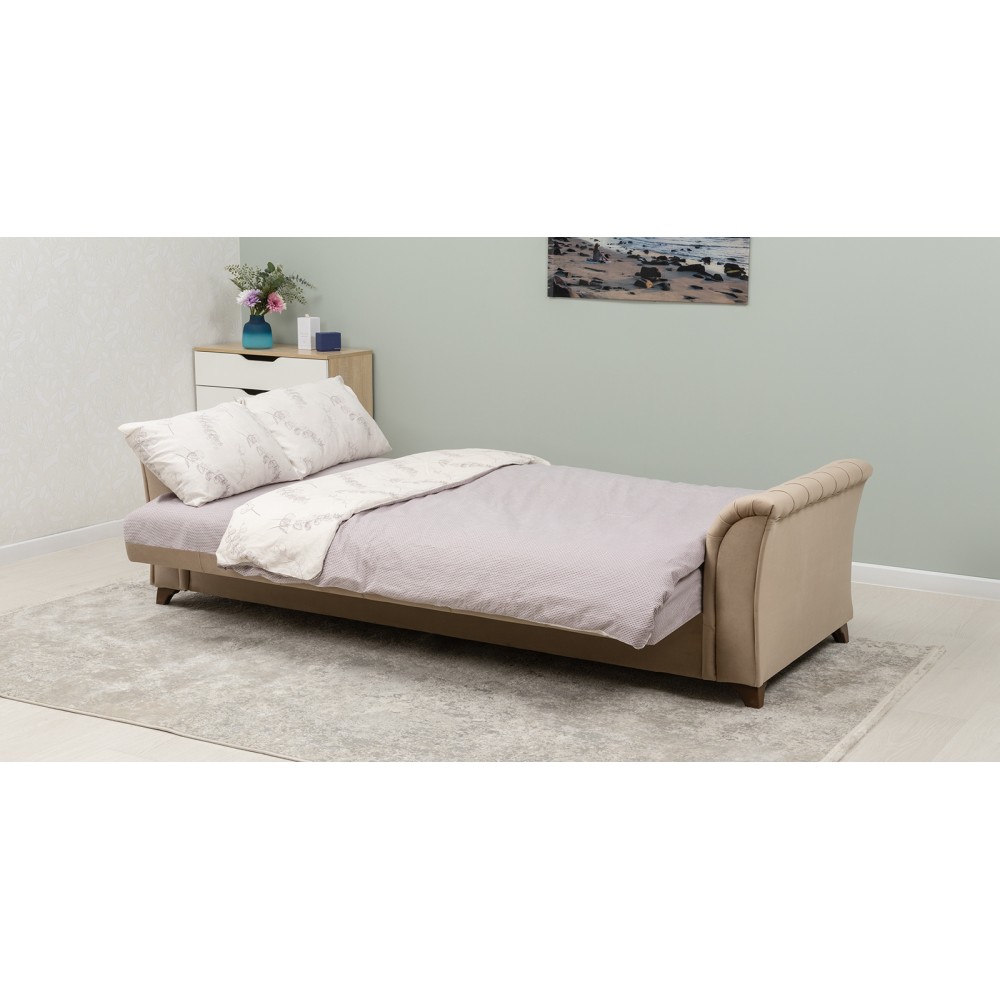 Обивка дивана-кровати выполнена из велюра Tenerife, состоящего из 100 % полиэстера. Велюр обладает объёмным густым ворсом, тактильной мягкостью и устойчивостью к зацепкам. Благодаря технологии бондинга Circle knitting волокна защищены от деформации, а устойчивость цвета к ультрафиолетовым лучам, сухому и мокрому трению гарантирует сохранение первоначального вида изделия на протяжении всего срока эксплуатации.