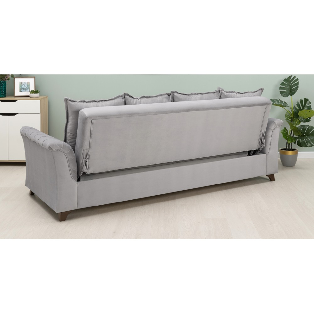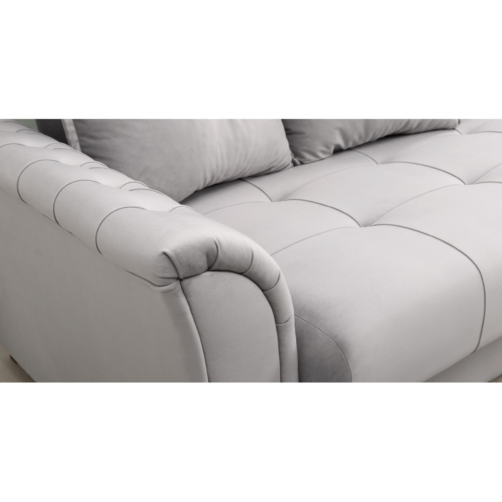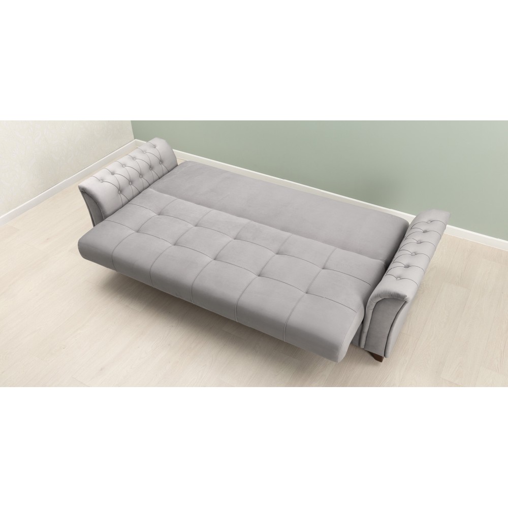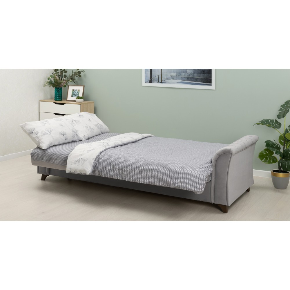 Обивка дивана-кровати выполнена из велюра Tenerife, состоящего из 100 % полиэстера. Велюр обладает объёмным густым ворсом, тактильной мягкостью и устойчивостью к зацепкам. Благодаря технологии бондинга Circle knitting волокна защищены от деформации, а устойчивость цвета к ультрафиолетовым лучам, сухому и мокрому трению гарантирует сохранение первоначального вида изделия на протяжении всего срока эксплуатации.