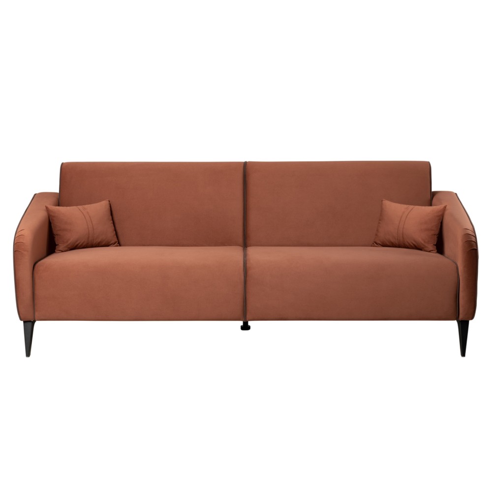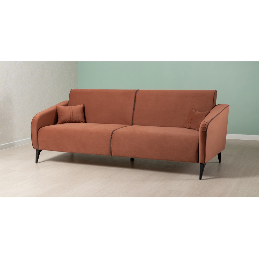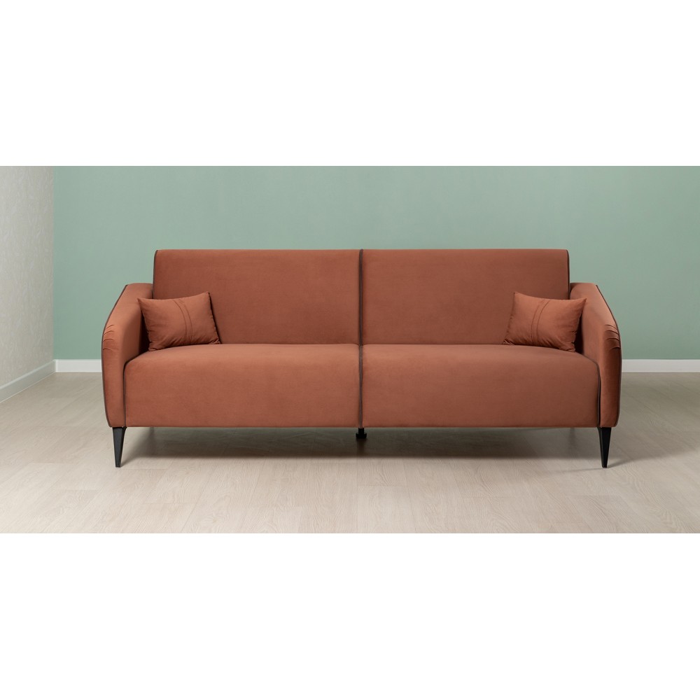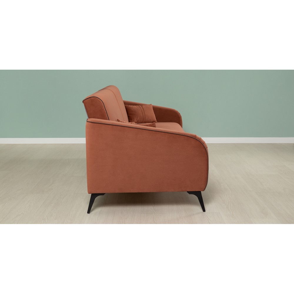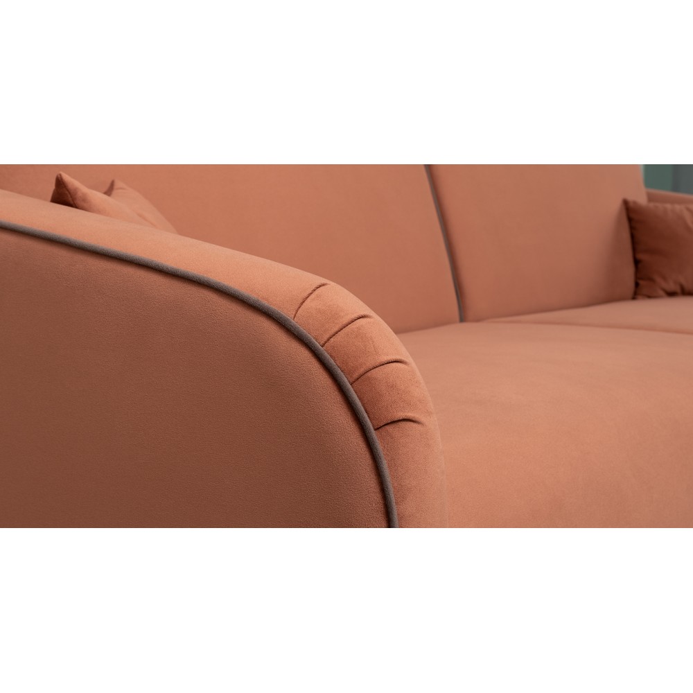 Обивка дивана выполнена из велюра — высококачественного материала, состоящего из 100 % полиэстера. Велюр обладает высокой износостойкостью, легко чистится и имеет средневыраженный «пальчиковый эффект», что обеспечивает долговечность и приятный внешний вид изделия.