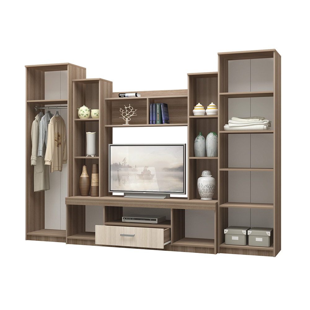 Она состоит из различных модулей, таких как полки, шкафы и место для телевизора.