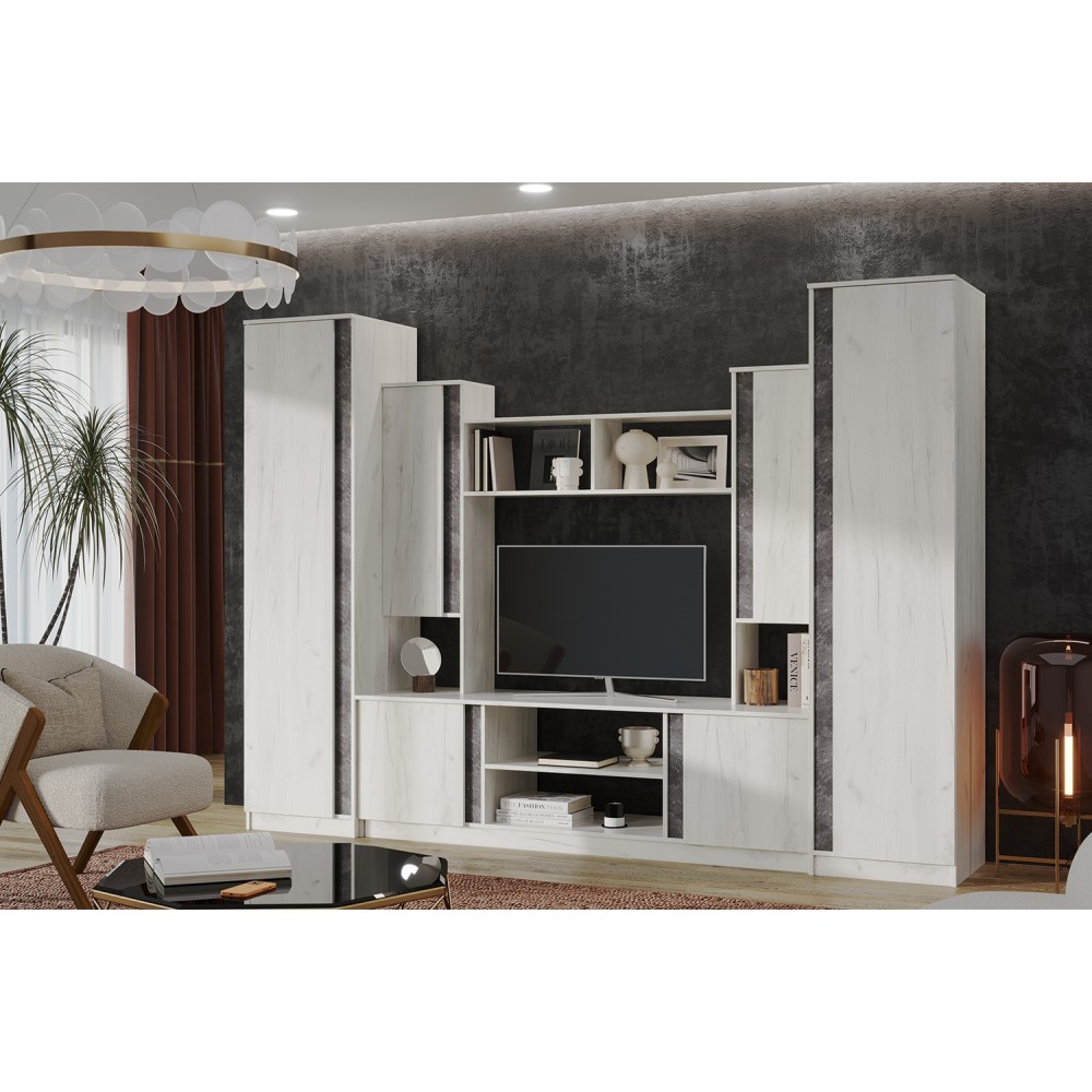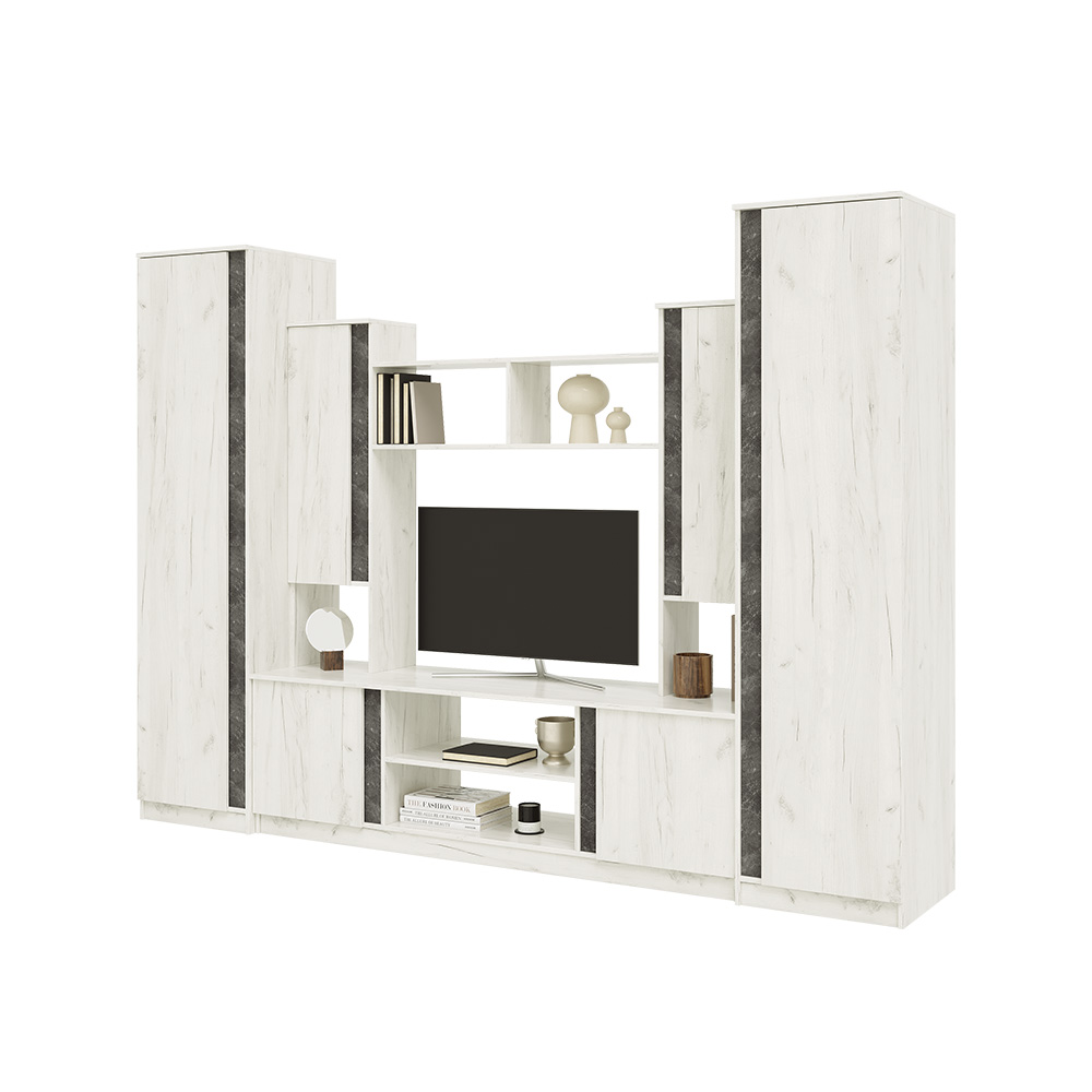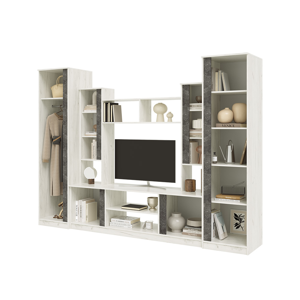 Она состоит из различных модулей, таких как полки, шкафы и место для телевизора.