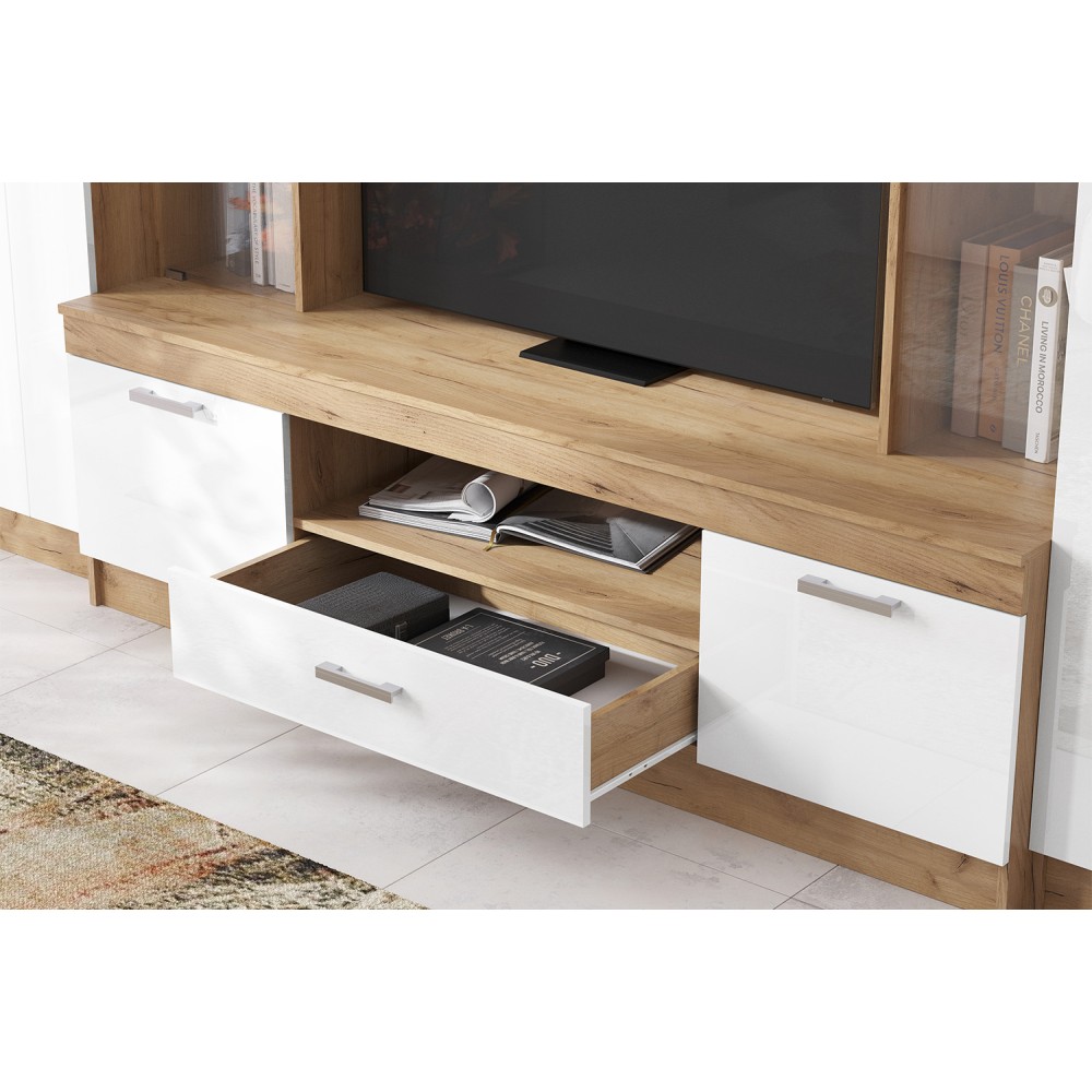 Она состоит из различных модулей, таких как полки, шкафы и место для телевизора.