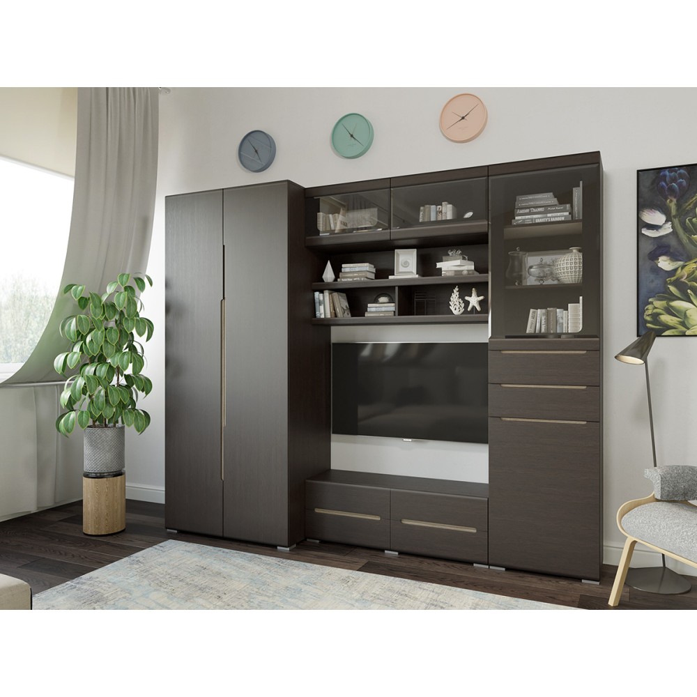 Гостиная Эколь - современная модульная система для стильного и удобного интерьера. Шкафы предлагают максимальное наполнение и удобство сборки. Боковые части изделий делают интерьер эстетичным, а шариковые направляющие ящиков обеспечивают комфорт использования.