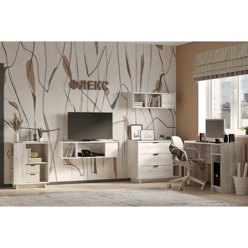 Напольные модули с притопленным цоколем обеспечивают удобство установки и позволяют избежать проблем с плинтусами. Благодаря этому гостиная ФЛЕКС станет идеальным местом для отдыха и релаксации, создавая гармоничную обстановку и поднимая настроение.