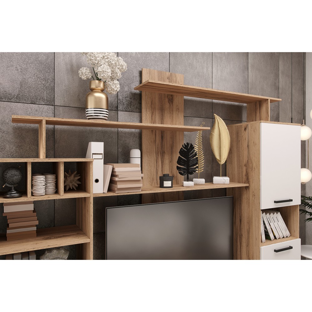 Она состоит из различных модулей, таких как полки, шкафы и место для телевизора.