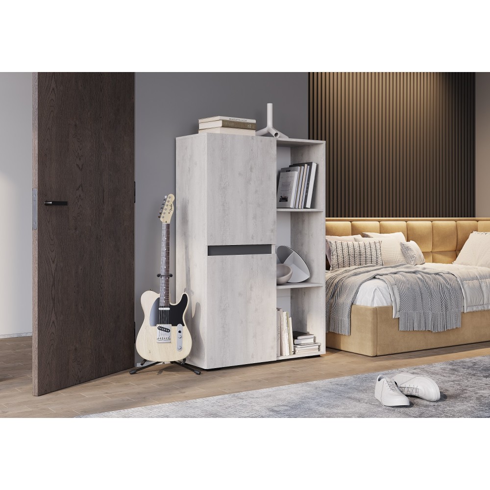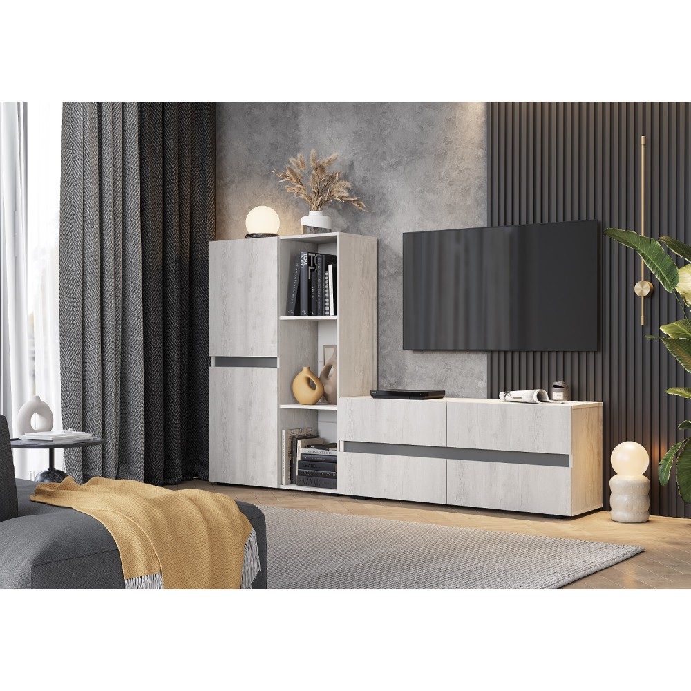 Современная компактная гостиная Мрия выполнена в трендовом цвете Бетон пайн светлый. Серия состоит из самого необходимого: тумба под ТВ, вместительные пеналы и открытая навесная полка, и позволит не загромождать комнату мебелью, а эффективно использовать пространство.