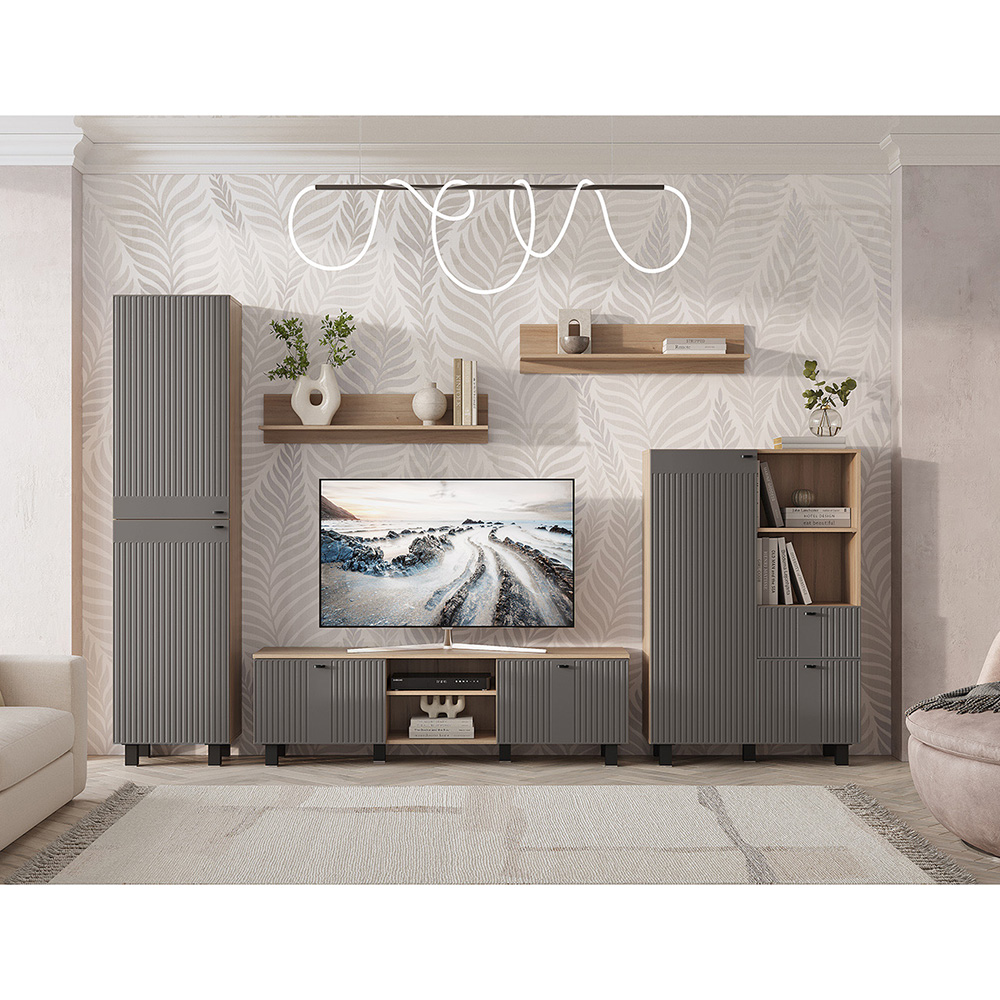 Гостиная из модульной серии Олива придаст вашему дому особый шарм, благодаря вертикальной фрезеровки на фасадах и корпусу в древесной гамме. Габариты и наполнение модулей позволят Вам собрать уникальный комплект, который будет гармонично смотреться в любой по площади гостиной и украшать ее интерьер, не загромождая пространство. Данный комплект состоит из широкой тумбы под телевизор, комода с открытыми секциями, шкафа-пенала и навесных полок.