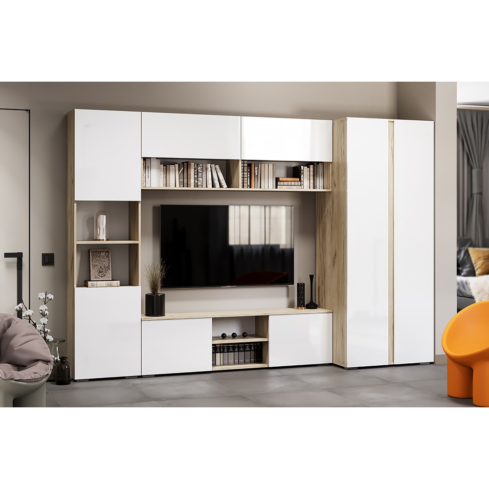 Модульная коллекция Вирола украсит вашу гостиную. Белые глянцевые фасады отлично сочетаются с корпусом в древесных оттенках. Лицевая фурнитура отсутствует, фасады открываются с помощью захвата рукой