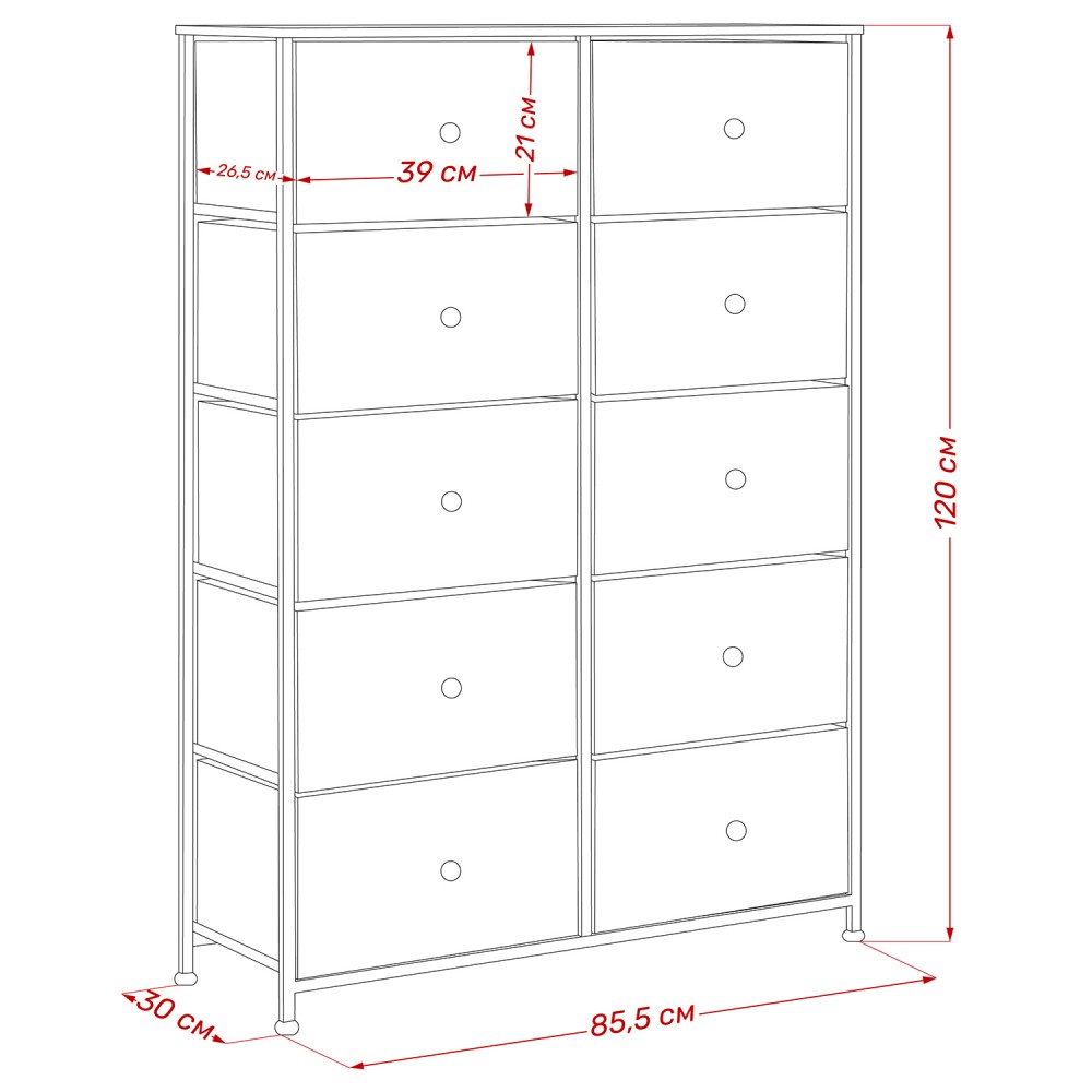 Комод Leset Линкс с десятью ящиками — это отличный выбор для организации хранения в любом помещении. Каркас комода выполнен из профильной стальной трубы 14x14, что обеспечивает прочность и долговечность конструкции. Полки и фасады ящиков изготовлены из МДФ, благодаря чему комод выглядит стильно и современно. Ящики выполнены из нетканого материала спанбонд и картона, обеспечивая лёгкость и удобство использования. Размеры каждого ящика составляют 390x265x210. Комод Leset Линкс станет не только функциональным, но и элегантным дополнением к вашему интерьеру.