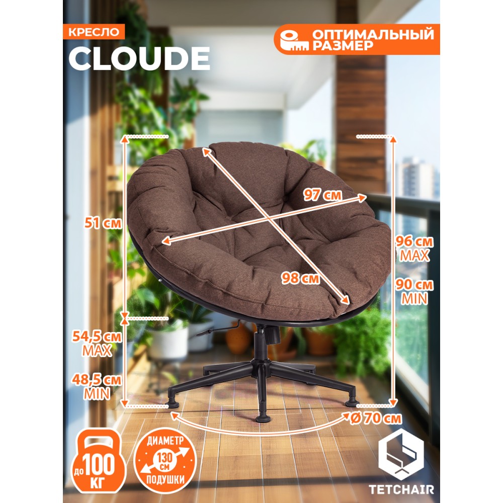 Кресло Cloud/Клауд из коллекции Уютный дом – оригинальное решение для создания стильного, современного интерьера в вашем пространстве. Привлекательная модель будет прекрасно смотреться не только на веранде или террасе загородного дома, но также в гостиной, столовой или студии. Надежный металлический каркас, газлифт 3 класса, устойчивая крестовина, комфортное сиденье, современный дизайн – кресло придется по душе даже самым требовательным владельцам. Модель вращается в любом направлении, регулируется по высоте специальным рычагом и оснащена механизмом качания. В комплект входит небольшая подушка сиденья для лучшего комфорта, которая крепится к каркасу, и мягкое вместительное сиденье. Такое сочетание позволяет расположиться максимально удобно и расслабиться после напряженного дня. Подушки коричневого цвета, изготовлены из современной, модной ткани рогожка, она устойчива к износу и загрязнениям, не деформируется при активном использовании, не требуют специального ухода. Элегантное кресло из коллекции Уютный дом практично и функционально, удивит вас своей долговечностью и надежностью, станет ярким и необычным акцентом в вашем доме, добавляющим выразительность, уют и индивидуальность интерьеру. Максимальная нагрузка 120 кг.