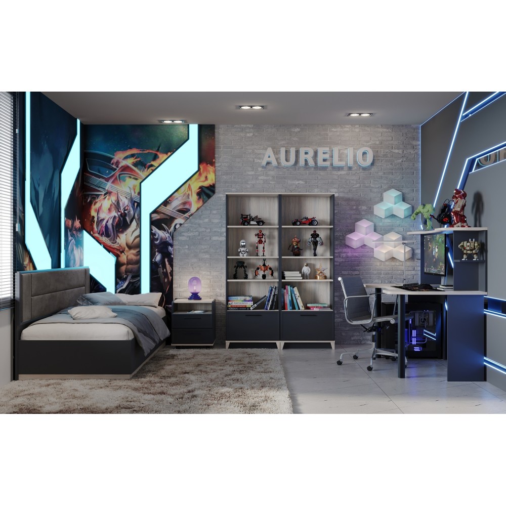 Молодёжная выполнена в одном стиле со всей коллекцией AURELIO. Фасады толщиной 10 мм из ЛДСП класса эмиссии Е1 обрамлены тонким фигурным профилем МДФ. Корпус выполнен из ЛДСП 16 мм. Задняя стенка шкафов в древесном декоре станавливается в паз и обеспечивает дополнительную устойчивость и аккуратный вид мебели. Мягкие подушечки кроватного изголовья укутаны в шелковистый на ощупь велюр благородного серого оттенка. Дополняет изголовье элегантный профиль. Подъемный механизм кровати открывает доступ к вместительному