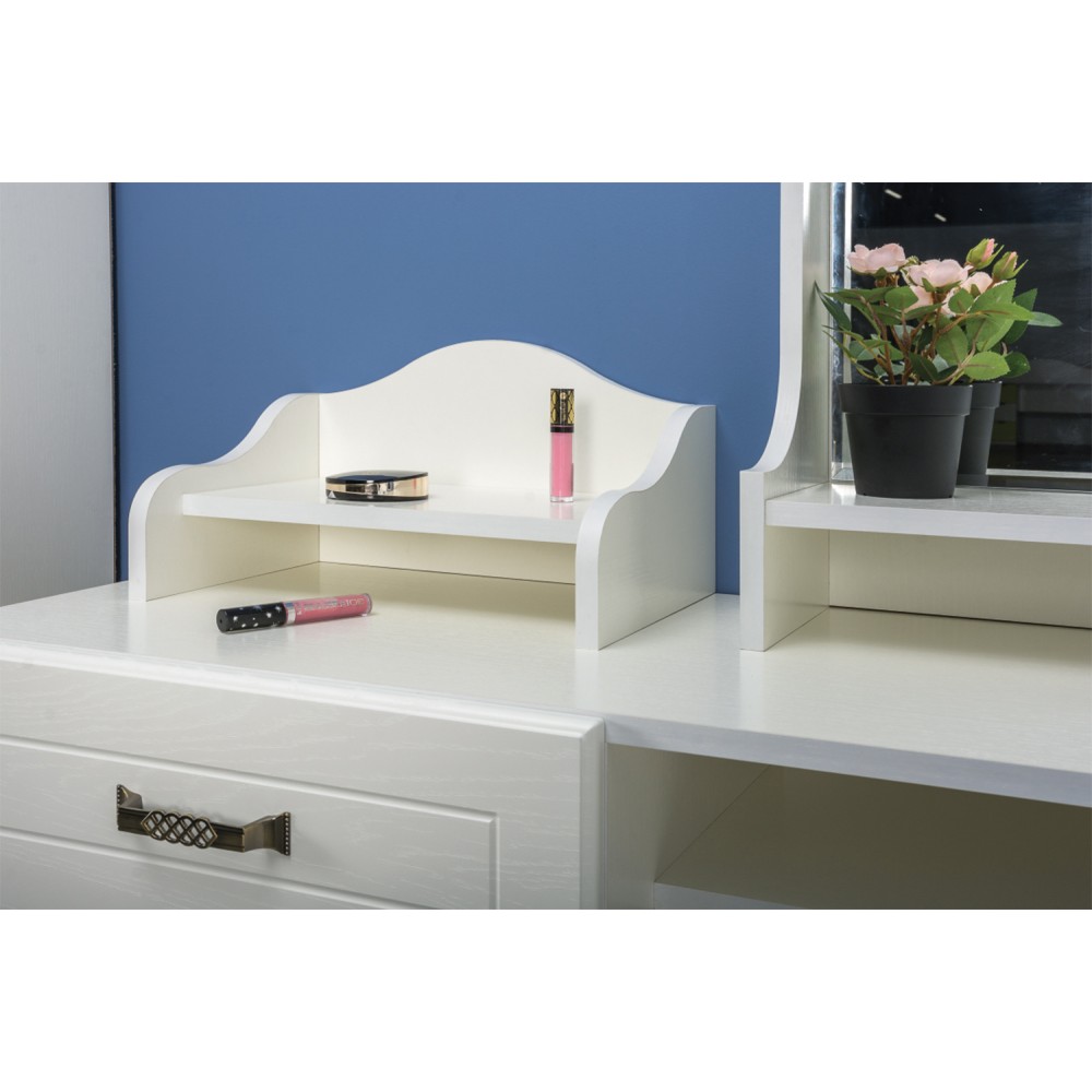 Полка настольная Ливерпуль - это декоративный элемент системы хранения. Миниатюрная полочка с изящными фигурными стеночками - оригинальное дополнение уголка красоты в Вашей спальне или прихожей. Выполнена из ламинированной ДСП 16 мм., фасад - МДФ с глубокой фрезеровкой. Поставляется в разобранном виде, с комплектом фурнитуры, упакованная в 4-х слойный гофрокартон.
