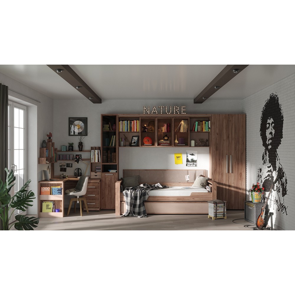 Организовать хранение в комнате подростка поможет вместительный навесной шкаф Натура 81. Навесной шкафчик шириной 2241 мм с двумя открытыми отделениями и тремя за стеклянными тонированными фасадами. Стеклянные полки выдерживают до 2 кг каждая. Шкаф декорирован составным карнизом в стилистике всей молодежной коллекции Натура. Уместно дополнит компоновку с навесным шкафчиком Натура 80 Кровать подростковаяили Натура 84 Cтол письменный. К шкафу можно докупить модуль АДЕЛЬ 87 Подсветка. В комплект не входит. Подсветка предусмотрена в каждое отделение поштучно.Если необходимо установить подсветку за стеклянными дверками - необходимо приобрести 3 подсветки.