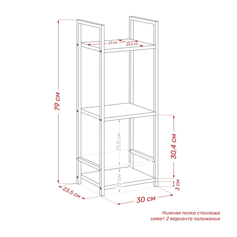 Простой и стильный стеллаж Leset Стилвуд с тремя полками — надежный помощник в доме и офисе. Каркас выполнен из металлического профиля 1,5 см (толщина 0,1 см) с прочным порошковым покрытием: устойчив к коррозии и сколам, держит форму. Полки из ЛДСП 1,6 см — лёгкий уход, устойчивость к царапинам, каждая выдерживает до 20 кг. Нижняя полка имеет возможность крепления на разных высотах, поэтому стеллаж легко подстроить под книги, технику или корзины. Маленькая плоская упаковка — легко нести в руках и удобно хранить до сборки. Универсальный минималистичный дизайн с открытой рамой встраивается в любой интерьер; доступно 4 декора полок: чёрный, дуб крафт, орех и белый, а каркас — в белом или чёрном. Практично, надёжно и аккуратно.